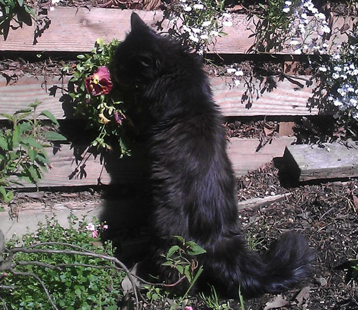 Bentley also likes to eat my pansies. His first time outside, he walks outside to my garden and start to eat all the pansies off one of my plants. Silly kitty! Oh, he loves toes. He flops down all cute like on our feet and then starts chewing on our toes and as soon as you move, he attacks.