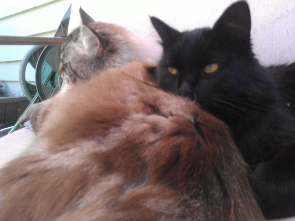 Bentley, yes that is his name, is doing great! It is amazing.....the 3 cats and 2 dogs all get along great. We are truly blessed. Bentley and Remington like to play with each other rolling around, wrestling, chase, etc. It is funny though because it is quiet play, they don't make any verbal noises. Tank and Bentley like to play together on the roof and climb together. When we are in the front yard, often times all 3 cats are there playing around or laying around together. It is very cute. Bentley and Winston, our miniature schnauzer, love to play chase in the back yard. They take turns on who is the chaser.