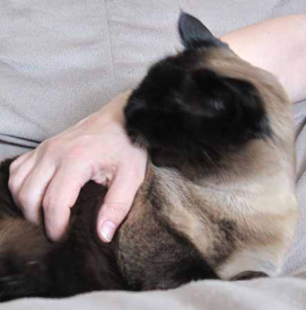 After several days of successful petting sessions, you can gradually increase the length of time for the sessions – add 20 or 30 seconds each day or two so she learns to tolerate gradually longer sessions. If she does get overstimulated and bite, say “No bite!” and gently remove your hand and end the petting session; go back to the shorter length for a few more days before gradually increasing the time again.