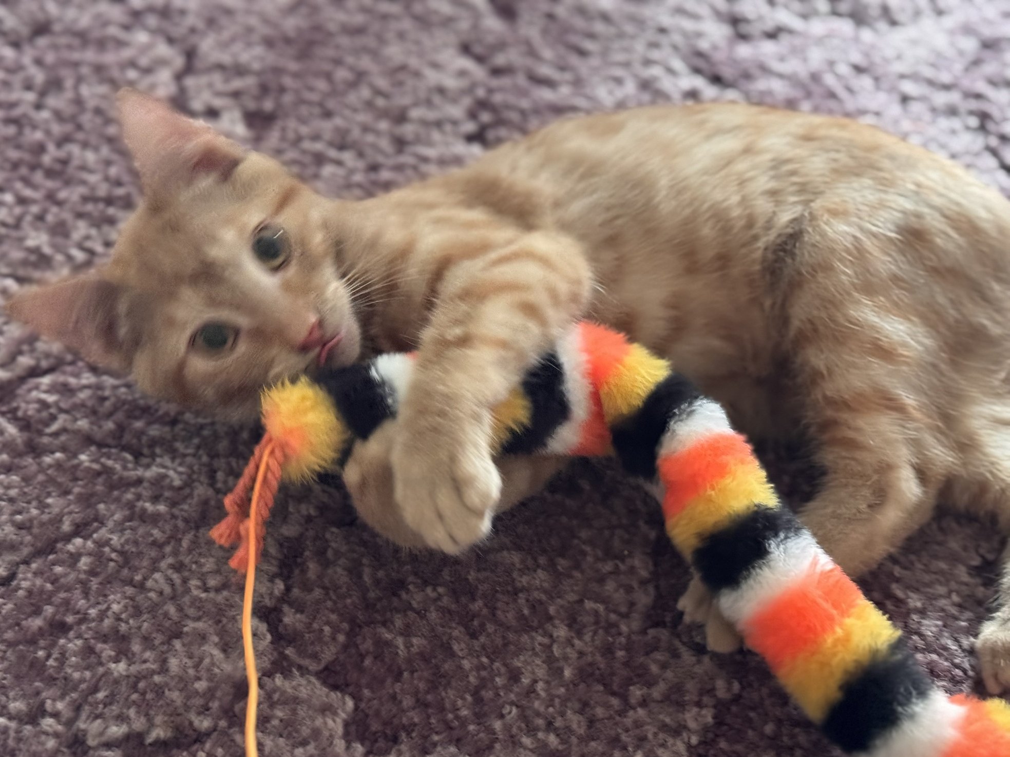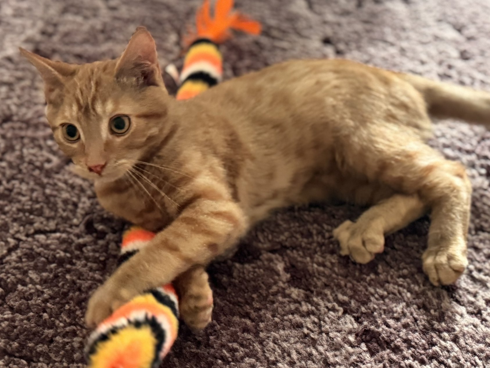 Please do not call the shelter; do the application first. Introducing the Cheese Litter of kittens! This group, with an estimated birth date of 5/30/25, came to us as part of a feral colony on which we did Trap-Neuter-Return. We have all of them in foster homes to help them continue their socialization; as they become ready for adoption, we are moving them from Coming Soon to Available! The group includes: CHEDDAR - male orange tabby - one of the most outgoing, ready for a new home! MOZZARELLA - female buff tabby - ALREADY ADOPTED AND THRIVING FETA - female buff tabby - ADOPTION PENDING BRIE - female orange tabby - still a bit shy but making good progress COLBY - male buff tabby - still shy, working on it CAMEMBERT - female orange tabby - making great strides, could go now to a patient home, will be the next one moved to Available for sure. This is Cheddar's listing, with a video and photos sent directly from his foster mom. While he still would likely prefer to avoid toddler birthday parties and keggers, he is definitely ready for a calm and loving family to call his own. Great with other cats, of course! We'd love to see all kittens go to homes that have another young, playful kitten, or to send 2 of them out as a pair (which gives you a great pair discount rate), but we do not require pair adoptions. If you prefer to adopt just one, and you don't have a similarly aged kitten at home already, please read our information on Single Kitten Syndrome. Then, when you apply for a single kitten, please let us know in the "Comments" field how you plan to deal with the "kitten crazies." All pets arrive spayed/neutered, dewormed, microchipped and vaccinated. Adoption fee for Cheddar is a suggested minimum of $75 (more gratefully accepted). All pets are placed with a 30-day money-back trial period, to give pet and family enough time to discover any unknown allergies or other conflicts. Can't come to Republic? Don't let that stop you! We have monthly transports to the Seattle area, delivering adopted pets to their new owners. If you can add a little to your donation to help us cover our volunteer driver's expenses, that would be great!