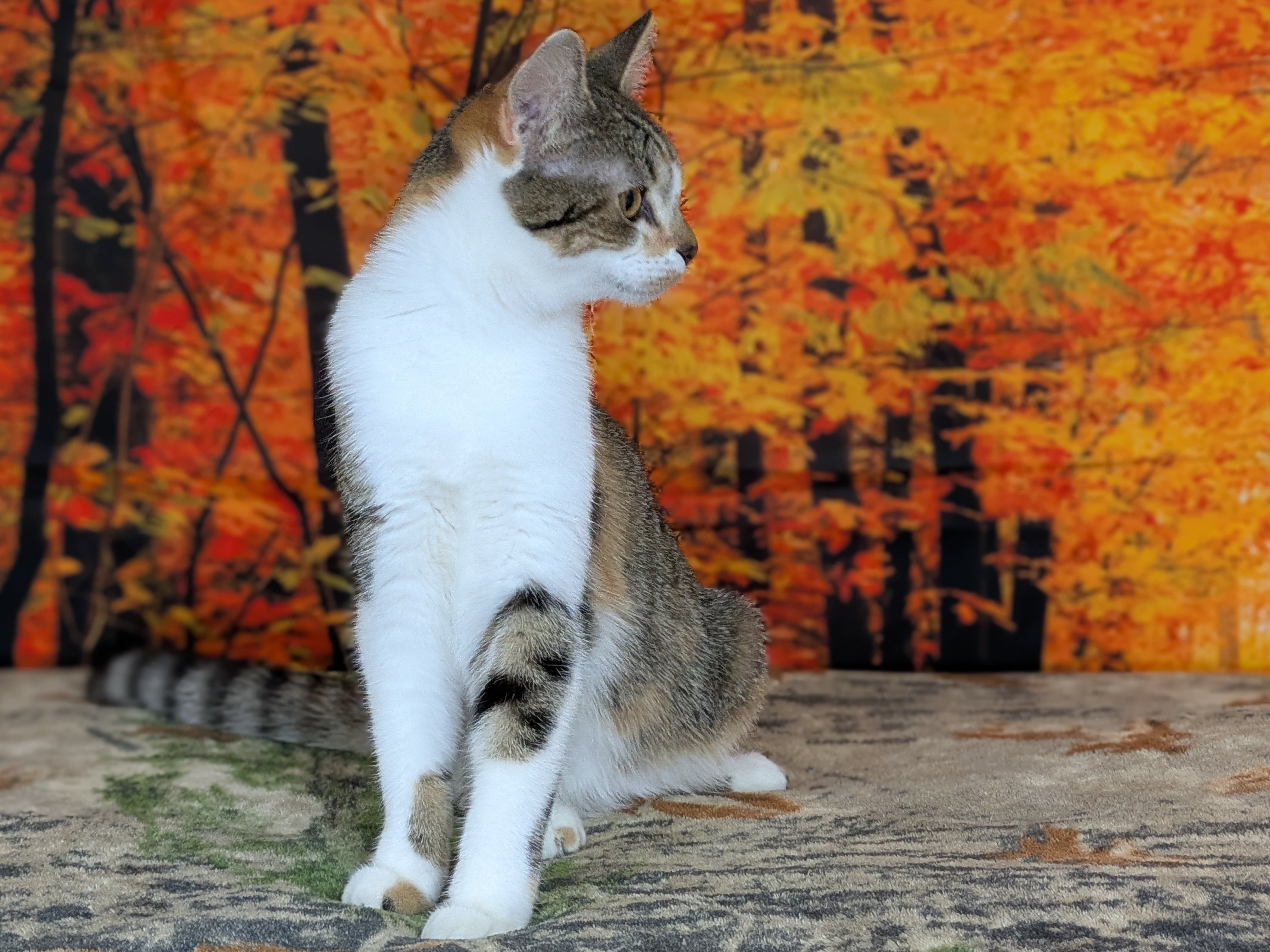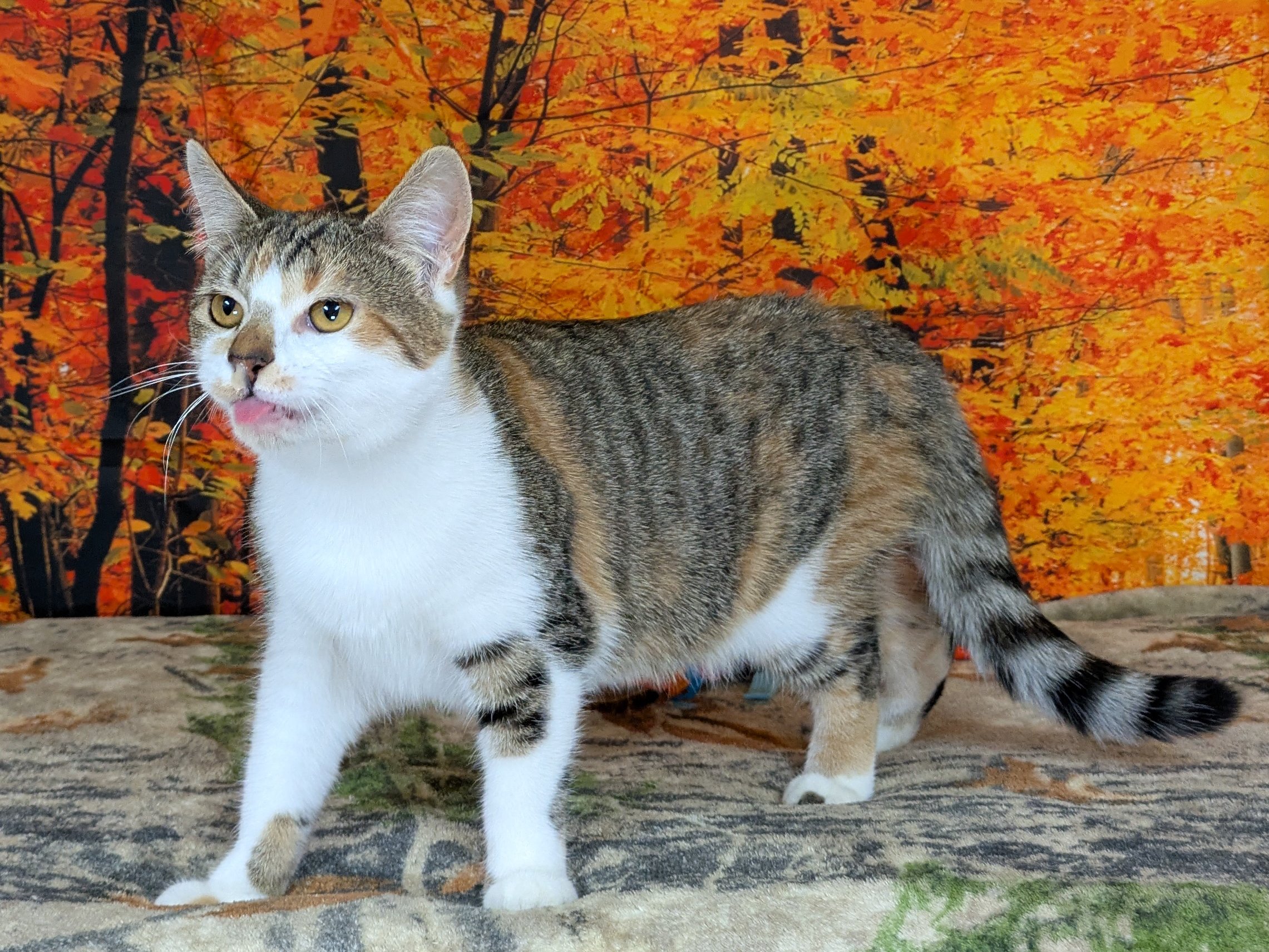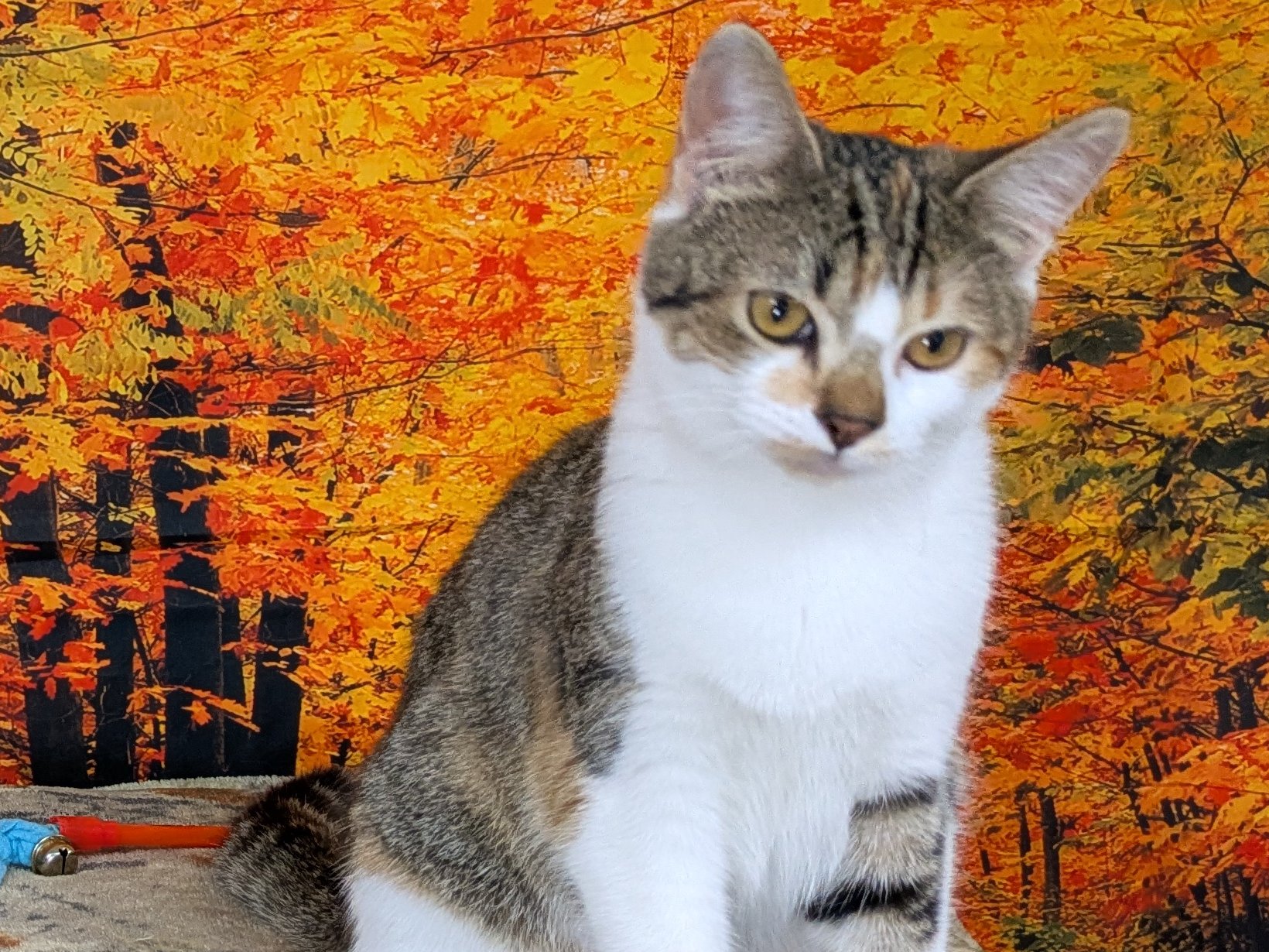 Please do not call the shelter; do the application first. Introducing Joplin, a shorthaired tabico (calico patterned tabby) and white girl, born about 4/30/25, who arrived as a stray. Joplin has been cuddly and playful during her time at the shelter. She went out for a trial adoption, where something just didn't work for her and she spent 2 weeks hiding before being returned. Since coming back, our cuddly, playful girl is back to herself. She may just be a particularly sensitive kitty who needs a full 30-day adjustment period before feeling comfortable in her new home. Please give her the chance to blossom, and you'll have a magnificent companion for life. She is sharing her room with Romaine, Colby, Brie, Camembert, and Coal, so it will be easy to mix-and-match kittens into any pair you want, should you decide you'd like two! Joplin has fabulous pouncing and leaping skills and looks forward to eradicating any and every wand toy infesting your household. All pets arrive spayed/neutered, dewormed, microchipped and vaccinated. Adoption fee for Joplin is a suggested minimum of $60 (more gratefully accepted). All pets are placed with a 30-day money-back trial period, to give pet and family enough time to discover any unknown allergies or other conflicts. Can't come to Republic? Don't let that stop you! We have monthly transports to the Seattle area, delivering adopted pets to their new owners. If you can add a little to your donation to help us cover our volunteer driver's expenses, that would be great!