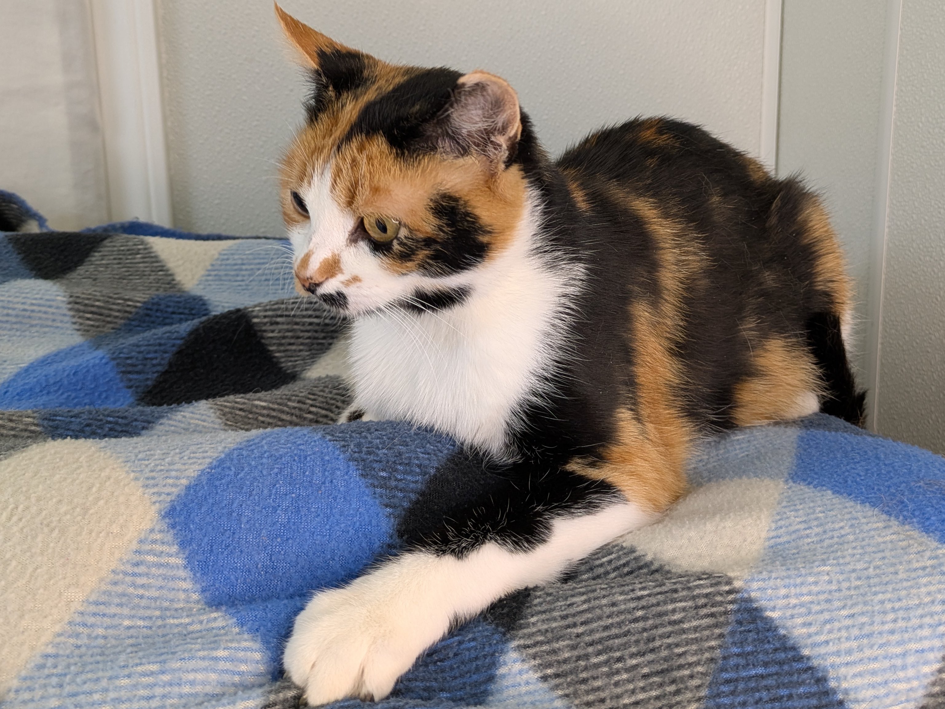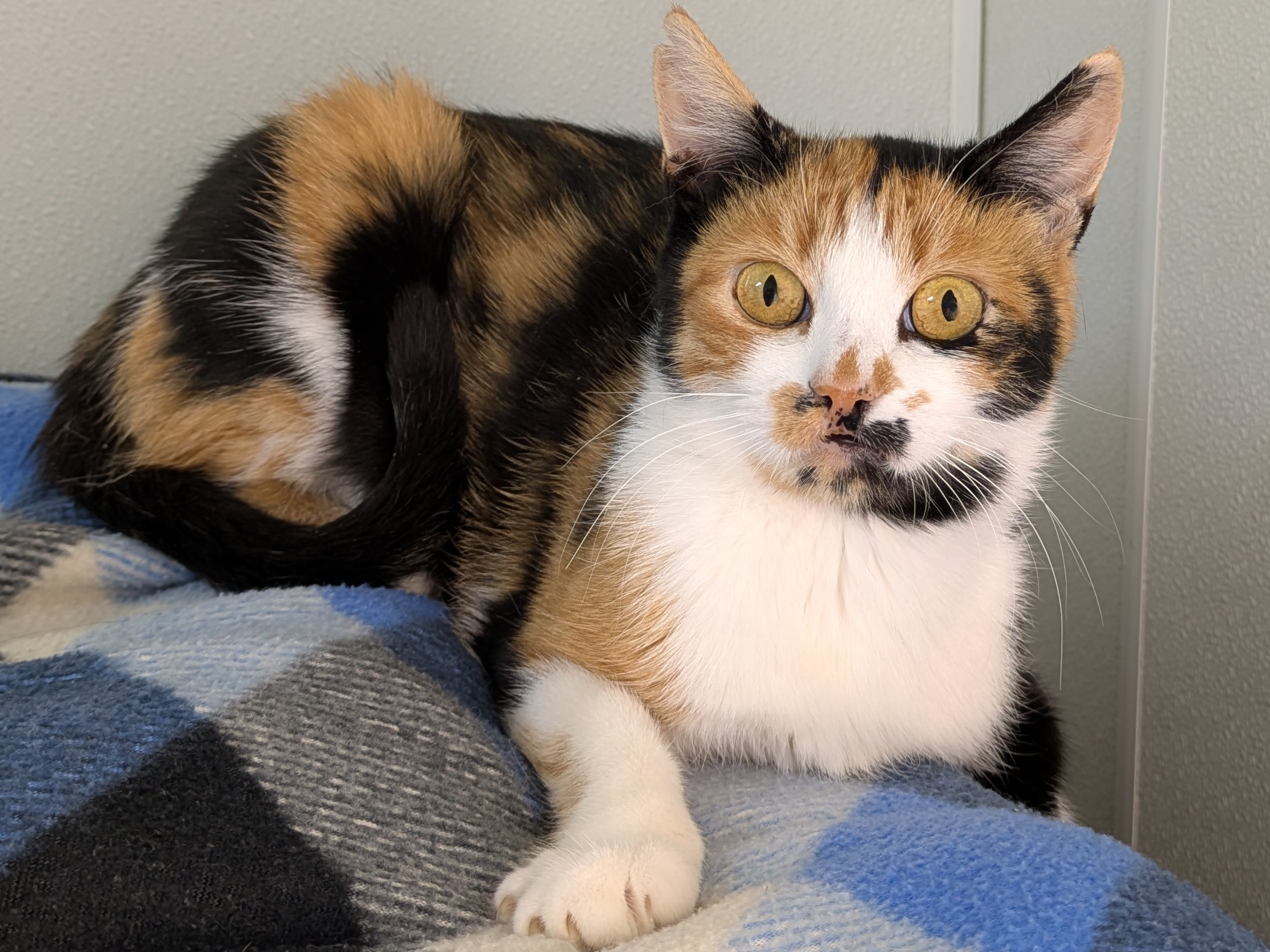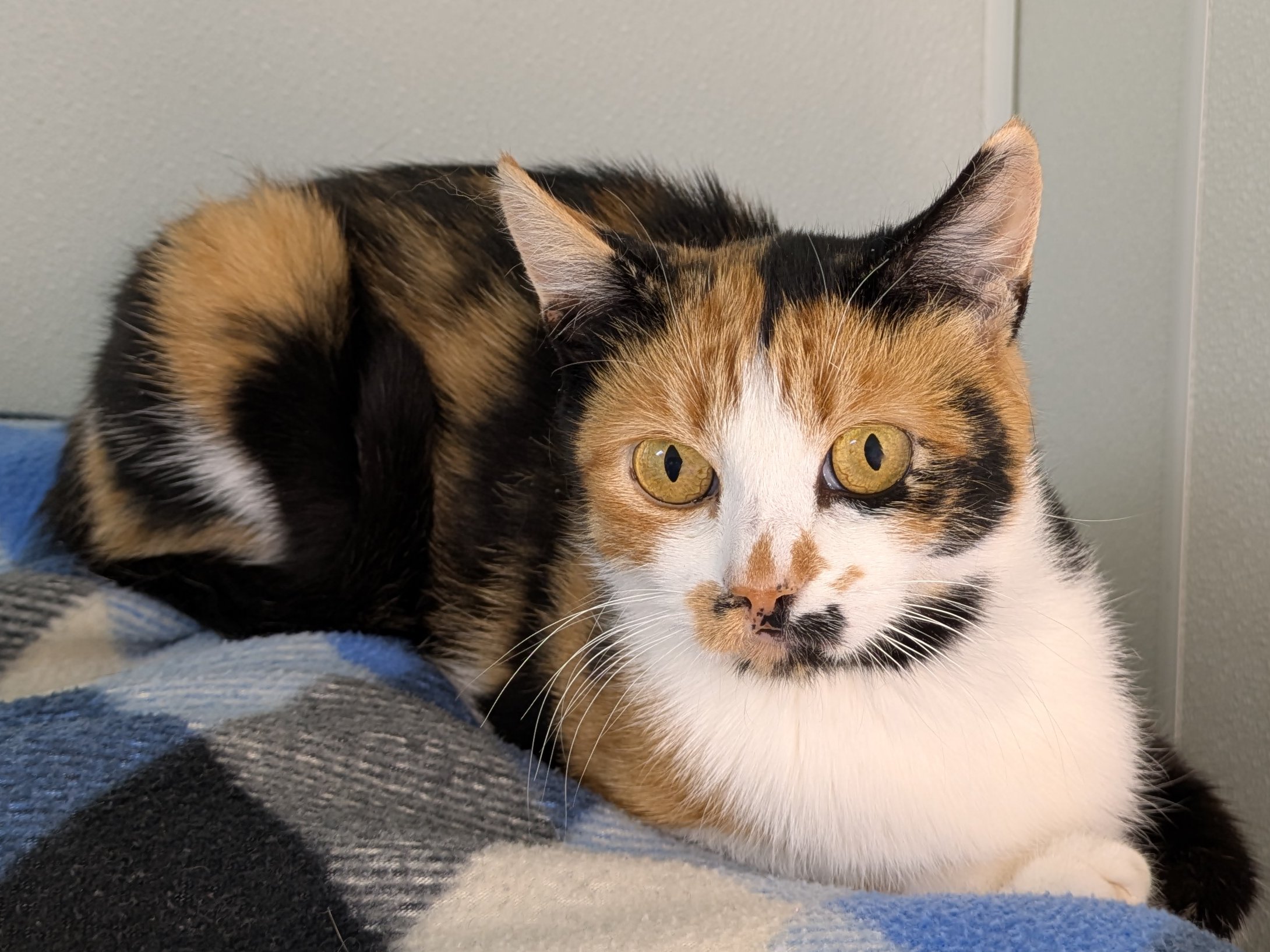 Please do not call the shelter; do the application first. Kalispell arrived as a stray in mid-August, and gifted us with five adorable kittens just a couple of weeks later! Now it's time for Kalispell and her babies to all find forever homes. Kalispell is a lovely calico girl. She seems to be a young adult, so we've estimated her date of birth as 8/1/24. We haven't tested her with other cats or dogs yet, as she and her little family were bonding in their own space. We'll update as soon as we have more info on this beautiful girl! Video Coming Soon All pets arrive spayed/neutered, dewormed, microchipped and vaccinated. Adoption fee for Kalispell is a suggested minimum of $50 (more gratefully accepted). All pets are placed with a 30-day money-back trial period, to give pet and family enough time to discover any unknown allergies or other conflicts. Can't come to Republic? Don't let that stop you! We have monthly transports to the Seattle area, delivering adopted pets to their new owners. If you can add a little to your donation to help us cover our volunteer driver's expenses, that would be great!