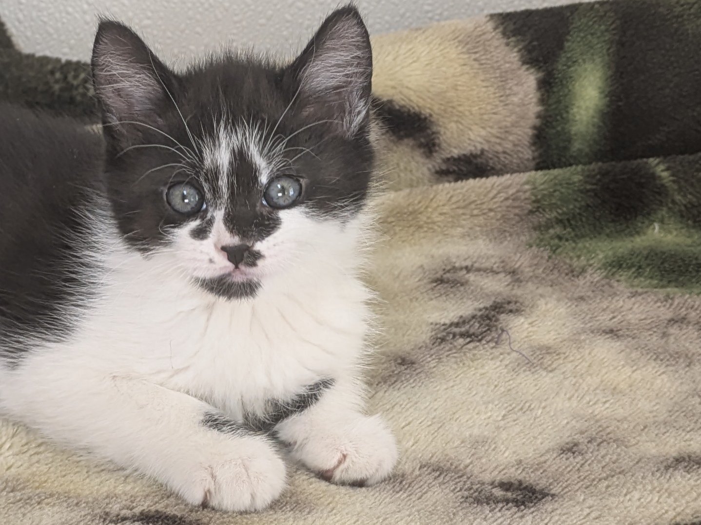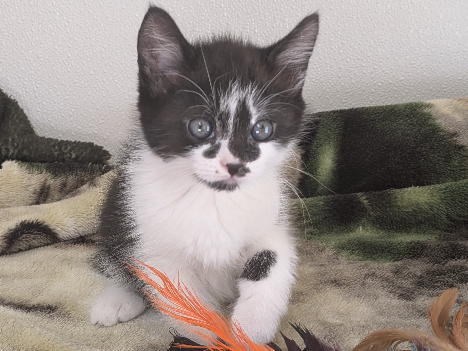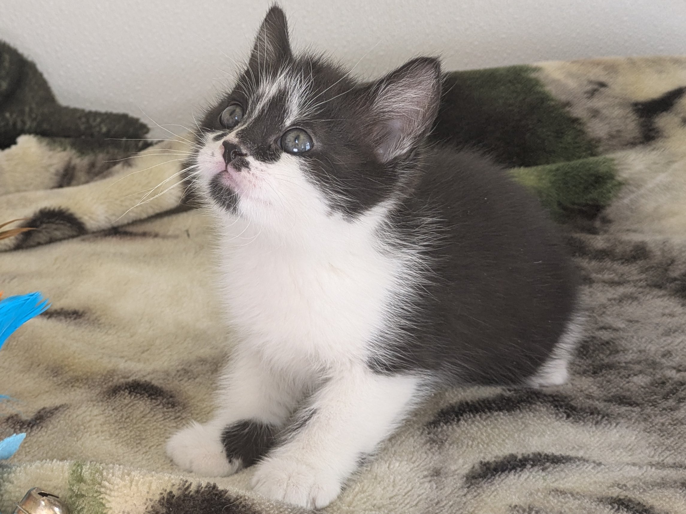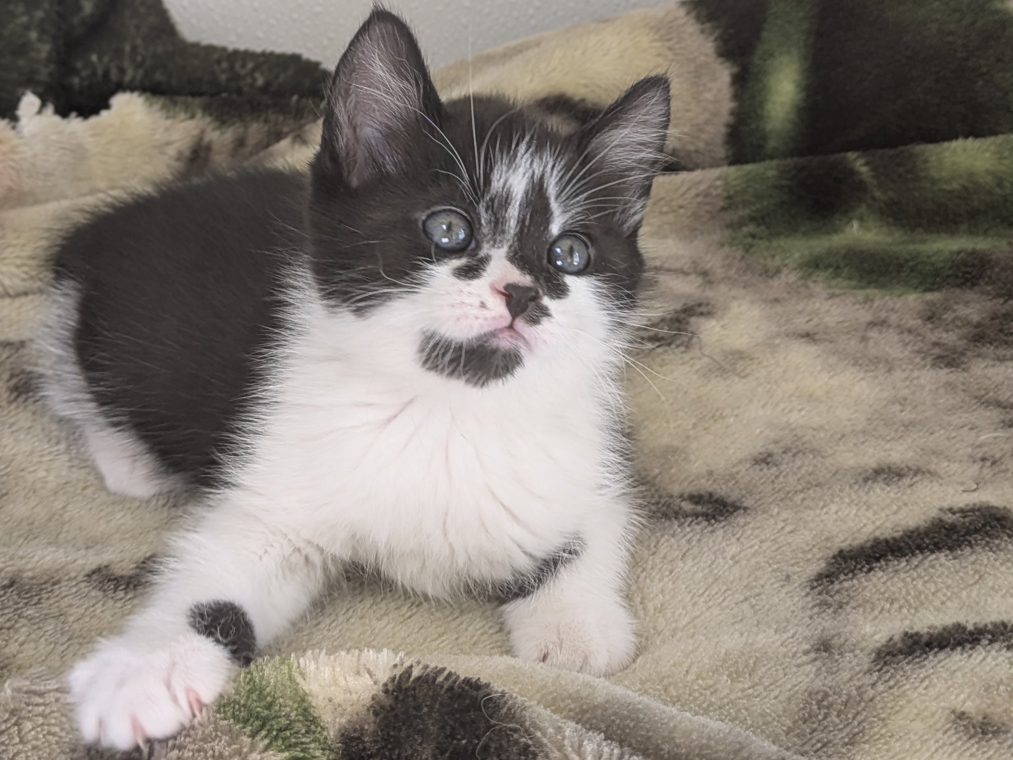 Please do not call the shelter; do the application first. Introducing the Green litter of kittens. These sweet babies were born at the shelter on 8/31/25 to Kalispell (also up for adoption), and will be ready to go home in mid-November. This litter includes: BASIL - female calico, mix of black and orange on either side of face PINE - female calico, symmetrical orange wings on either side of face FOREST - female black & white, black triangle in center of face, thin white forehead stripe MINT - male black & white, many black asymmetric splotches on face, most outgoing OLIVE - female black & white, tiny black mustache & goatee, sweet and sensitive They are just starting to get used to some time away from mama, and are slowly developing their purrrrsonalities. So far, we know that Mint is the Steve Martin of the bunch - a "wild and crazy guy" - while his sisters are a little bit more cautious about leaping into new situations. All should adapt quickly to their new homes and families, and will make terrific companions. They are young enough to learn about dogs and other cats, too! We'd love to see all kittens go to homes that have another young, playful kitten, or to send 2 of them out as a pair (which gives you a great pair discount rate), but we do not require pair adoptions. If you prefer to adopt just one, and you don't have a similarly aged kitten at home already, please read our information on Single Kitten Syndrome. Then, when you apply for a single kitten, please let us know in the "Comments" field how you plan to deal with the "kitten crazies." All pets arrive spayed/neutered, dewormed, microchipped and vaccinated. Adoption fee for Mint is a suggested minimum of $75 (more gratefully accepted). All pets are placed with a 30-day money-back trial period, to give pet and family enough time to discover any unknown allergies or other conflicts. Can't come to Republic? Don't let that stop you! We have monthly transports to the Seattle area, delivering adopted pets to their new owners. If you can add a little to your donation to help us cover our volunteer driver's expenses, that would be great!
