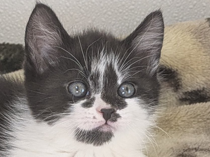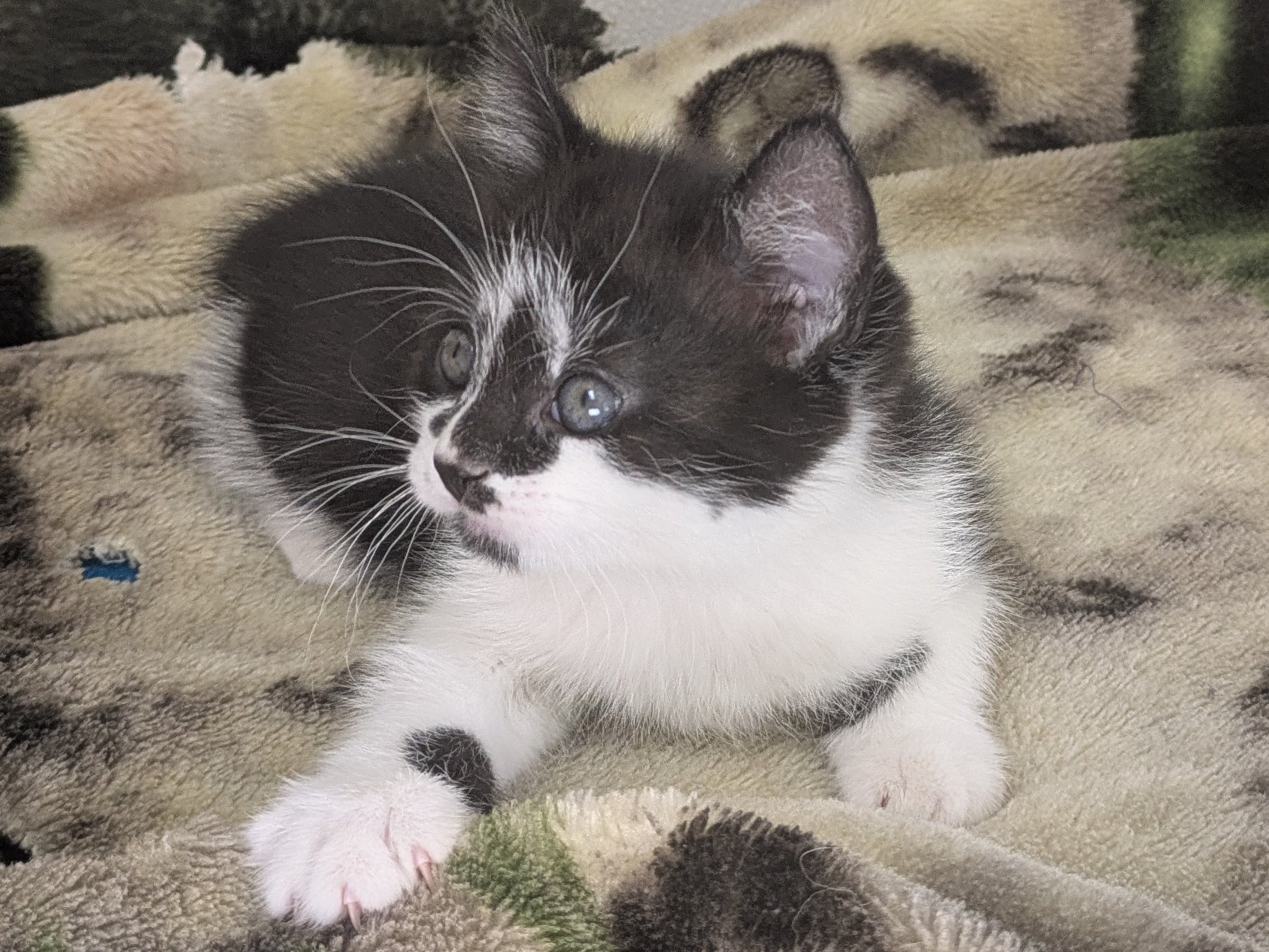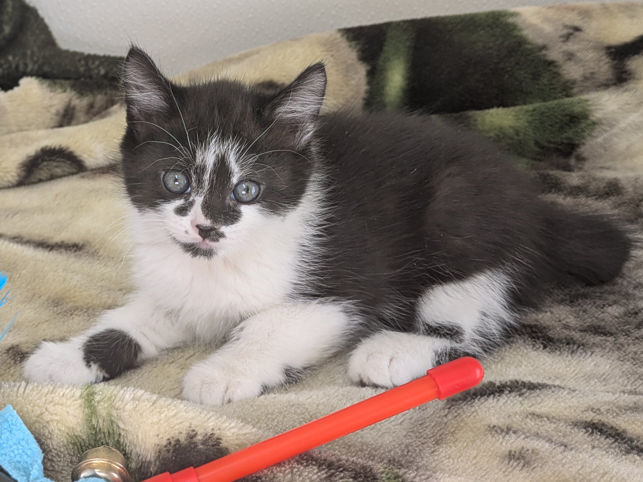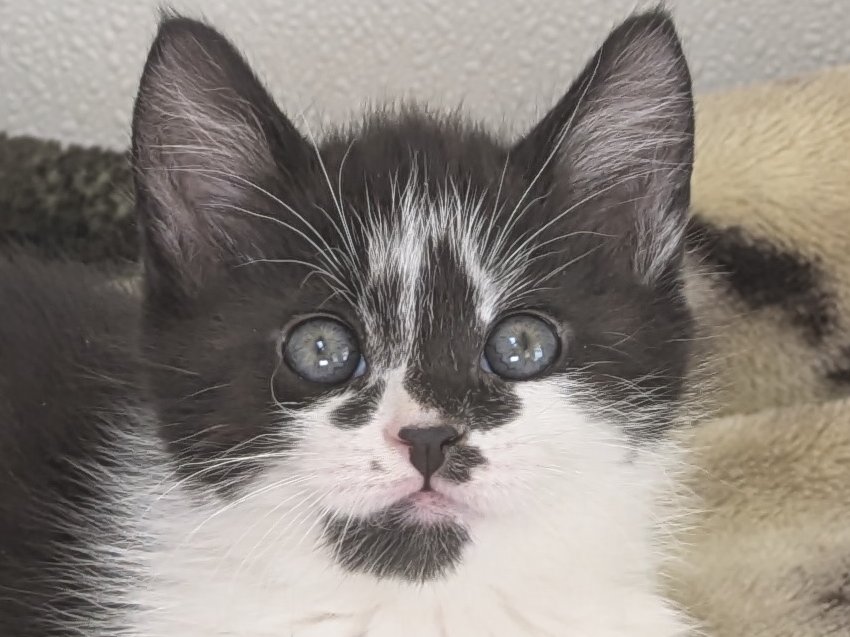 Please do not call the shelter; do the application first. Introducing the Green litter of kittens. These sweet babies were born at the shelter on 8/31/25 to Kalispell (also up for adoption), and will be ready to go home in mid-November. This litter includes: BASIL - female calico, mix of black and orange on either side of face PINE - female calico, symmetrical orange wings on either side of face FOREST - female black & white, black triangle in center of face, thin white forehead stripe MINT - male black & white, many black asymmetric splotches on face, most outgoing OLIVE - female black & white, tiny black mustache & goatee, sweet and sensitive They are just starting to get used to some time away from mama, and are slowly developing their purrrrsonalities. So far, we know that Mint is the Steve Martin of the bunch - a "wild and crazy guy" - while his sisters are a little bit more cautious about leaping into new situations. All should adapt quickly to their new homes and families, and will make terrific companions. They are young enough to learn about dogs and other cats, too! We'd love to see all kittens go to homes that have another young, playful kitten, or to send 2 of them out as a pair (which gives you a great pair discount rate), but we do not require pair adoptions. If you prefer to adopt just one, and you don't have a similarly aged kitten at home already, please read our information on Single Kitten Syndrome. Then, when you apply for a single kitten, please let us know in the "Comments" field how you plan to deal with the "kitten crazies." All pets arrive spayed/neutered, dewormed, microchipped and vaccinated. Adoption fee for Mint is a suggested minimum of $75 (more gratefully accepted). All pets are placed with a 30-day money-back trial period, to give pet and family enough time to discover any unknown allergies or other conflicts. Can't come to Republic? Don't let that stop you! We have monthly transports to the Seattle area, delivering adopted pets to their new owners. If you can add a little to your donation to help us cover our volunteer driver's expenses, that would be great!
