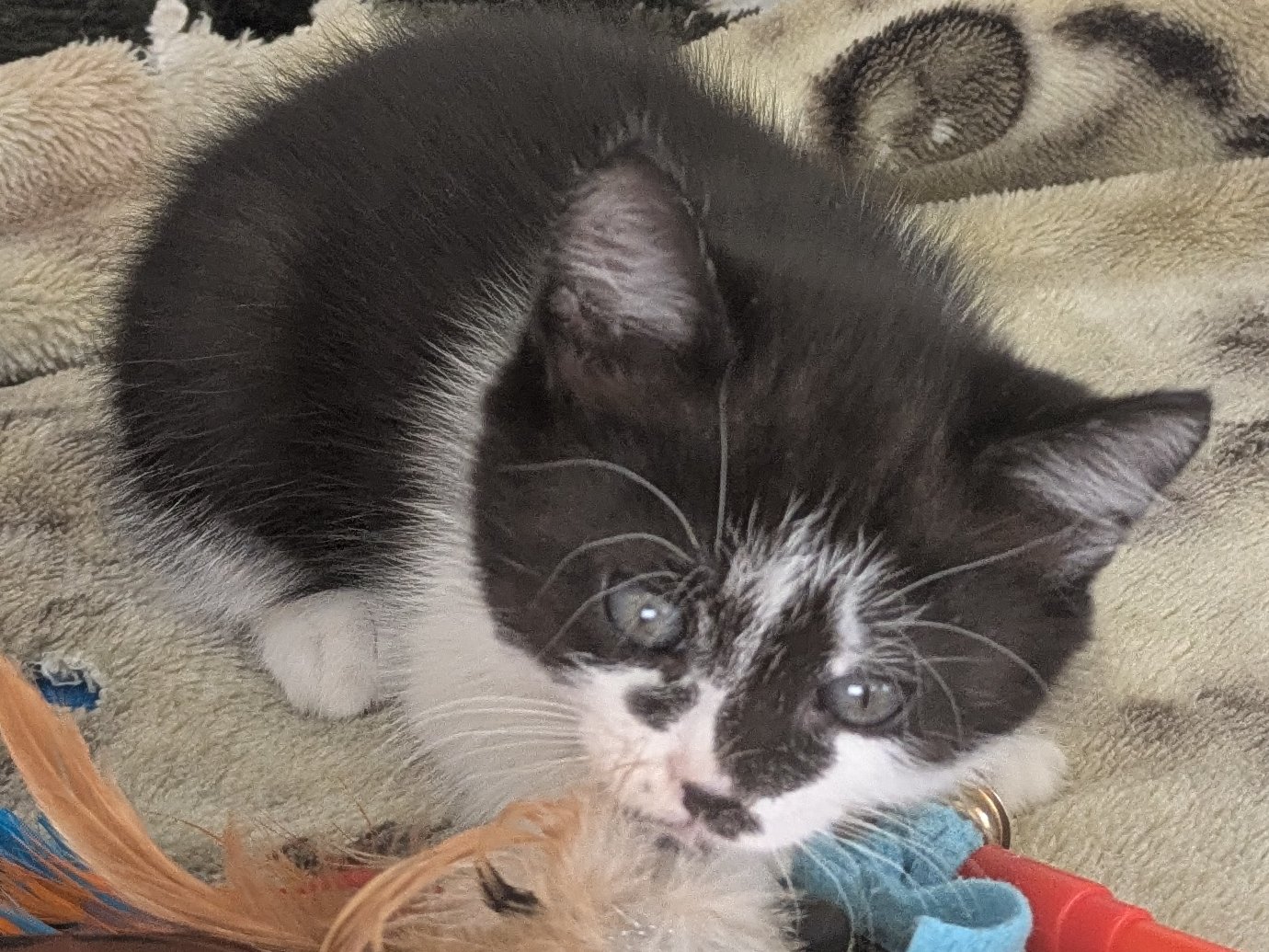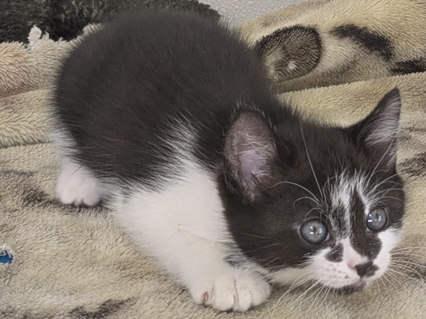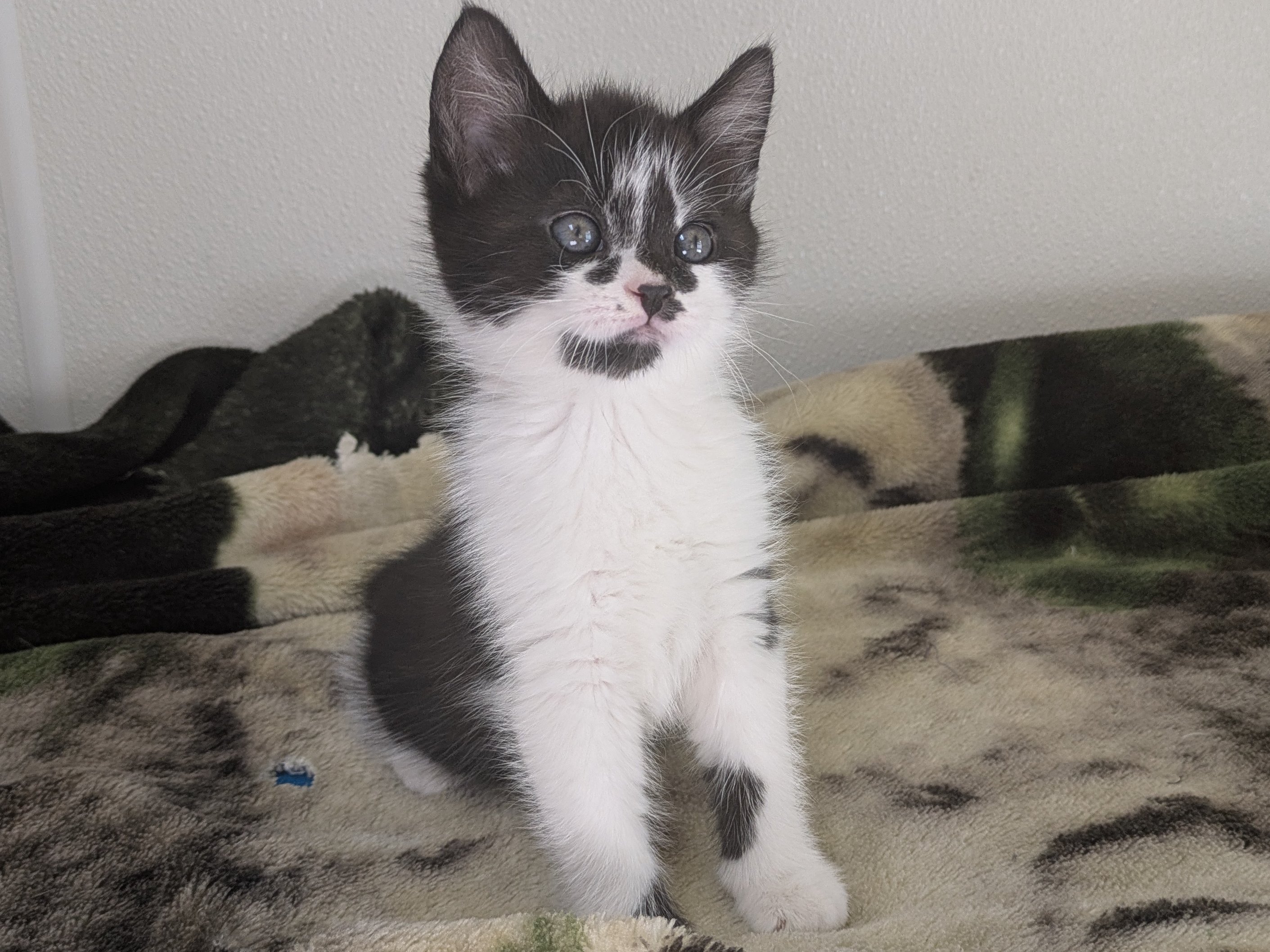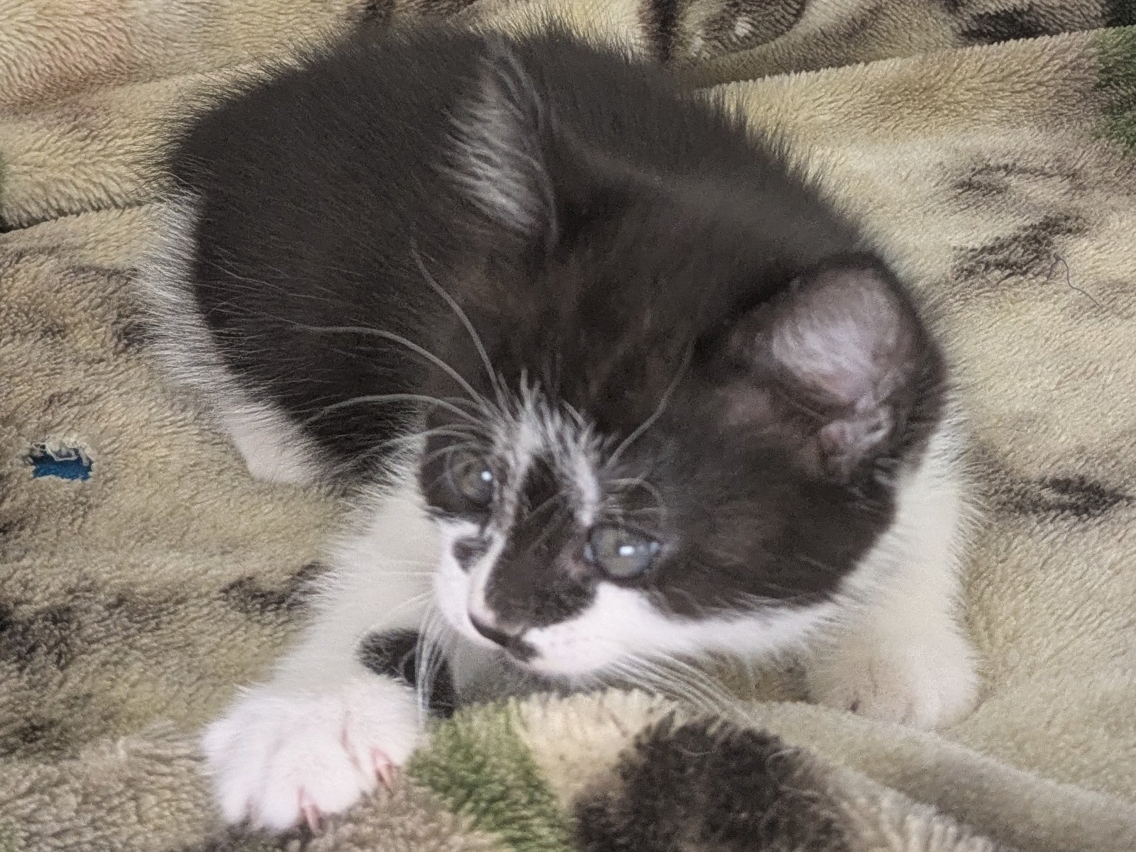 Please do not call the shelter; do the application first. Introducing the Green litter of kittens. These sweet babies were born at the shelter on 8/31/25 to Kalispell (also up for adoption), and will be ready to go home in mid-November. This litter includes: BASIL - female calico, mix of black and orange on either side of face PINE - female calico, symmetrical orange wings on either side of face FOREST - female black & white, black triangle in center of face, thin white forehead stripe MINT - male black & white, many black asymmetric splotches on face, most outgoing OLIVE - female black & white, tiny black mustache & goatee, sweet and sensitive They are just starting to get used to some time away from mama, and are slowly developing their purrrrsonalities. So far, we know that Mint is the Steve Martin of the bunch - a "wild and crazy guy" - while his sisters are a little bit more cautious about leaping into new situations. All should adapt quickly to their new homes and families, and will make terrific companions. They are young enough to learn about dogs and other cats, too! We'd love to see all kittens go to homes that have another young, playful kitten, or to send 2 of them out as a pair (which gives you a great pair discount rate), but we do not require pair adoptions. If you prefer to adopt just one, and you don't have a similarly aged kitten at home already, please read our information on Single Kitten Syndrome. Then, when you apply for a single kitten, please let us know in the "Comments" field how you plan to deal with the "kitten crazies." All pets arrive spayed/neutered, dewormed, microchipped and vaccinated. Adoption fee for Mint is a suggested minimum of $75 (more gratefully accepted). All pets are placed with a 30-day money-back trial period, to give pet and family enough time to discover any unknown allergies or other conflicts. Can't come to Republic? Don't let that stop you! We have monthly transports to the Seattle area, delivering adopted pets to their new owners. If you can add a little to your donation to help us cover our volunteer driver's expenses, that would be great!
