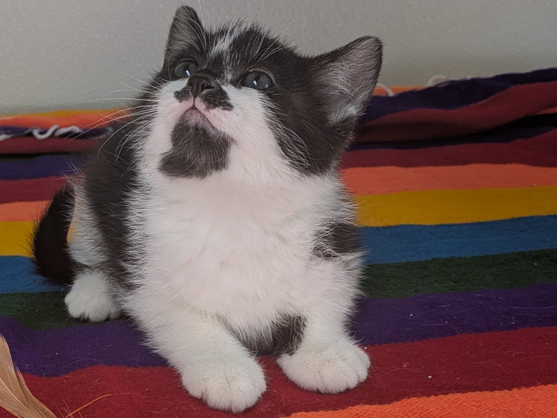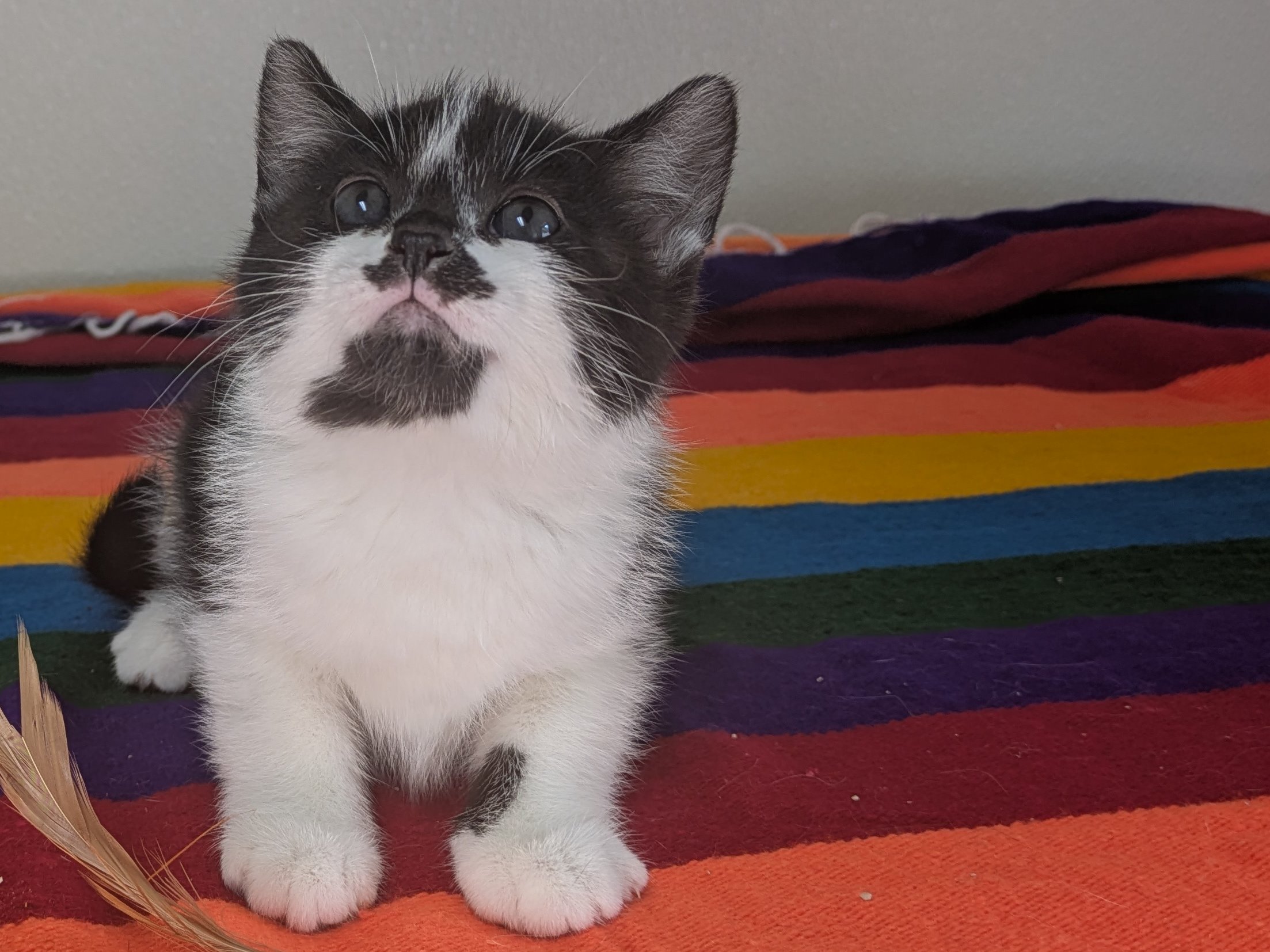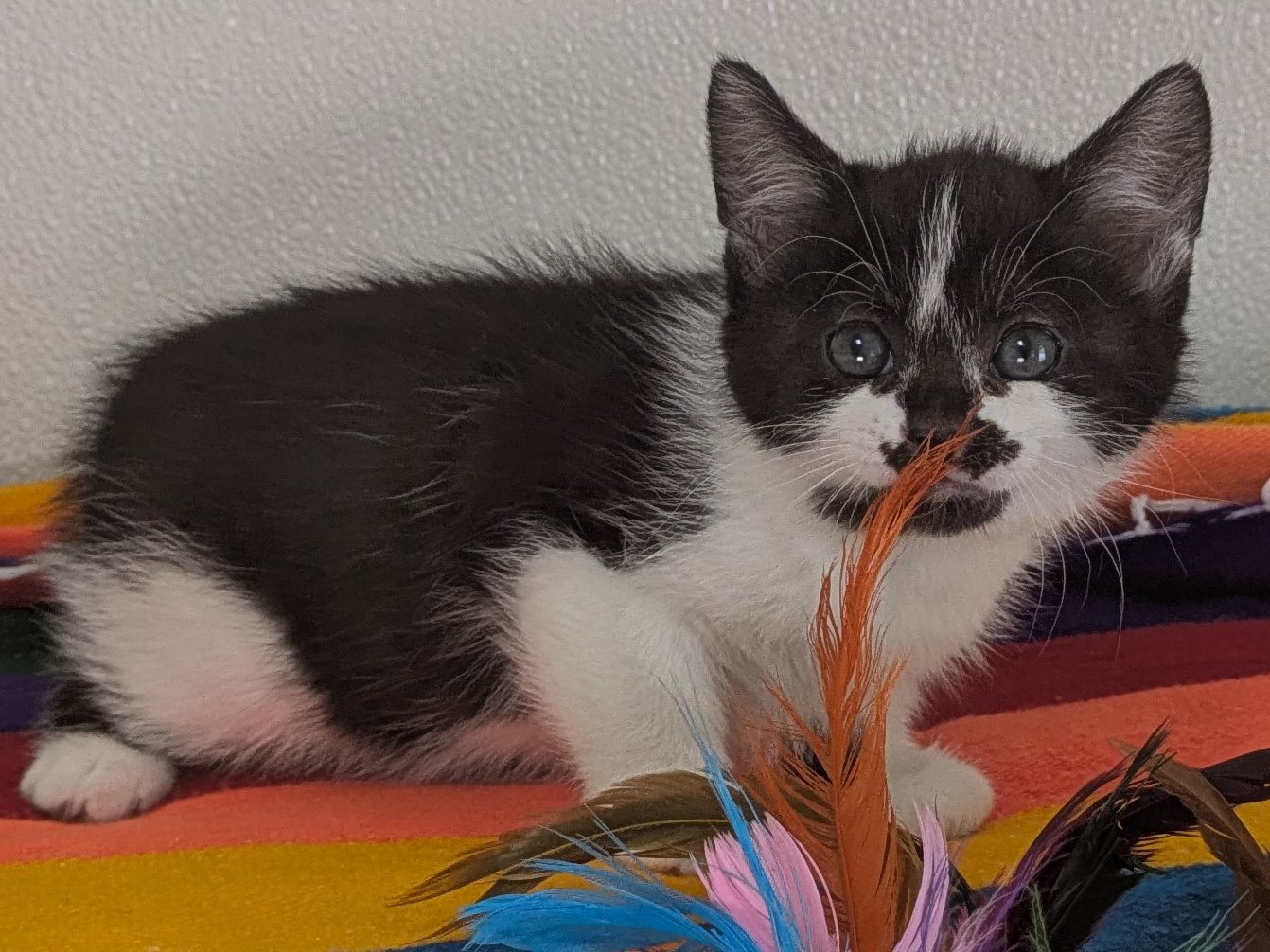 Please do not call the shelter; do the application first. Introducing the Green litter of kittens. These sweet babies were born at the shelter on 8/31/25 to Kalispell (also up for adoption), and will be ready to go home in mid-November. This litter includes: BASIL - female calico, mix of black and orange on either side of face PINE - female calico, symmetrical orange wings on either side of face FOREST - female black & white, black triangle in center of face, thin white forehead stripe MINT - male black & white, many black asymmetric splotches on face, most outgoing OLIVE - female black & white, tiny black mustache & goatee, sweet and sensitive They are just starting to get used to some time away from mama, and are slowly developing their purrrrsonalities. So far, we know that Mint is the Steve Martin of the bunch - a "wild and crazy guy" - while his sisters are a little bit more cautious about leaping into new situations. All should adapt quickly to their new homes and families, and will make terrific companions. They are young enough to learn about dogs and other cats, too! We'd love to see all kittens go to homes that have another young, playful kitten, or to send 2 of them out as a pair (which gives you a great pair discount rate), but we do not require pair adoptions. If you prefer to adopt just one, and you don't have a similarly aged kitten at home already, please read our information on Single Kitten Syndrome. Then, when you apply for a single kitten, please let us know in the "Comments" field how you plan to deal with the "kitten crazies." All pets arrive spayed/neutered, dewormed, microchipped and vaccinated. Adoption fee for Forest is a suggested minimum of $75 (more gratefully accepted). All pets are placed with a 30-day money-back trial period, to give pet and family enough time to discover any unknown allergies or other conflicts. Can't come to Republic? Don't let that stop you! We have monthly transports to the Seattle area, delivering adopted pets to their new owners. If you can add a little to your donation to help us cover our volunteer driver's expenses, that would be great!