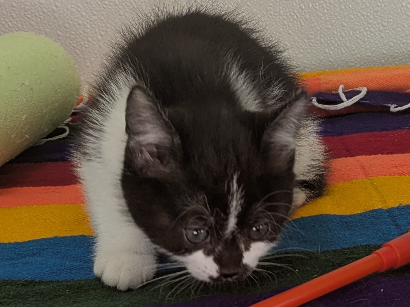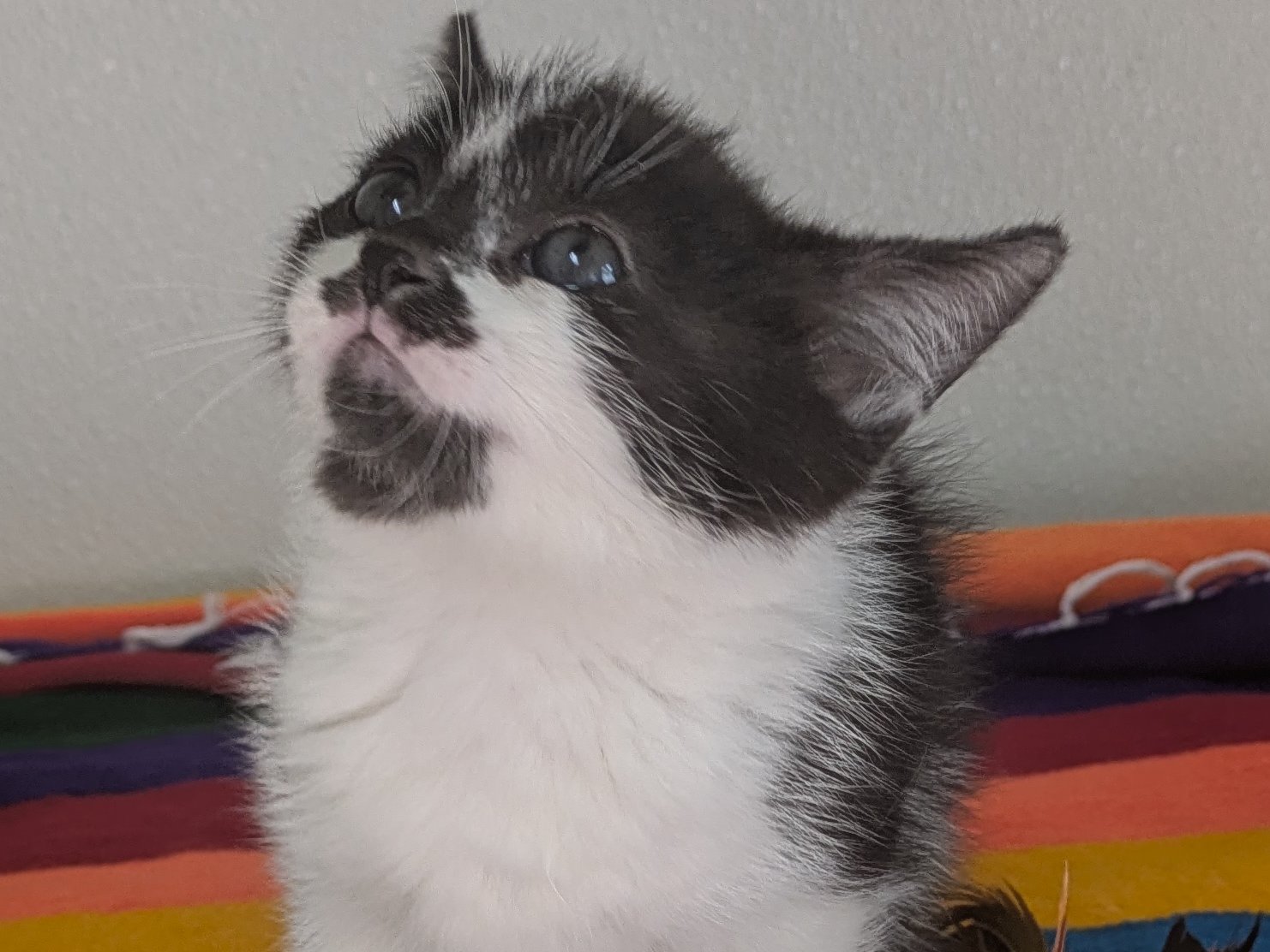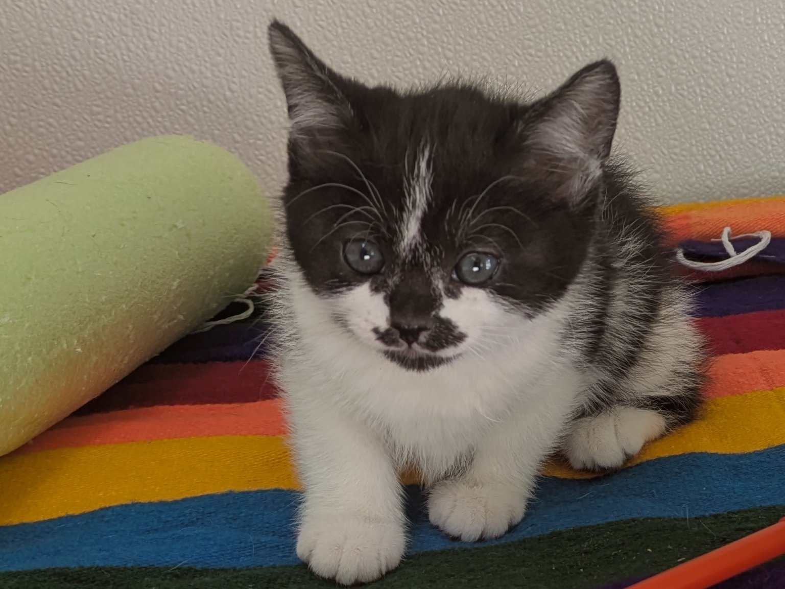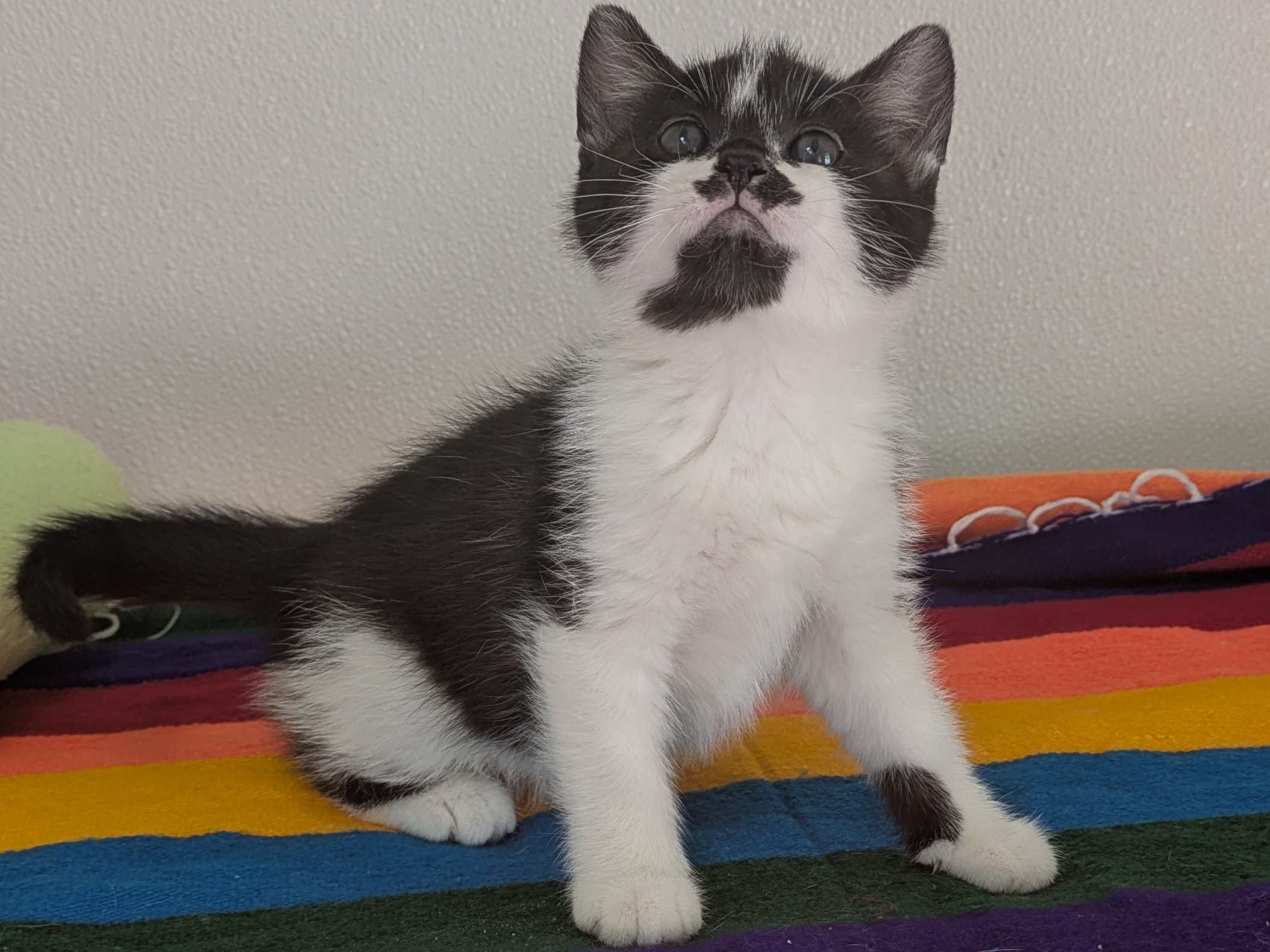 Please do not call the shelter; do the application first. Introducing the Green litter of kittens. These sweet babies were born at the shelter on 8/31/25 to Kalispell (also up for adoption), and will be ready to go home in mid-November. This litter includes: BASIL - female calico, mix of black and orange on either side of face PINE - female calico, symmetrical orange wings on either side of face FOREST - female black & white, black triangle in center of face, thin white forehead stripe MINT - male black & white, many black asymmetric splotches on face, most outgoing OLIVE - female black & white, tiny black mustache & goatee, sweet and sensitive They are just starting to get used to some time away from mama, and are slowly developing their purrrrsonalities. So far, we know that Mint is the Steve Martin of the bunch - a "wild and crazy guy" - while his sisters are a little bit more cautious about leaping into new situations. All should adapt quickly to their new homes and families, and will make terrific companions. They are young enough to learn about dogs and other cats, too! We'd love to see all kittens go to homes that have another young, playful kitten, or to send 2 of them out as a pair (which gives you a great pair discount rate), but we do not require pair adoptions. If you prefer to adopt just one, and you don't have a similarly aged kitten at home already, please read our information on Single Kitten Syndrome. Then, when you apply for a single kitten, please let us know in the "Comments" field how you plan to deal with the "kitten crazies." All pets arrive spayed/neutered, dewormed, microchipped and vaccinated. Adoption fee for Forest is a suggested minimum of $75 (more gratefully accepted). All pets are placed with a 30-day money-back trial period, to give pet and family enough time to discover any unknown allergies or other conflicts. Can't come to Republic? Don't let that stop you! We have monthly transports to the Seattle area, delivering adopted pets to their new owners. If you can add a little to your donation to help us cover our volunteer driver's expenses, that would be great!