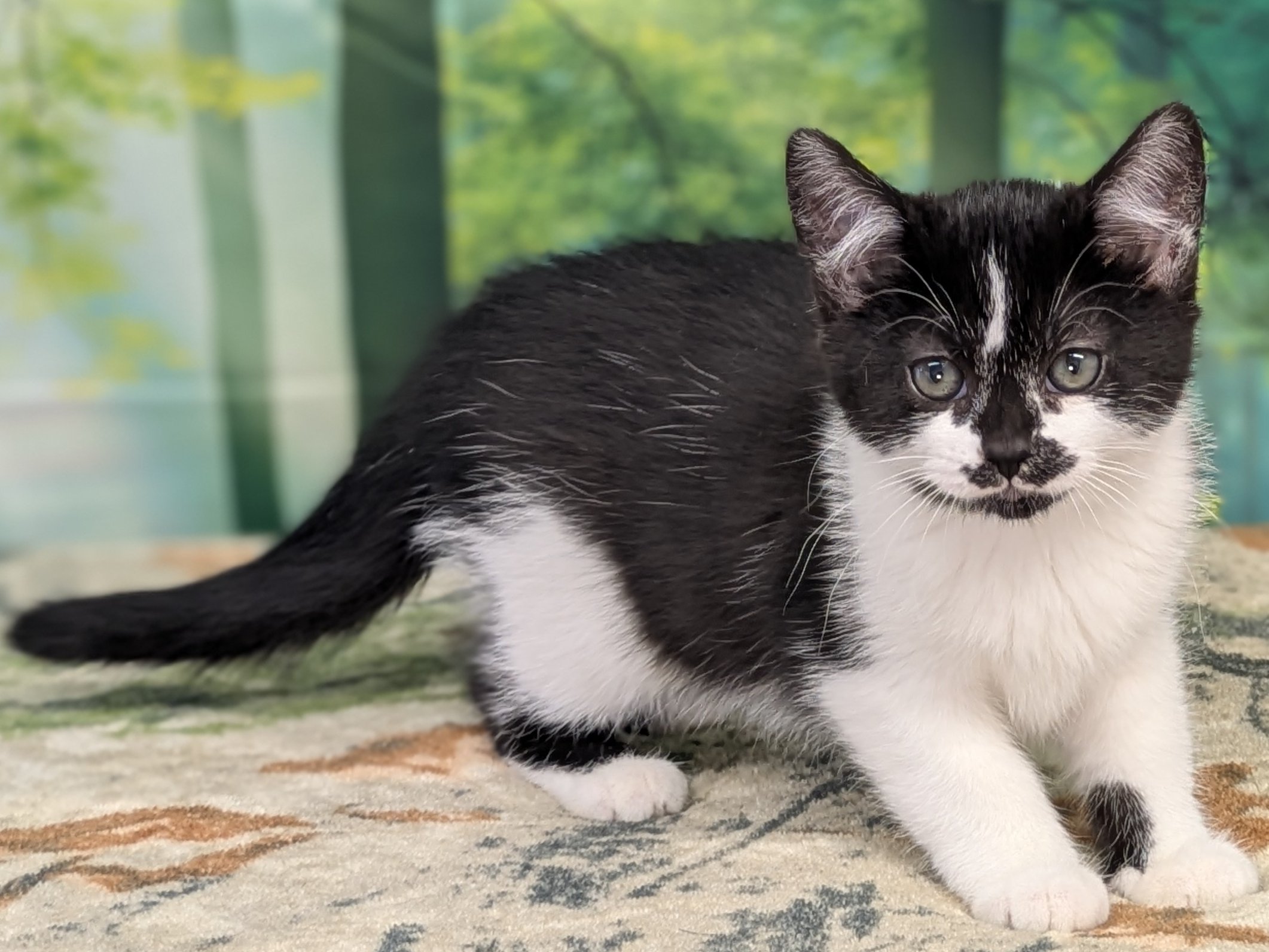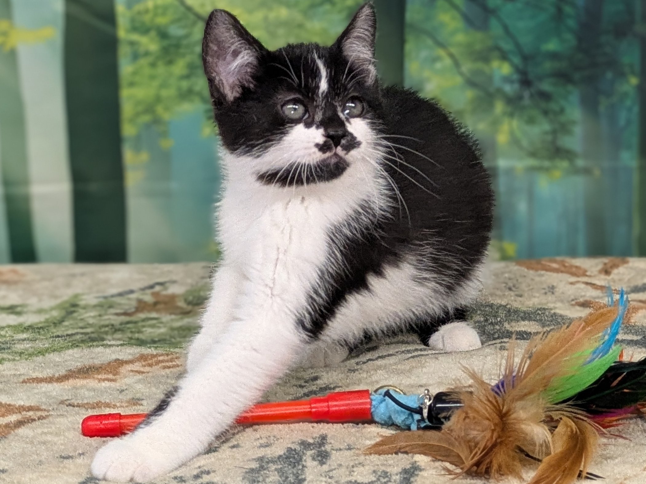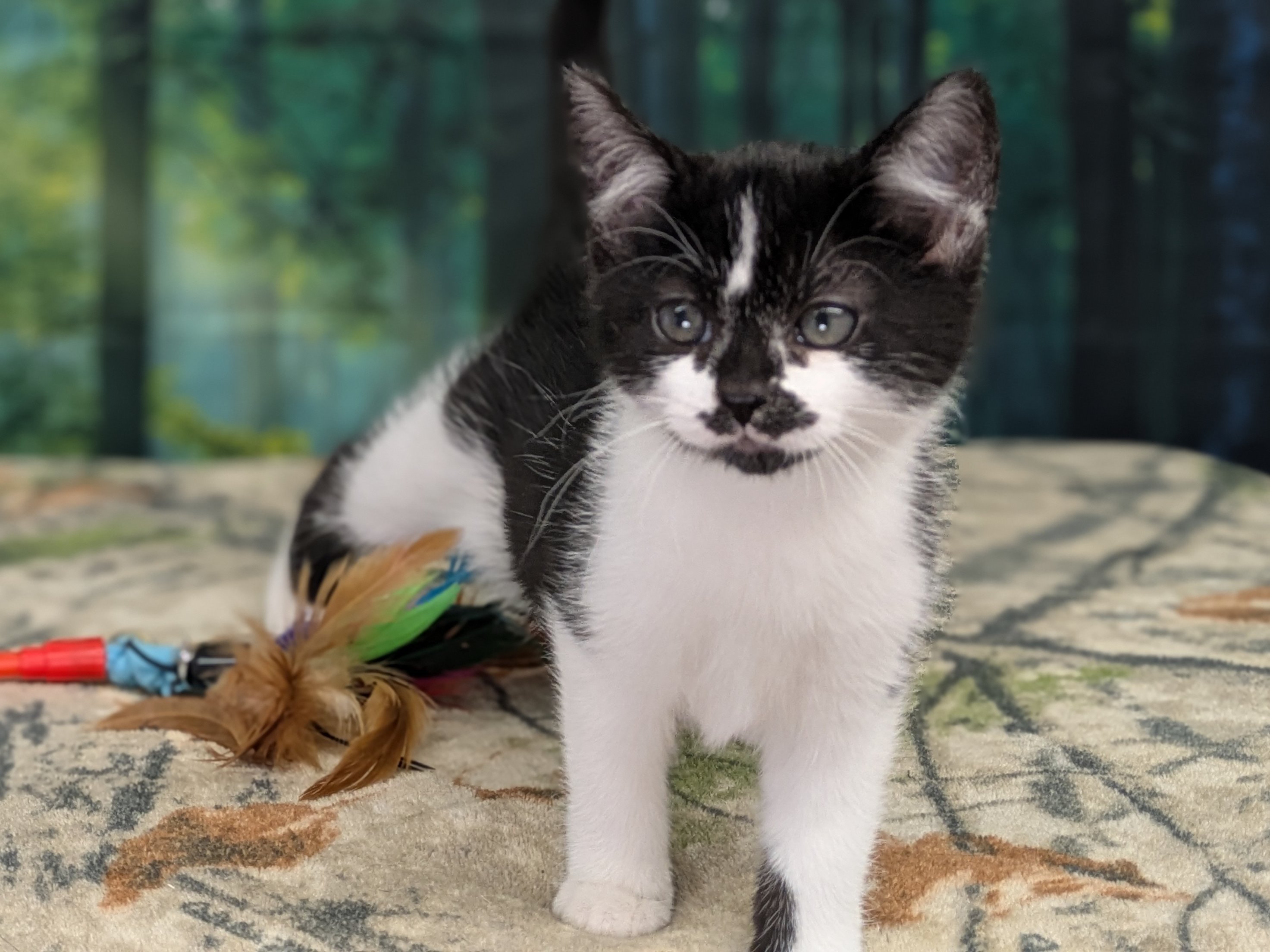 Please do not call the shelter; do the application first. Introducing the Green litter of kittens. These sweet babies were born at the shelter on 8/31/25 to Kalispell (also up for adoption), and will be ready to go home in mid-November. This litter includes: BASIL - female calico, mix of black and orange on either side of face PINE - female calico, symmetrical orange wings on either side of face FOREST - female black & white, black triangle in center of face, thin white forehead stripe MINT - male black & white, many black asymmetric splotches on face (adopted) OLIVE - female black & white, tiny black mustache & goatee, sweet and sensitive These cuties are coming along well with their socialization, and will continue to blossom nicely in their forever homes. They are all quite playful and enjoy both wand toys and chasing the laser dot! All should adapt quickly to their new homes and families, and will make terrific companions. They are young enough to learn about dogs and other cats, too! We'd love to see all kittens go to homes that have another young, playful kitten, or to send 2 of them out as a pair (which gives you a great pair discount rate), but we do not require pair adoptions. If you prefer to adopt just one, and you don't have a similarly aged kitten at home already, please read our information on Single Kitten Syndrome. Then, when you apply for a single kitten, please let us know in the "Comments" field how you plan to deal with the "kitten crazies." All pets arrive spayed/neutered, dewormed, microchipped and vaccinated. Adoption fee for Forest is a suggested minimum of $75 (more gratefully accepted). All pets are placed with a 30-day money-back trial period, to give pet and family enough time to discover any unknown allergies or other conflicts. Can't come to Republic? Don't let that stop you! We have monthly transports to the Seattle area, delivering adopted pets to their new owners. If you can add a little to your donation to help us cover our volunteer driver's expenses, that would be great!