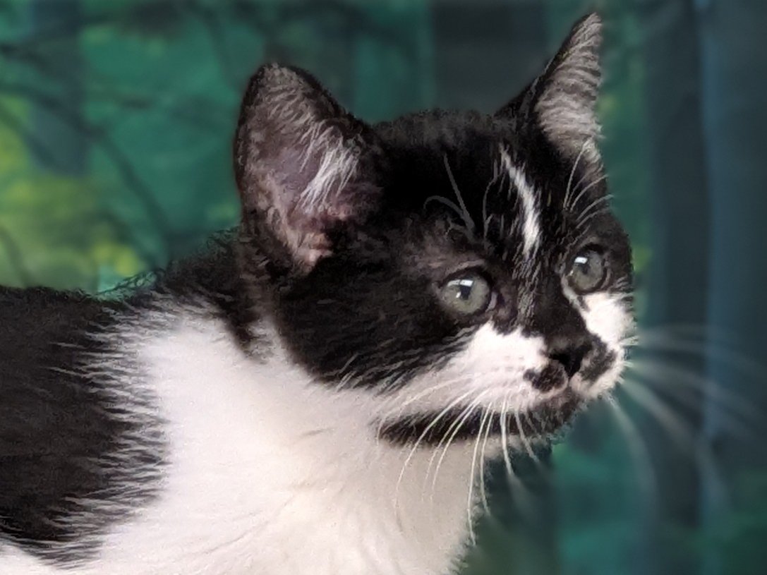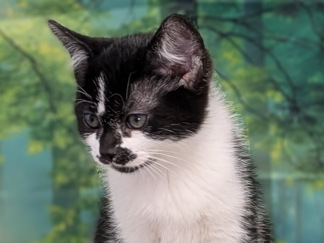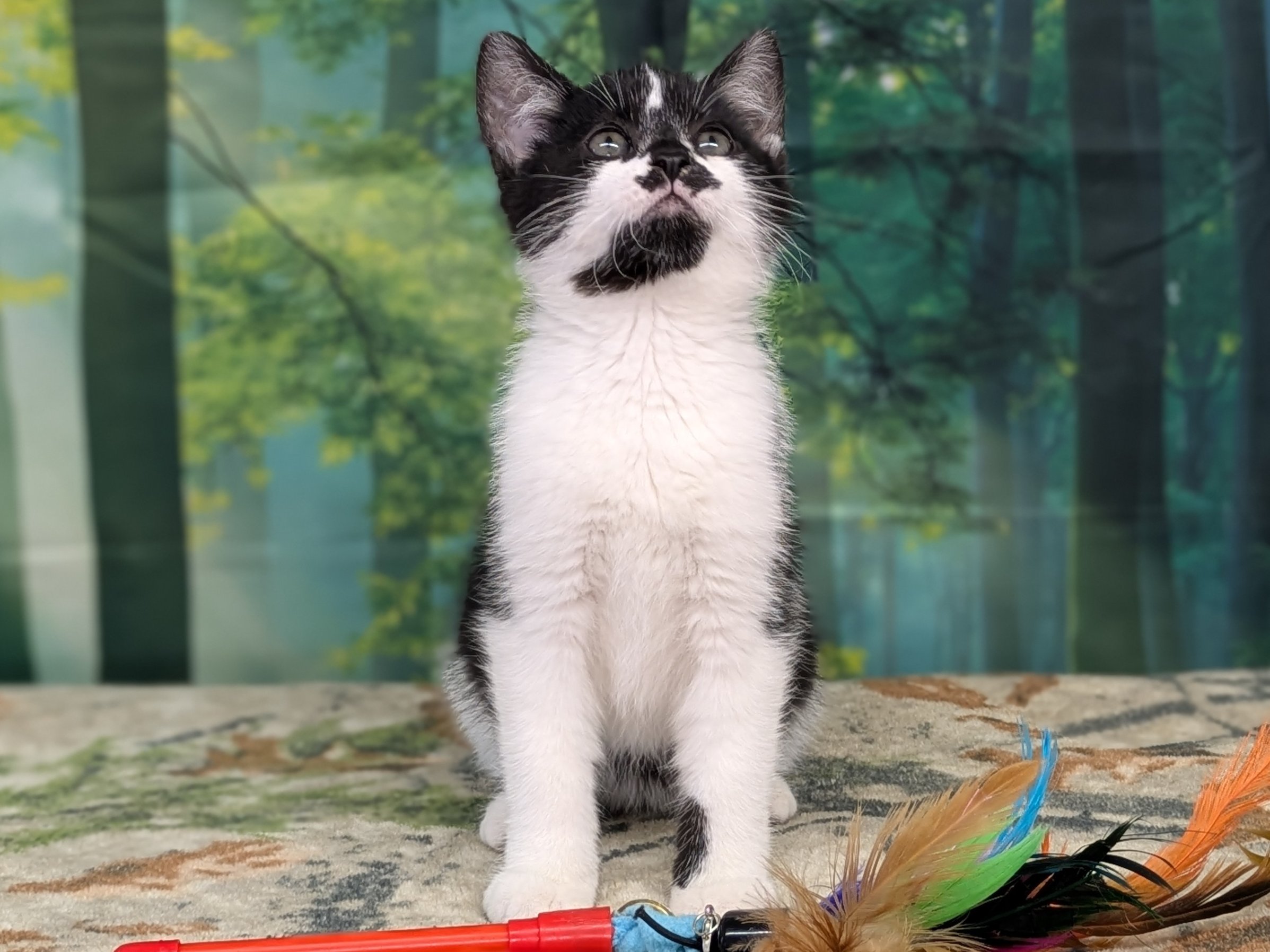 Please do not call the shelter; do the application first. Introducing the Green litter of kittens. These sweet babies were born at the shelter on 8/31/25 to Kalispell (also up for adoption), and will be ready to go home in mid-November. This litter includes: BASIL - female calico, mix of black and orange on either side of face PINE - female calico, symmetrical orange wings on either side of face FOREST - female black & white, black triangle in center of face, thin white forehead stripe MINT - male black & white, many black asymmetric splotches on face (adopted) OLIVE - female black & white, tiny black mustache & goatee, sweet and sensitive These cuties are coming along well with their socialization, and will continue to blossom nicely in their forever homes. They are all quite playful and enjoy both wand toys and chasing the laser dot! All should adapt quickly to their new homes and families, and will make terrific companions. They are young enough to learn about dogs and other cats, too! We'd love to see all kittens go to homes that have another young, playful kitten, or to send 2 of them out as a pair (which gives you a great pair discount rate), but we do not require pair adoptions. If you prefer to adopt just one, and you don't have a similarly aged kitten at home already, please read our information on Single Kitten Syndrome. Then, when you apply for a single kitten, please let us know in the "Comments" field how you plan to deal with the "kitten crazies." All pets arrive spayed/neutered, dewormed, microchipped and vaccinated. Adoption fee for Forest is a suggested minimum of $75 (more gratefully accepted). All pets are placed with a 30-day money-back trial period, to give pet and family enough time to discover any unknown allergies or other conflicts. Can't come to Republic? Don't let that stop you! We have monthly transports to the Seattle area, delivering adopted pets to their new owners. If you can add a little to your donation to help us cover our volunteer driver's expenses, that would be great!