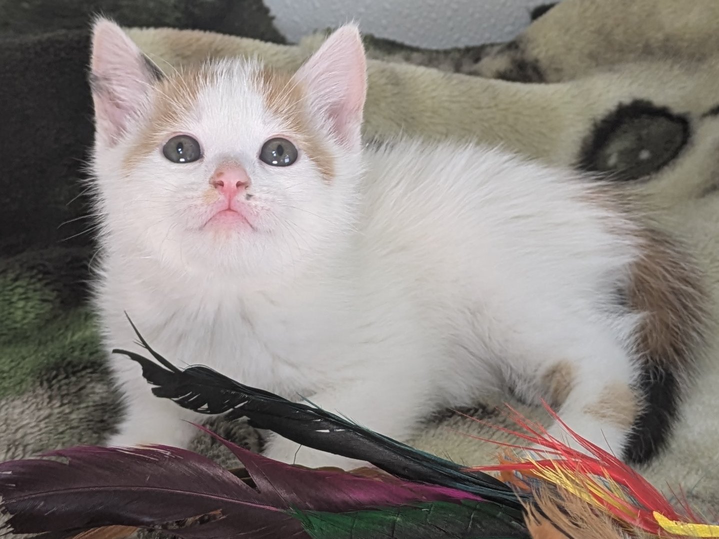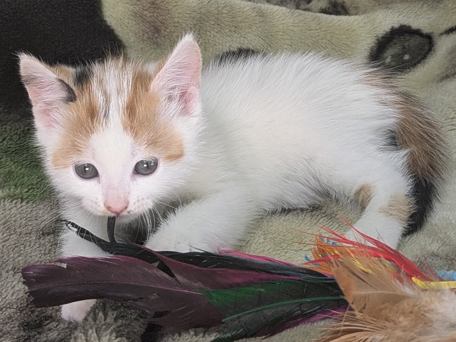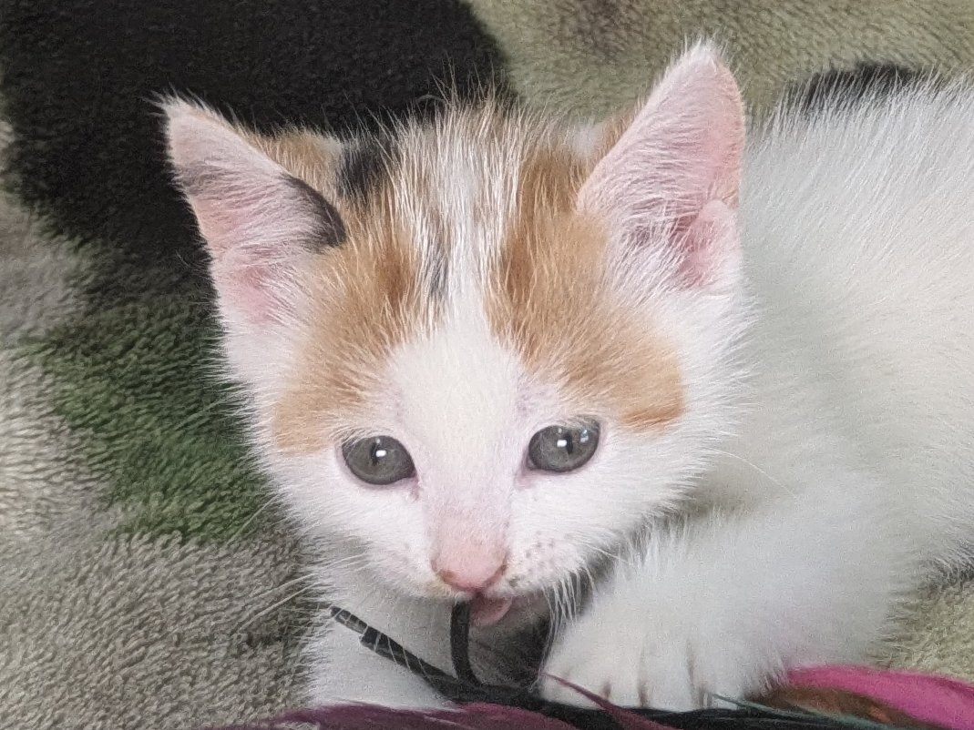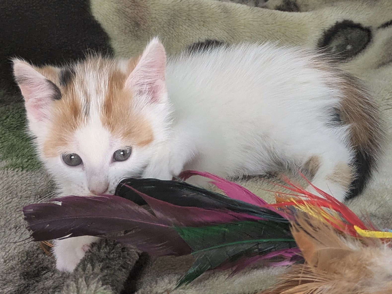 Please do not call the shelter; do the application first. Introducing the Green litter of kittens. These sweet babies were born at the shelter on 8/31/25 to Kalispell (also up for adoption), and will be ready to go home in mid-November. This litter includes: BASIL - female calico, mix of black and orange on either side of face (ADOPTION PENDING) PINE - female calico, symmetrical orange wings on either side of face FOREST - female black & white, black triangle in center of face, thin white forehead stripe (ADOPTION PENDING) MINT - male black & white, many black asymmetric splotches on face, most outgoing (ADOPTION PENDING) OLIVE - female black & white, tiny black mustache & goatee, sweet and sensitive (ADOPTION PENDING) They are just starting to get used to some time away from mama, and are slowly developing their purrrrsonalities. So far, we know that Mint is the Steve Martin of the bunch - a "wild and crazy guy" - while his sisters are a little bit more cautious about leaping into new situations. All should adapt quickly to their new homes and families, and will make terrific companions. They are young enough to learn about dogs and other cats, too! We'd love to see all kittens go to homes that have another young, playful kitten, or to send 2 of them out as a pair (which gives you a great pair discount rate), but we do not require pair adoptions. If you prefer to adopt just one, and you don't have a similarly aged kitten at home already, please read our information on Single Kitten Syndrome. Then, when you apply for a single kitten, please let us know in the "Comments" field how you plan to deal with the "kitten crazies." All pets arrive spayed/neutered, dewormed, microchipped and vaccinated. Adoption fee for Pine is a suggested minimum of $75 (more gratefully accepted). All pets are placed with a 30-day money-back trial period, to give pet and family enough time to discover any unknown allergies or other conflicts. Can't come to Republic? Don't let that stop you! We have monthly transports to the Seattle area, delivering adopted pets to their new owners. If you can add a little to your donation to help us cover our volunteer driver's expenses, that would be great!