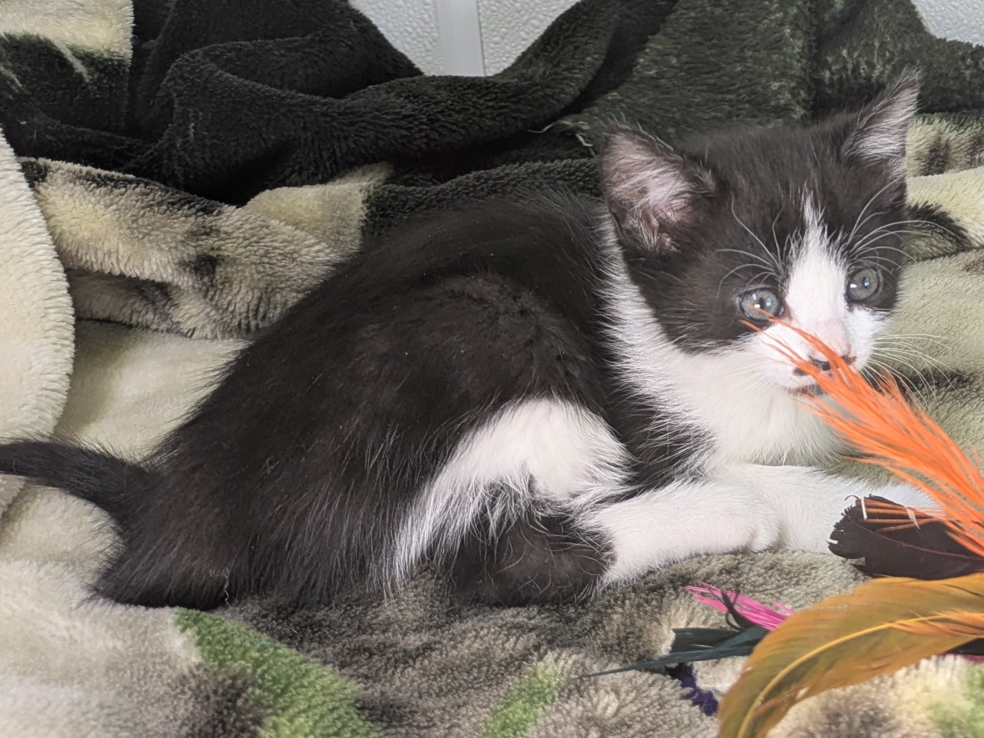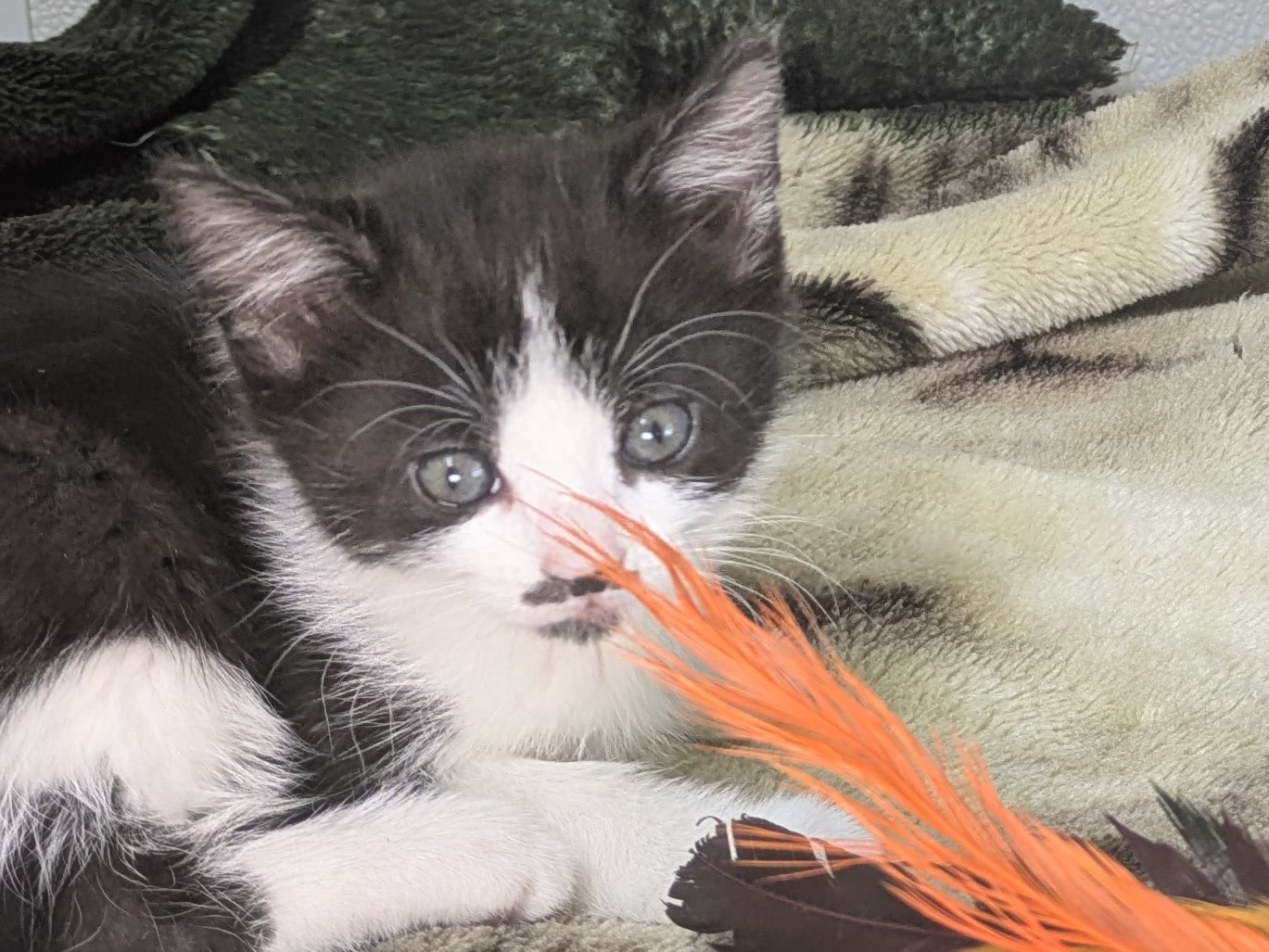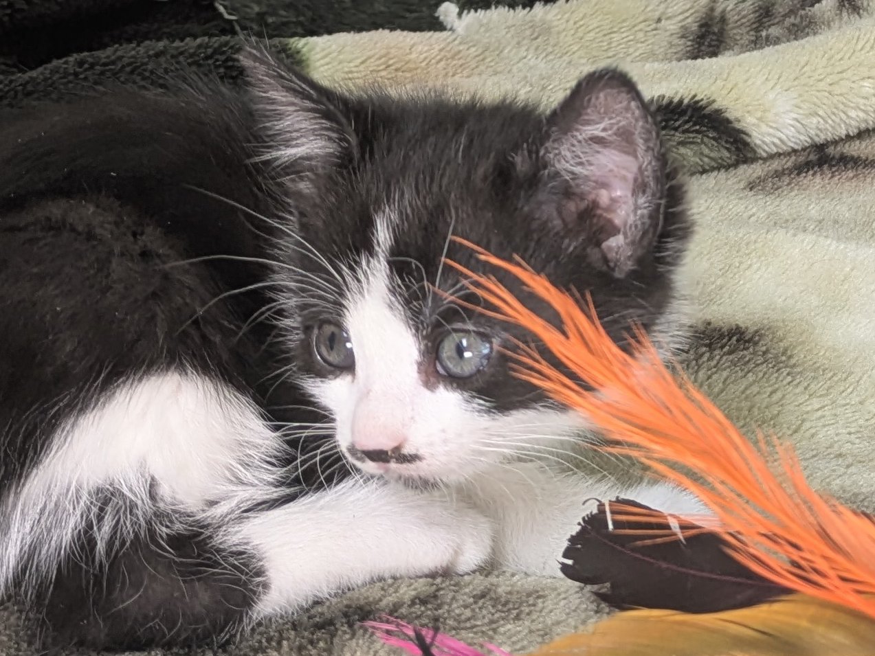 Please do not call the shelter; do the application first. Introducing the Green litter of kittens. These sweet babies were born at the shelter on 8/31/25 to Kalispell (also up for adoption), and will be ready to go home in mid-November. This litter includes: BASIL - female calico, mix of black and orange on either side of face PINE - female calico, symmetrical orange wings on either side of face FOREST - female black & white, black triangle in center of face, thin white forehead stripe MINT - male black & white, many black asymmetric splotches on face, most outgoing OLIVE - female black & white, tiny black mustache & goatee, sweet and sensitive They are just starting to get used to some time away from mama, and are slowly developing their purrrrsonalities. So far, we know that Mint is the Steve Martin of the bunch - a "wild and crazy guy" - while his sisters are a little bit more cautious about leaping into new situations. All should adapt quickly to their new homes and families, and will make terrific companions. They are young enough to learn about dogs and other cats, too! We'd love to see all kittens go to homes that have another young, playful kitten, or to send 2 of them out as a pair (which gives you a great pair discount rate), but we do not require pair adoptions. If you prefer to adopt just one, and you don't have a similarly aged kitten at home already, please read our information on Single Kitten Syndrome. Then, when you apply for a single kitten, please let us know in the "Comments" field how you plan to deal with the "kitten crazies." All pets arrive spayed/neutered, dewormed, microchipped and vaccinated. Adoption fee for Olive is a suggested minimum of $75 (more gratefully accepted). All pets are placed with a 30-day money-back trial period, to give pet and family enough time to discover any unknown allergies or other conflicts. Can't come to Republic? Don't let that stop you! We have monthly transports to the Seattle area, delivering adopted pets to their new owners. If you can add a little to your donation to help us cover our volunteer driver's expenses, that would be great!