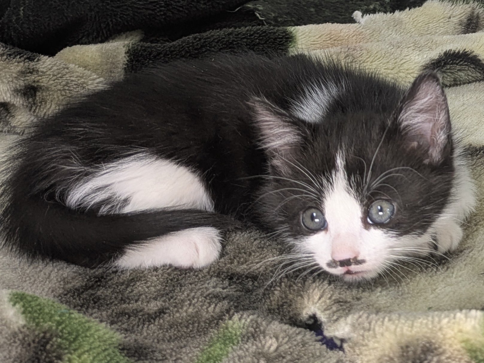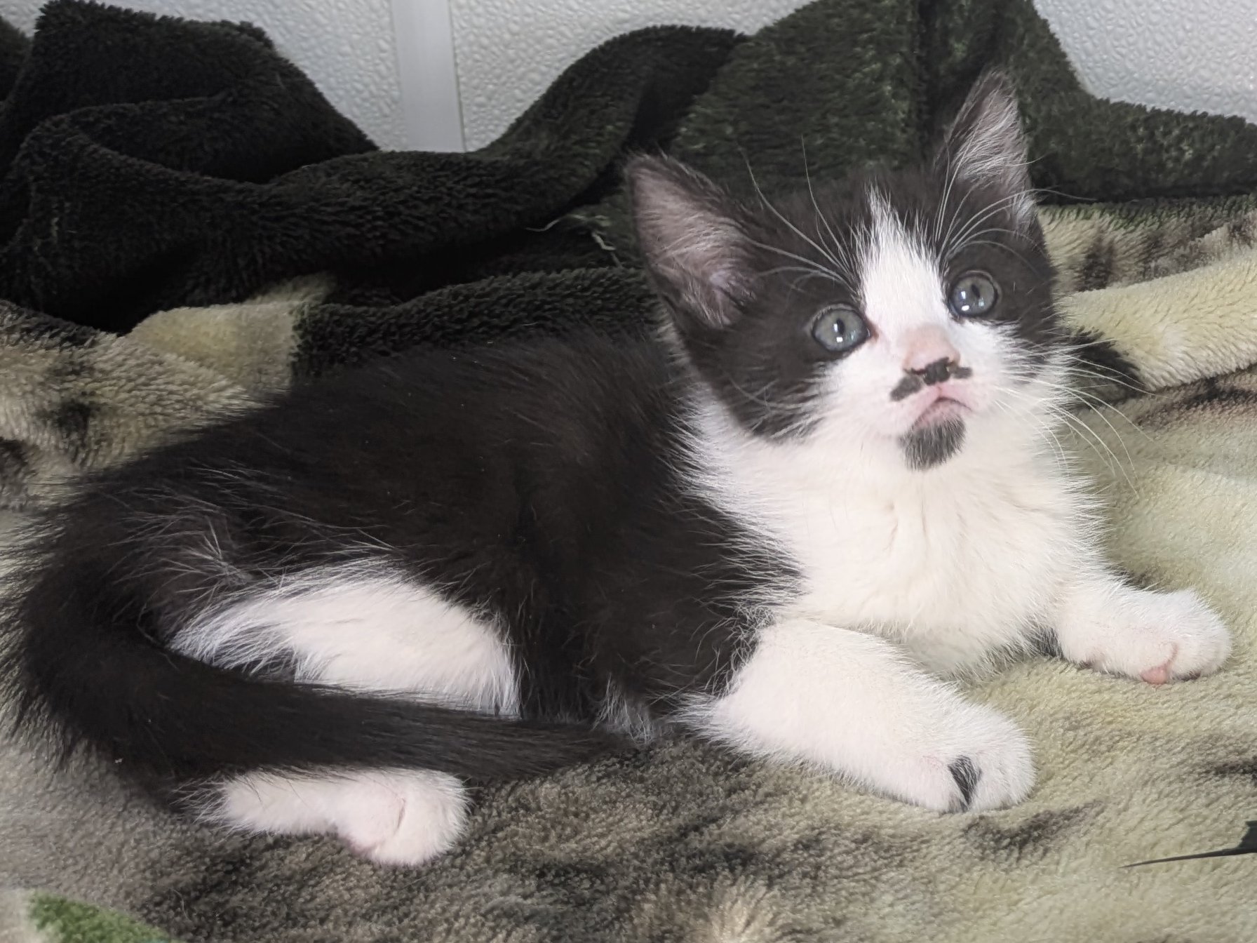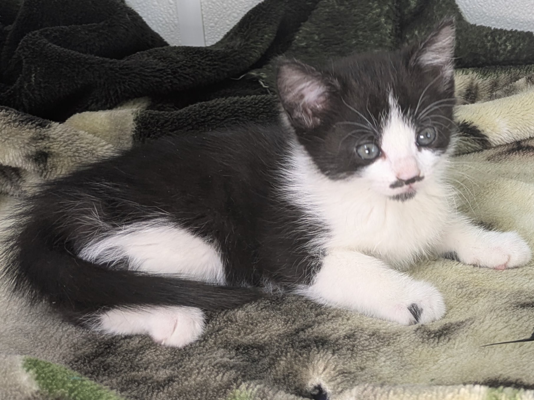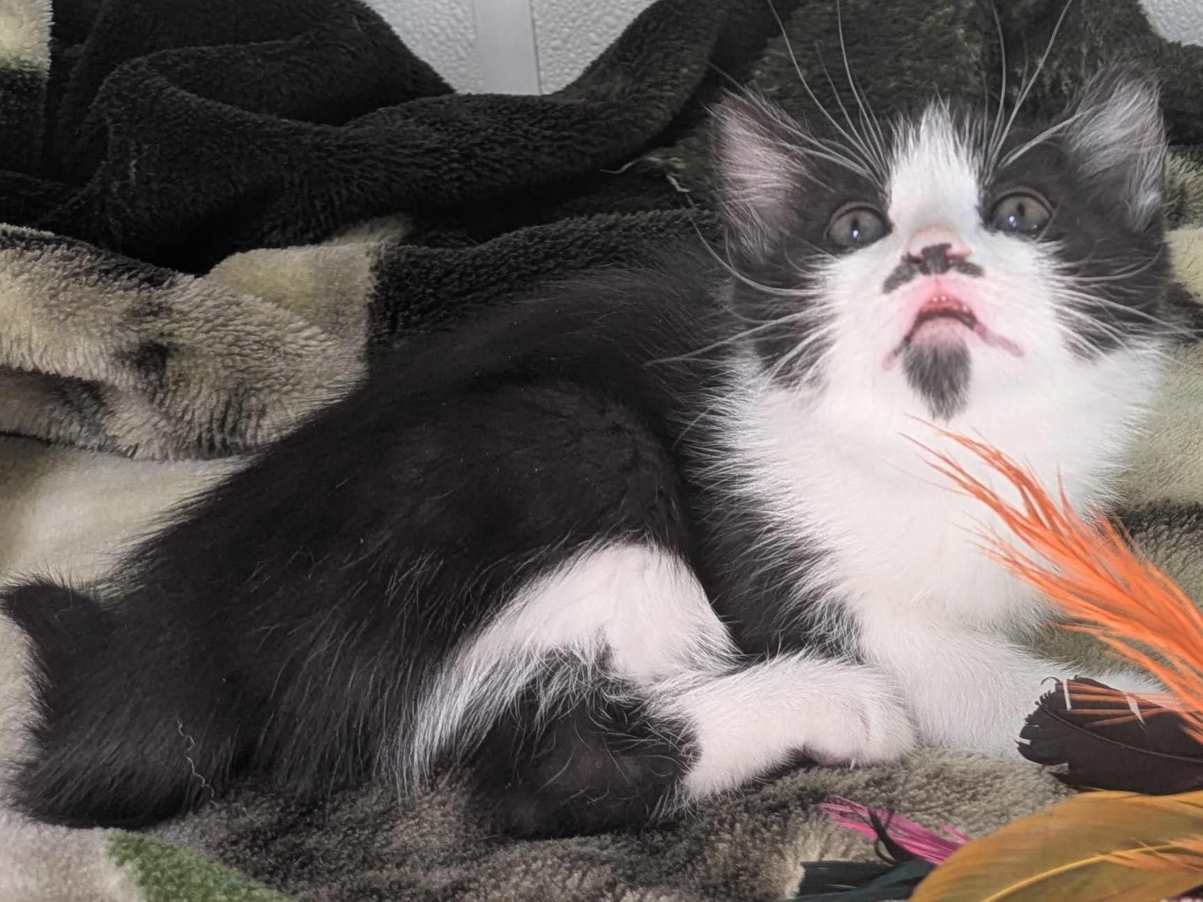 Please do not call the shelter; do the application first. Introducing the Green litter of kittens. These sweet babies were born at the shelter on 8/31/25 to Kalispell (also up for adoption), and will be ready to go home in mid-November. This litter includes: BASIL - female calico, mix of black and orange on either side of face PINE - female calico, symmetrical orange wings on either side of face FOREST - female black & white, black triangle in center of face, thin white forehead stripe MINT - male black & white, many black asymmetric splotches on face, most outgoing OLIVE - female black & white, tiny black mustache & goatee, sweet and sensitive They are just starting to get used to some time away from mama, and are slowly developing their purrrrsonalities. So far, we know that Mint is the Steve Martin of the bunch - a "wild and crazy guy" - while his sisters are a little bit more cautious about leaping into new situations. All should adapt quickly to their new homes and families, and will make terrific companions. They are young enough to learn about dogs and other cats, too! We'd love to see all kittens go to homes that have another young, playful kitten, or to send 2 of them out as a pair (which gives you a great pair discount rate), but we do not require pair adoptions. If you prefer to adopt just one, and you don't have a similarly aged kitten at home already, please read our information on Single Kitten Syndrome. Then, when you apply for a single kitten, please let us know in the "Comments" field how you plan to deal with the "kitten crazies." All pets arrive spayed/neutered, dewormed, microchipped and vaccinated. Adoption fee for Olive is a suggested minimum of $75 (more gratefully accepted). All pets are placed with a 30-day money-back trial period, to give pet and family enough time to discover any unknown allergies or other conflicts. Can't come to Republic? Don't let that stop you! We have monthly transports to the Seattle area, delivering adopted pets to their new owners. If you can add a little to your donation to help us cover our volunteer driver's expenses, that would be great!