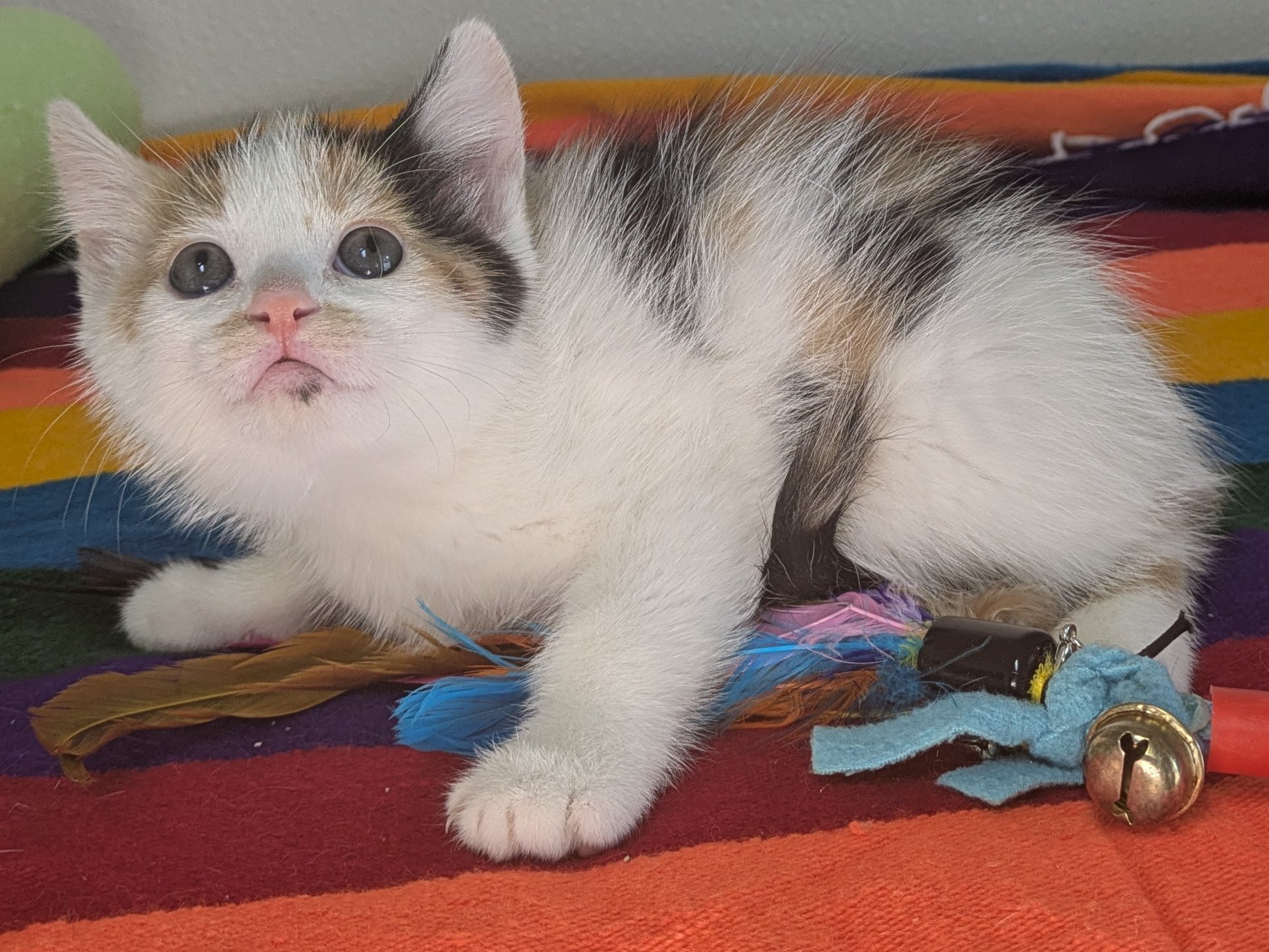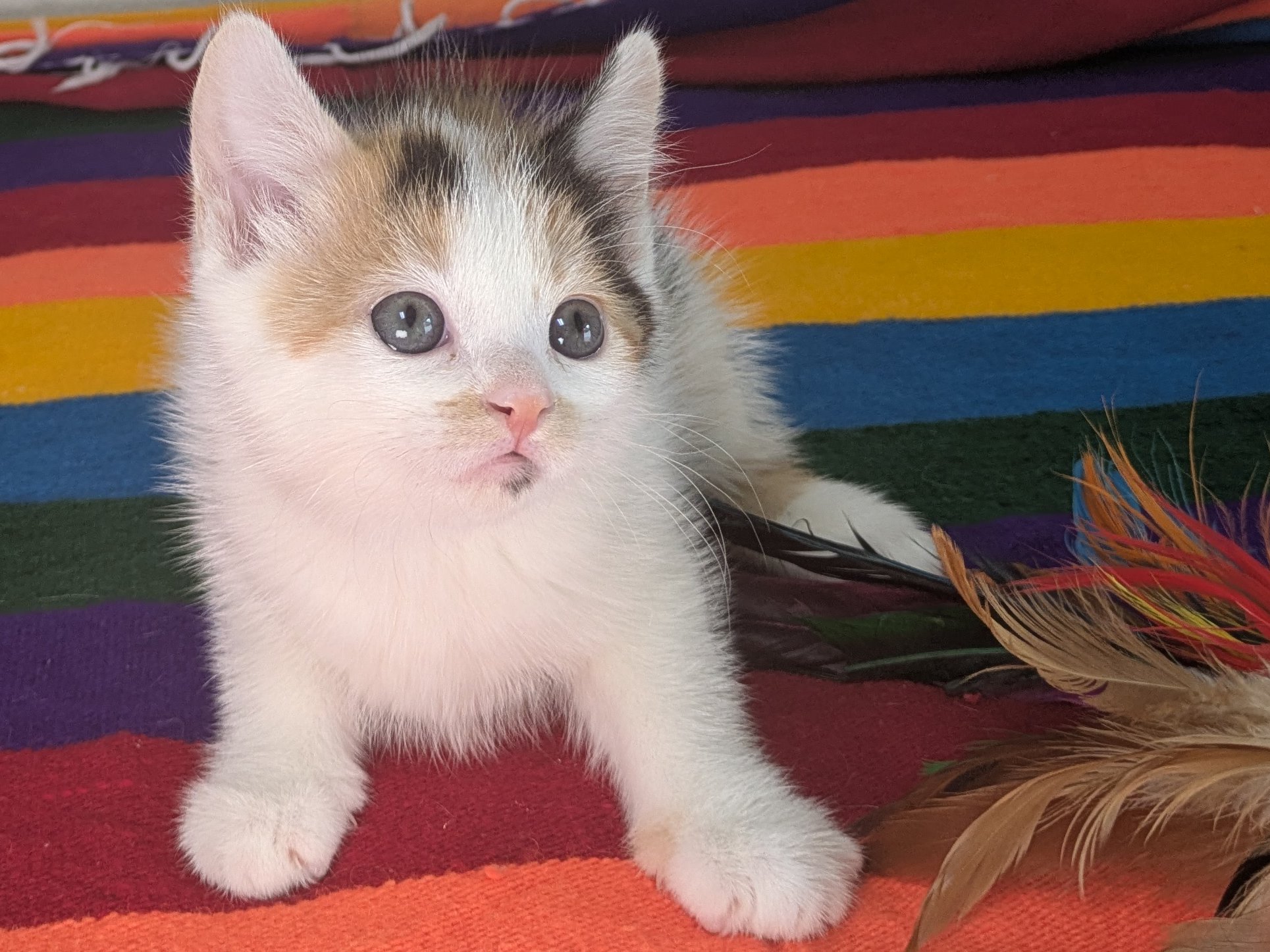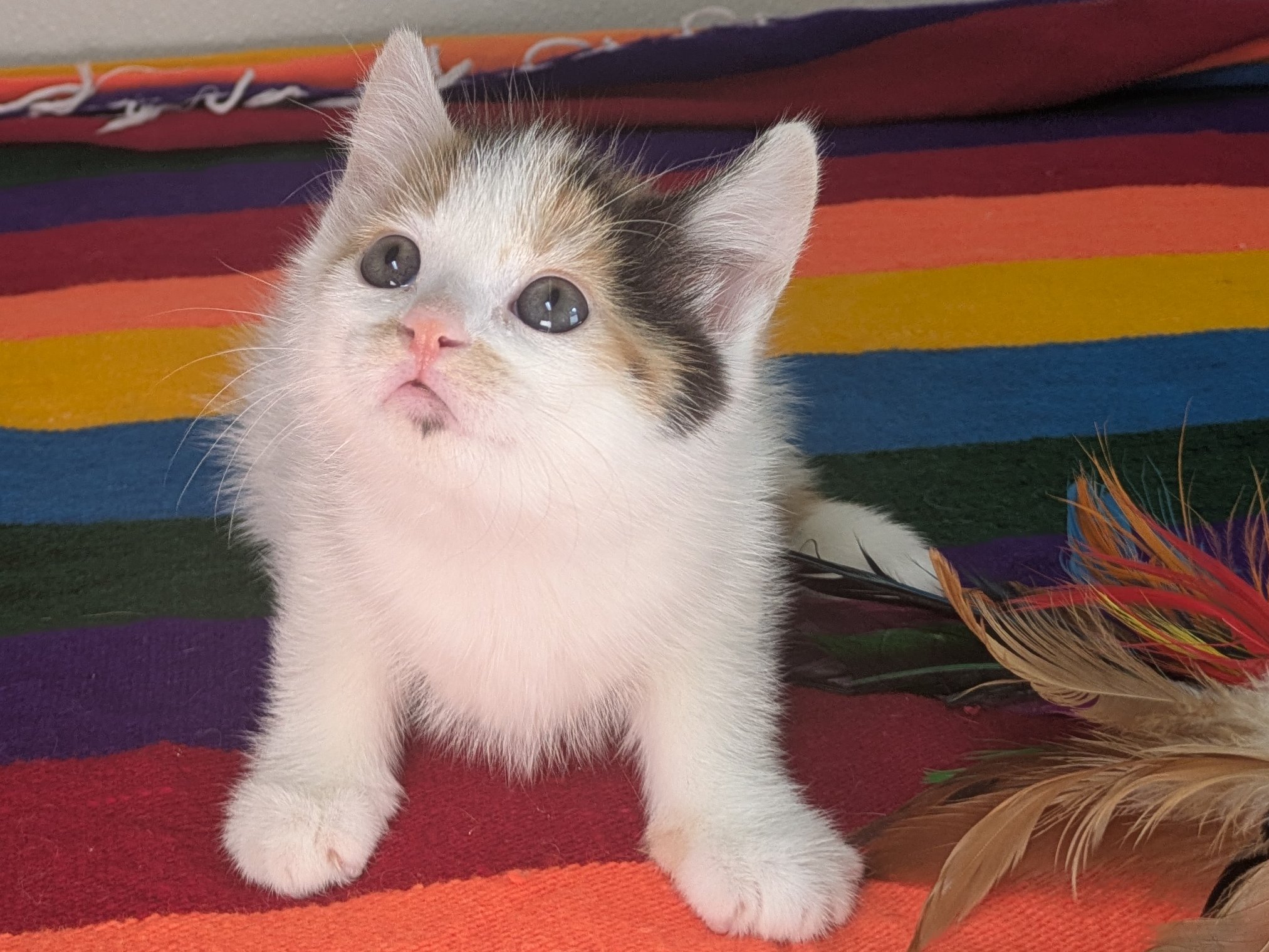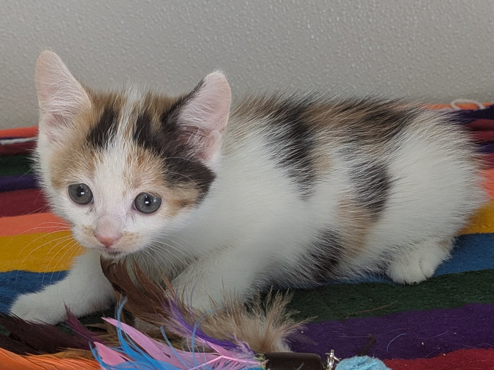 Please do not call the shelter; do the application first. Introducing the Green litter of kittens. These sweet babies were born at the shelter on 8/31/25 to Kalispell (also up for adoption), and will be ready to go home in mid-November. This litter includes: BASIL - female calico, mix of black and orange on either side of face PINE - female calico, symmetrical orange wings on either side of face FOREST - female black & white, black triangle in center of face, thin white forehead stripe MINT - male black & white, many black asymmetric splotches on face, most outgoing OLIVE - female black & white, tiny black mustache & goatee, sweet and sensitive They are just starting to get used to some time away from mama, and are slowly developing their purrrrsonalities. So far, we know that Mint is the Steve Martin of the bunch - a "wild and crazy guy" - while his sisters are a little bit more cautious about leaping into new situations. All should adapt quickly to their new homes and families, and will make terrific companions. They are young enough to learn about dogs and other cats, too! We'd love to see all kittens go to homes that have another young, playful kitten, or to send 2 of them out as a pair (which gives you a great pair discount rate), but we do not require pair adoptions. If you prefer to adopt just one, and you don't have a similarly aged kitten at home already, please read our information on Single Kitten Syndrome. Then, when you apply for a single kitten, please let us know in the "Comments" field how you plan to deal with the "kitten crazies." All pets arrive spayed/neutered, dewormed, microchipped and vaccinated. Adoption fee for Basil is a suggested minimum of $75 (more gratefully accepted). All pets are placed with a 30-day money-back trial period, to give pet and family enough time to discover any unknown allergies or other conflicts. Can't come to Republic? Don't let that stop you! We have monthly transports to the Seattle area, delivering adopted pets to their new owners. If you can add a little to your donation to help us cover our volunteer driver's expenses, that would be great!
