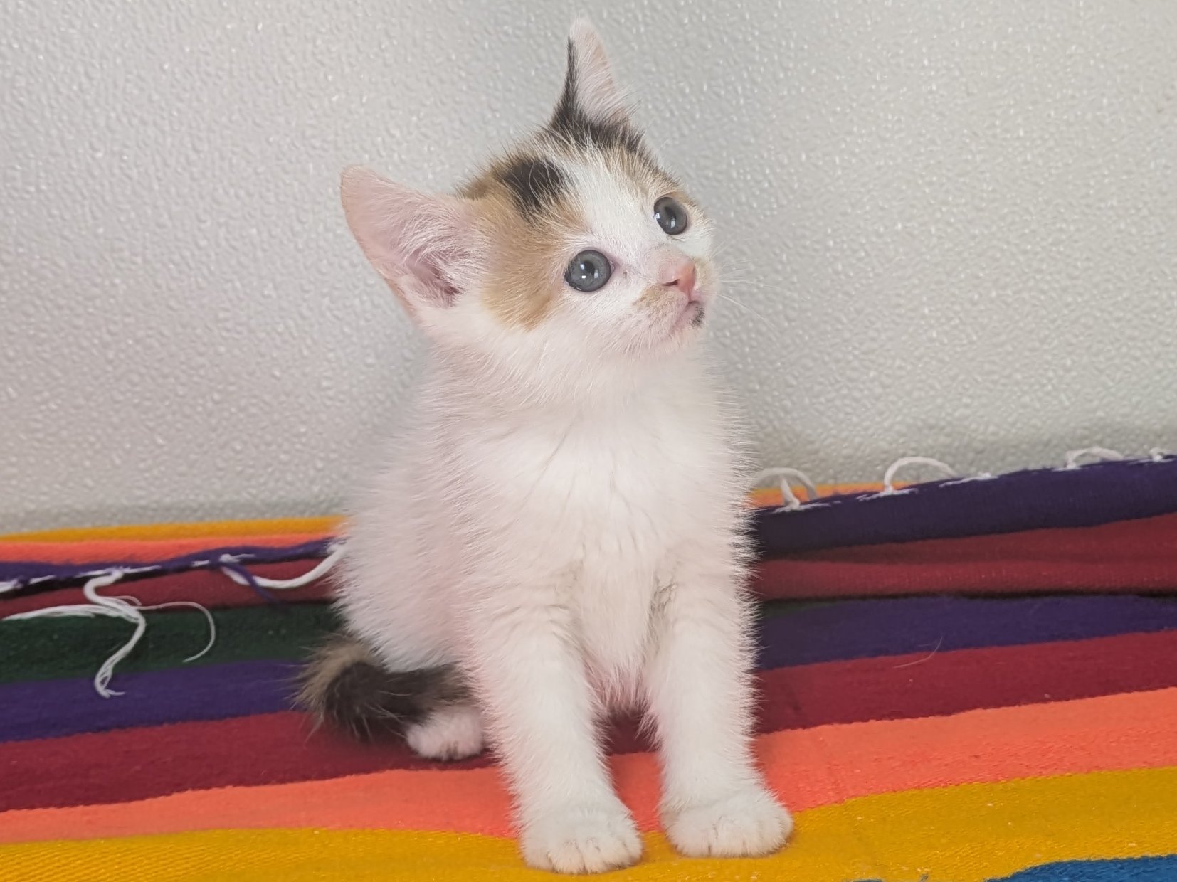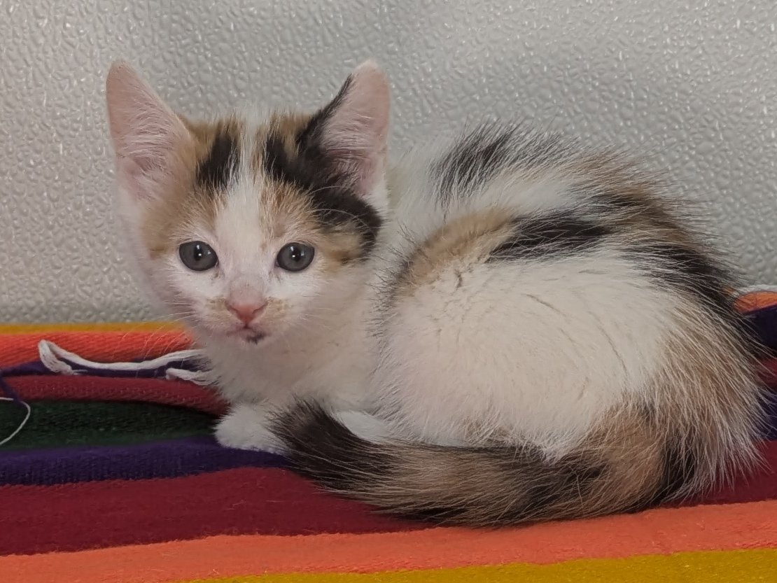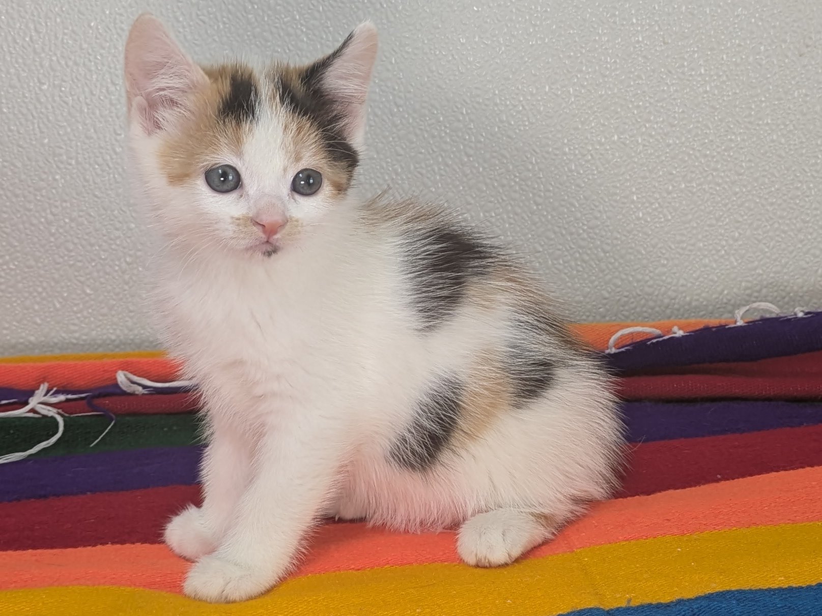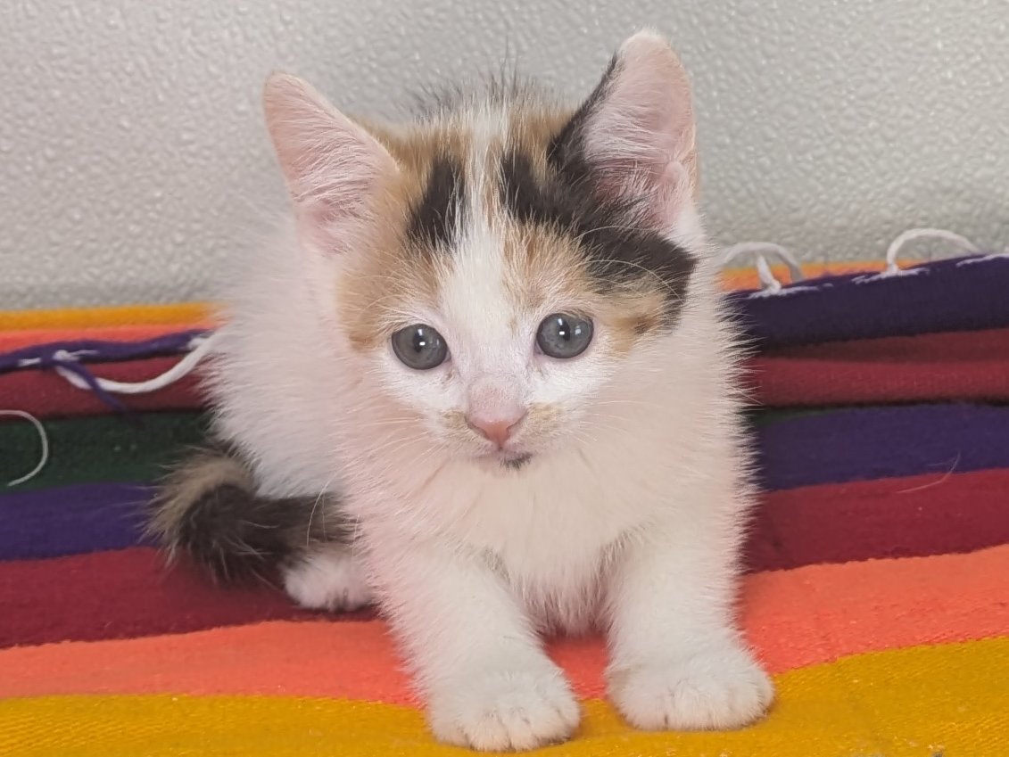 Please do not call the shelter; do the application first. Introducing the Green litter of kittens. These sweet babies were born at the shelter on 8/31/25 to Kalispell (also up for adoption), and will be ready to go home in mid-November. This litter includes: BASIL - female calico, mix of black and orange on either side of face PINE - female calico, symmetrical orange wings on either side of face FOREST - female black & white, black triangle in center of face, thin white forehead stripe MINT - male black & white, many black asymmetric splotches on face, most outgoing OLIVE - female black & white, tiny black mustache & goatee, sweet and sensitive They are just starting to get used to some time away from mama, and are slowly developing their purrrrsonalities. So far, we know that Mint is the Steve Martin of the bunch - a "wild and crazy guy" - while his sisters are a little bit more cautious about leaping into new situations. All should adapt quickly to their new homes and families, and will make terrific companions. They are young enough to learn about dogs and other cats, too! We'd love to see all kittens go to homes that have another young, playful kitten, or to send 2 of them out as a pair (which gives you a great pair discount rate), but we do not require pair adoptions. If you prefer to adopt just one, and you don't have a similarly aged kitten at home already, please read our information on Single Kitten Syndrome. Then, when you apply for a single kitten, please let us know in the "Comments" field how you plan to deal with the "kitten crazies." All pets arrive spayed/neutered, dewormed, microchipped and vaccinated. Adoption fee for Basil is a suggested minimum of $75 (more gratefully accepted). All pets are placed with a 30-day money-back trial period, to give pet and family enough time to discover any unknown allergies or other conflicts. Can't come to Republic? Don't let that stop you! We have monthly transports to the Seattle area, delivering adopted pets to their new owners. If you can add a little to your donation to help us cover our volunteer driver's expenses, that would be great!
