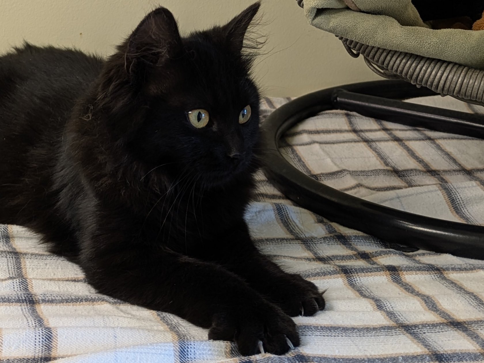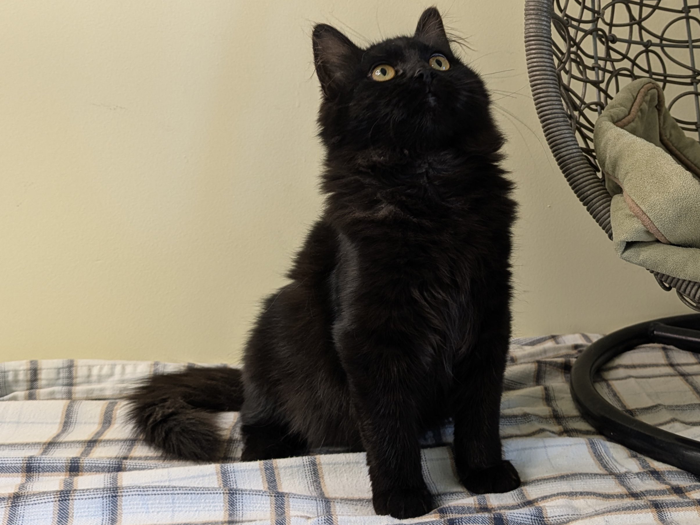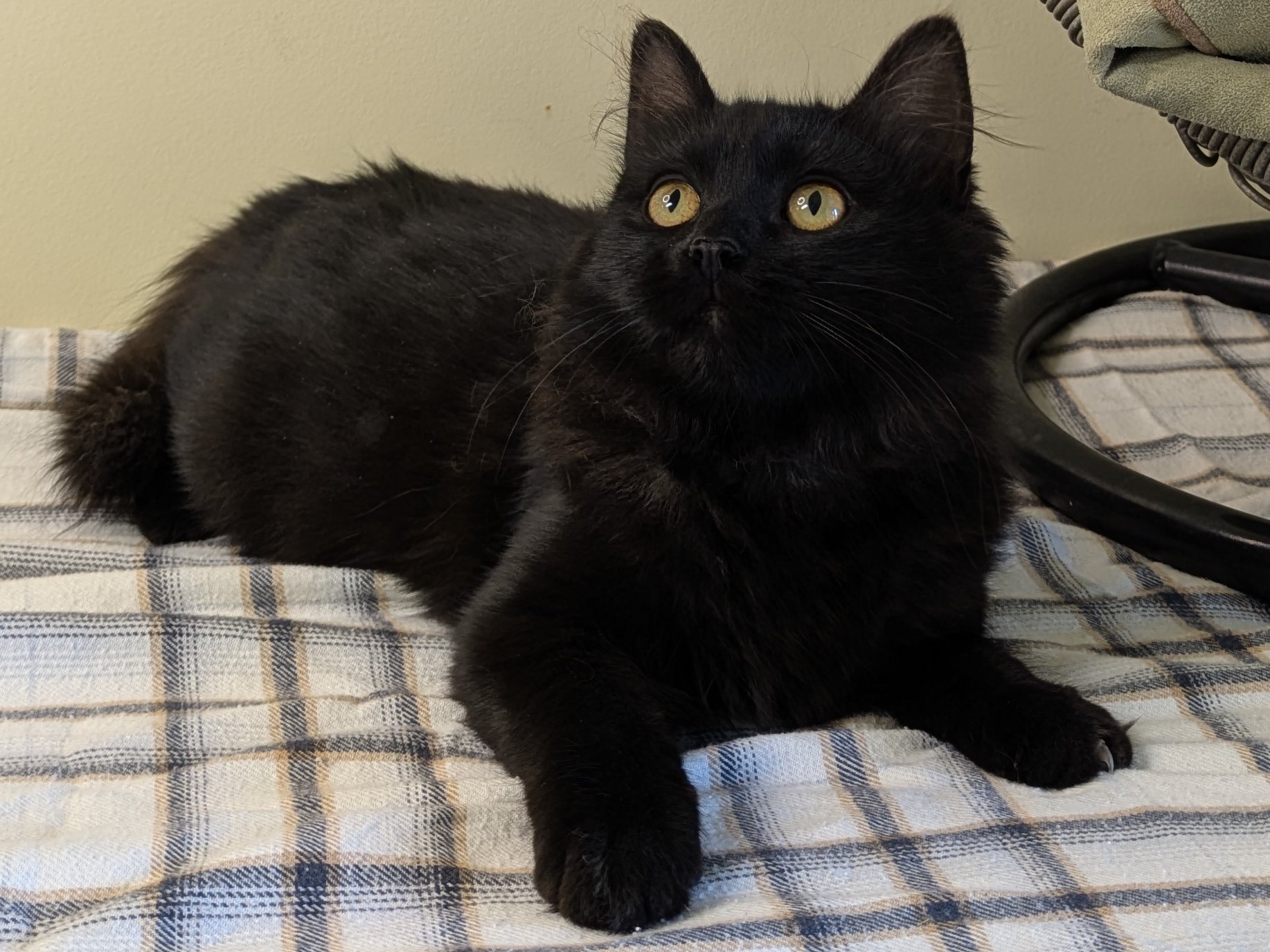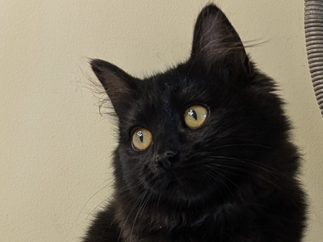 Please do not call the shelter; do the application first. Ebony and her sisters Shadow and Raven, born about 7/7/25, were found abandoned, living fearlessly with a large pack of dogs on a remote property. These girls are affectionate, playful, and really grateful for a warm place to sleep and endless kitty kibble. They are obviously dog friendly, and great with cats too. They could do well in indoor/outdoor homes as they have some street smarts from their time spent fending for themselves, though would also adapt just fine to being indoor kitties. They would appreciate some big windows and/or a catio, some snuggles, some wand-toy play sessions, and a continuation of the kibble, please. These girls are: EBONY - black domestic medium-long hair RAVEN - black domestic medium-long hair SHADOW - tortoiseshell medium-long hair Video Coming Soon We'd love to see all kittens go to homes that have another young, playful kitten, or to send 2 of them out as a pair (which gives you a great pair discount rate), but we do not require pair adoptions. If you prefer to adopt just one, and you don't have a similarly aged kitten at home already, please read our information on Single Kitten Syndrome. Then, when you apply for a single kitten, please let us know in the "Comments" field how you plan to deal with the "kitten crazies." All pets arrive spayed/neutered, dewormed, microchipped and vaccinated. Adoption fee for Ebony is a suggested minimum of $75 (more gratefully accepted). All pets are placed with a 30-day money-back trial period, to give pet and family enough time to discover any unknown allergies or other conflicts. Can't come to Republic? Don't let that stop you! We have monthly transports to the Seattle area, delivering adopted pets to their new owners. If you can add a little to your donation to help us cover our volunteer driver's expenses, that would be great!