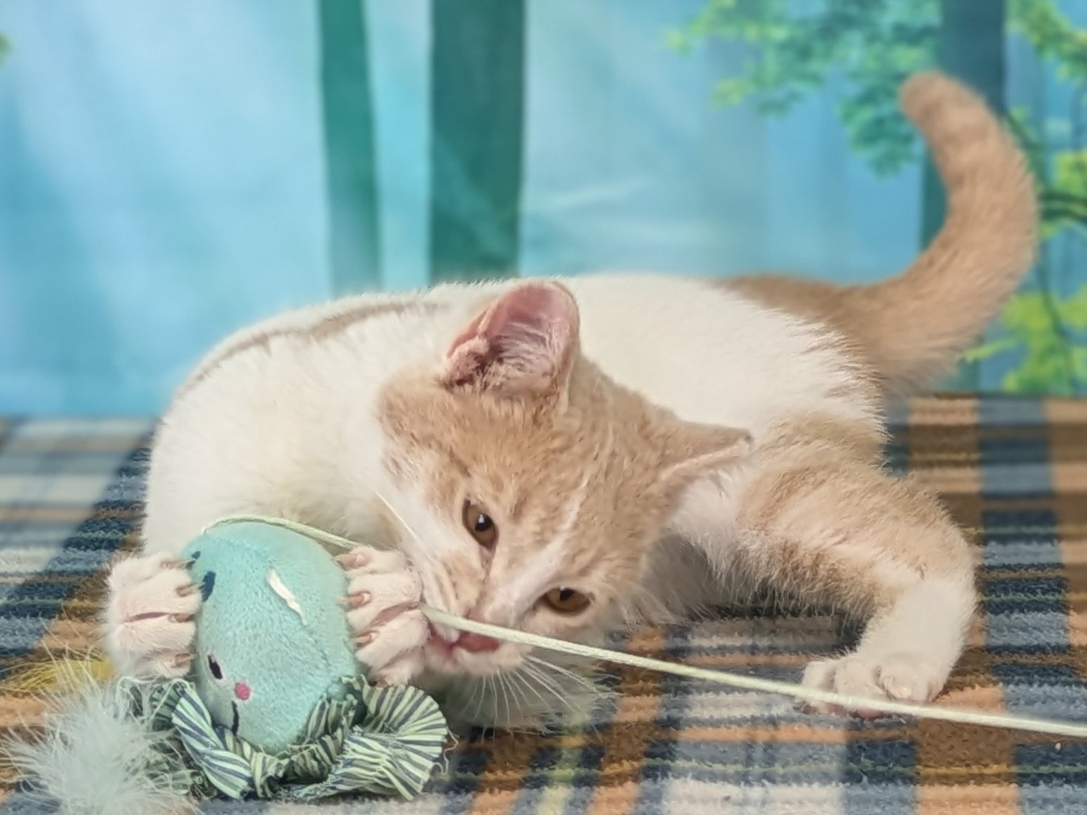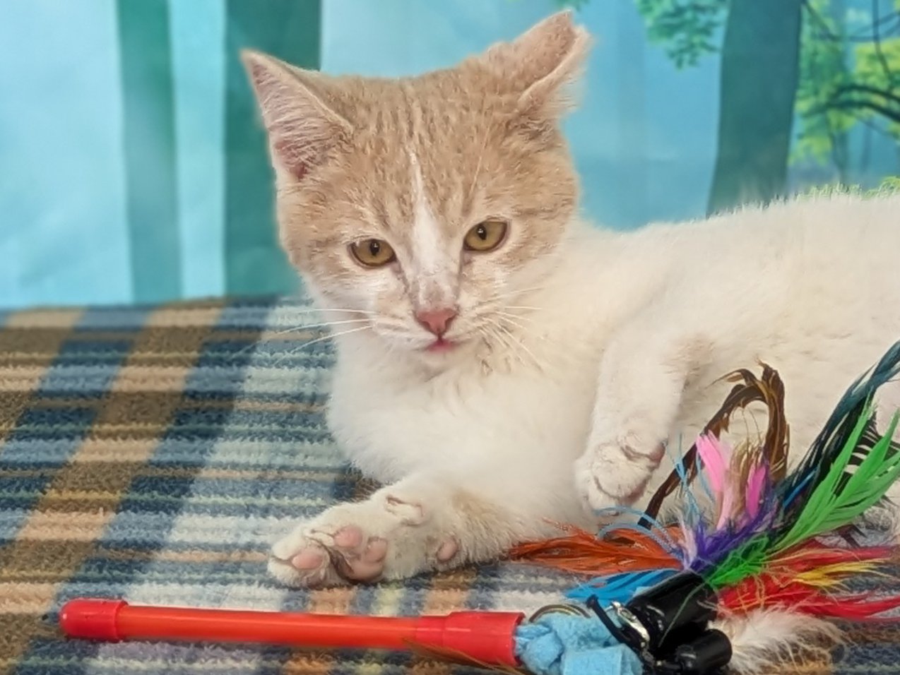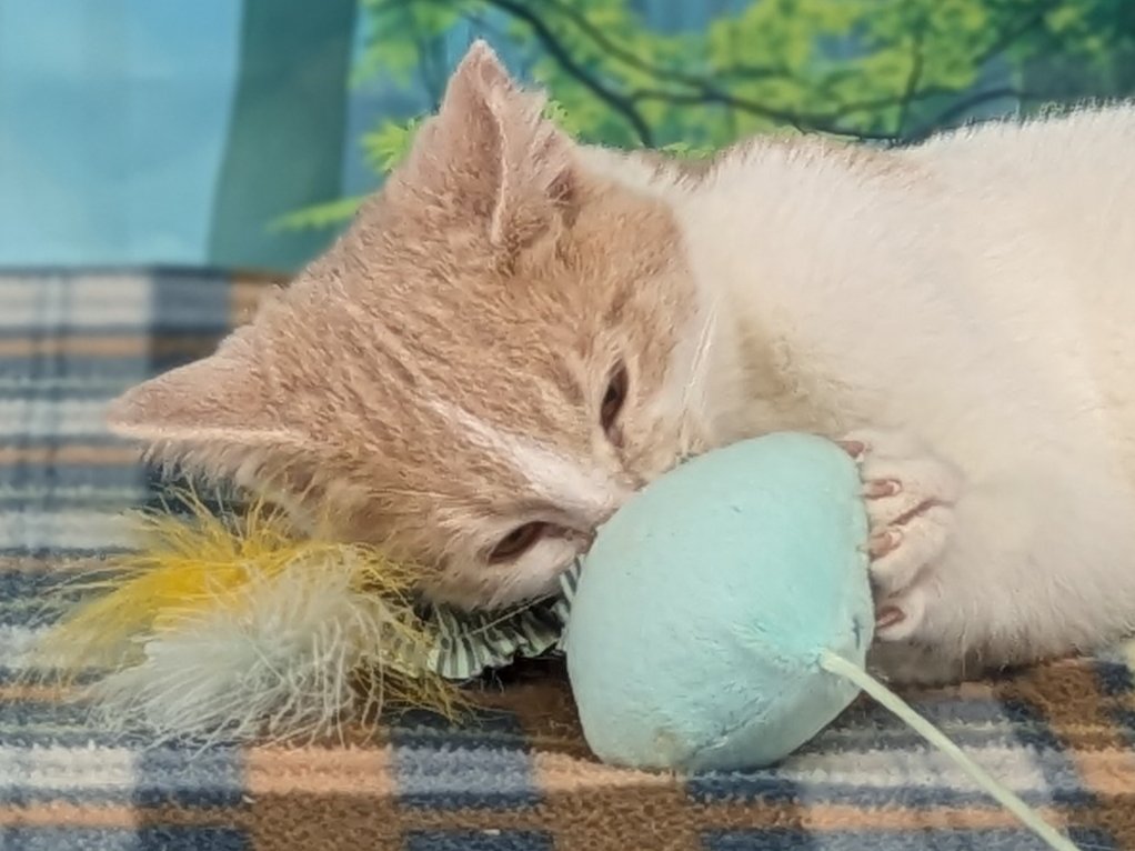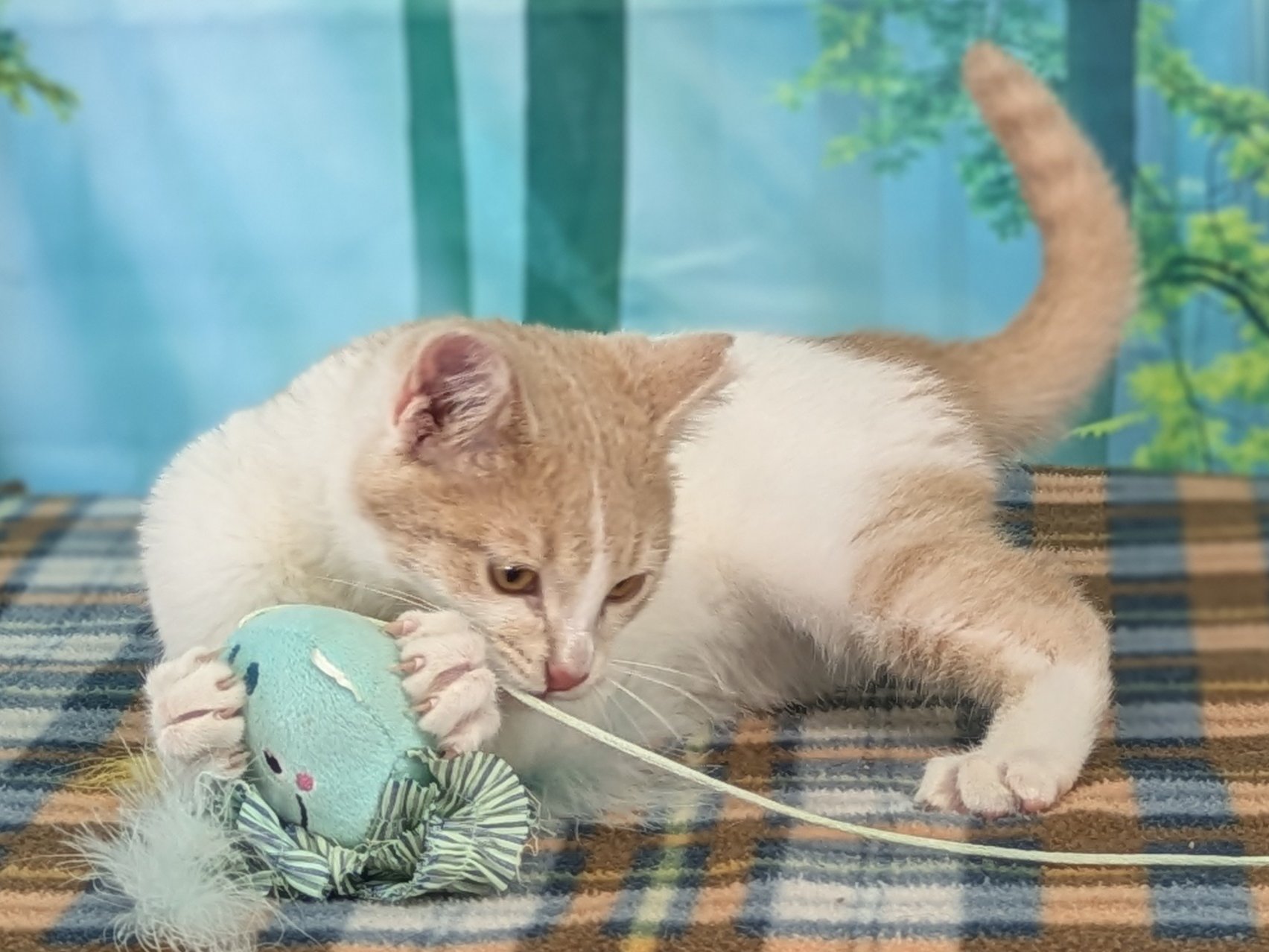 Please do not call the shelter; do the application first. Introducing the Winter Drinks litter - a late 2025 litter of kittens, born about 10/2/25 and rescued during a Trap-Neuter-Return operation on a local feral colony. These three brothers were spared from being returned to live out their lives as part of their feral colony when they showed us their playful, ready-to-accept-humans sides! We are relieved that they have proven to be FAMILY QUALITY rather than as wild as a band of hyped-up raccoons, because their coloring is not conducive to a long life as a feral cat. Instead, these boys get to become beloved family members, YAY! They have a fair dose of caution in their makeup, so may take a little extra time to fully adapt to new people and places, but give them a fun toy and a taste of a Churu treat, and they turn into lap kittens quickly. They are easier to tell apart than you think: CHAI - the most white - almost his entire body is white except for his head and tail TODDY - the most orange - nearly his entire left side of his body is orange EGGNOG - the in-between brother, white with orange splotches here and there! See if you can tell them apart in their video, while you try to decide if you want to bring one home... or two... or all three! They are young enough that they should adapt fine to existing pets, with proper introductions. We'd love to see all kittens go to homes that have another young, playful kitten, or to send 2 of them out as a pair (which gives you a great pair discount rate), but we do not require pair adoptions. If you prefer to adopt just one, and you don't have a similarly aged kitten at home already, please read our information on Single Kitten Syndrome. Then, when you apply for a single kitten, please let us know in the "Comments" field how you plan to deal with the "kitten crazies." All pets arrive spayed/neutered, dewormed, microchipped and vaccinated. Adoption fee for Eggnog is a suggested minimum of $75 (more gratefully accepted). All pets are placed with a 30-day money-back trial period, to give pet and family enough time to discover any unknown allergies or other conflicts. Can't come to Republic? Don't let that stop you! We have monthly transports to the Seattle area, delivering adopted pets to their new owners. If you can add a little to your donation to help us cover our volunteer driver's expenses, that would be great!