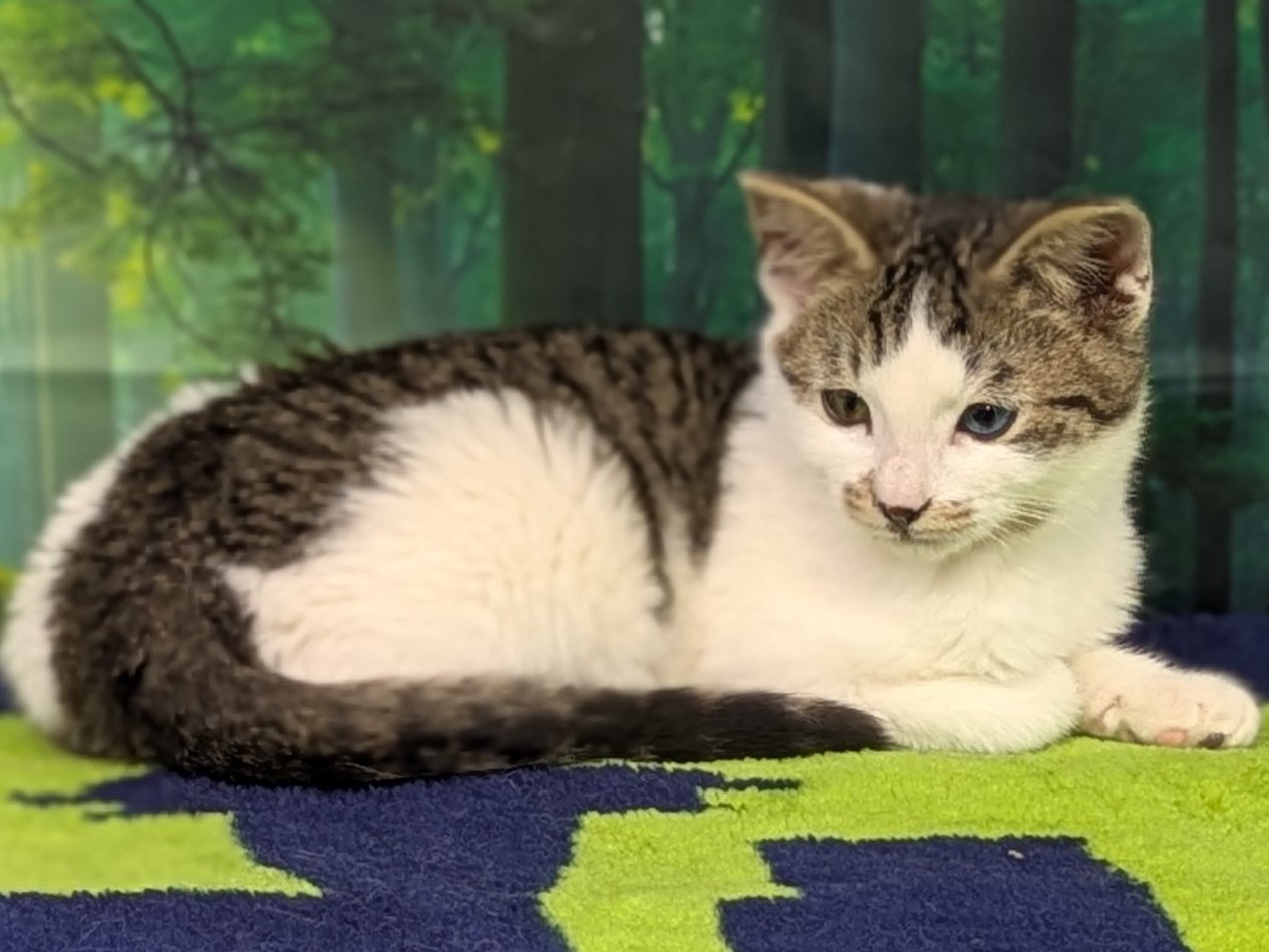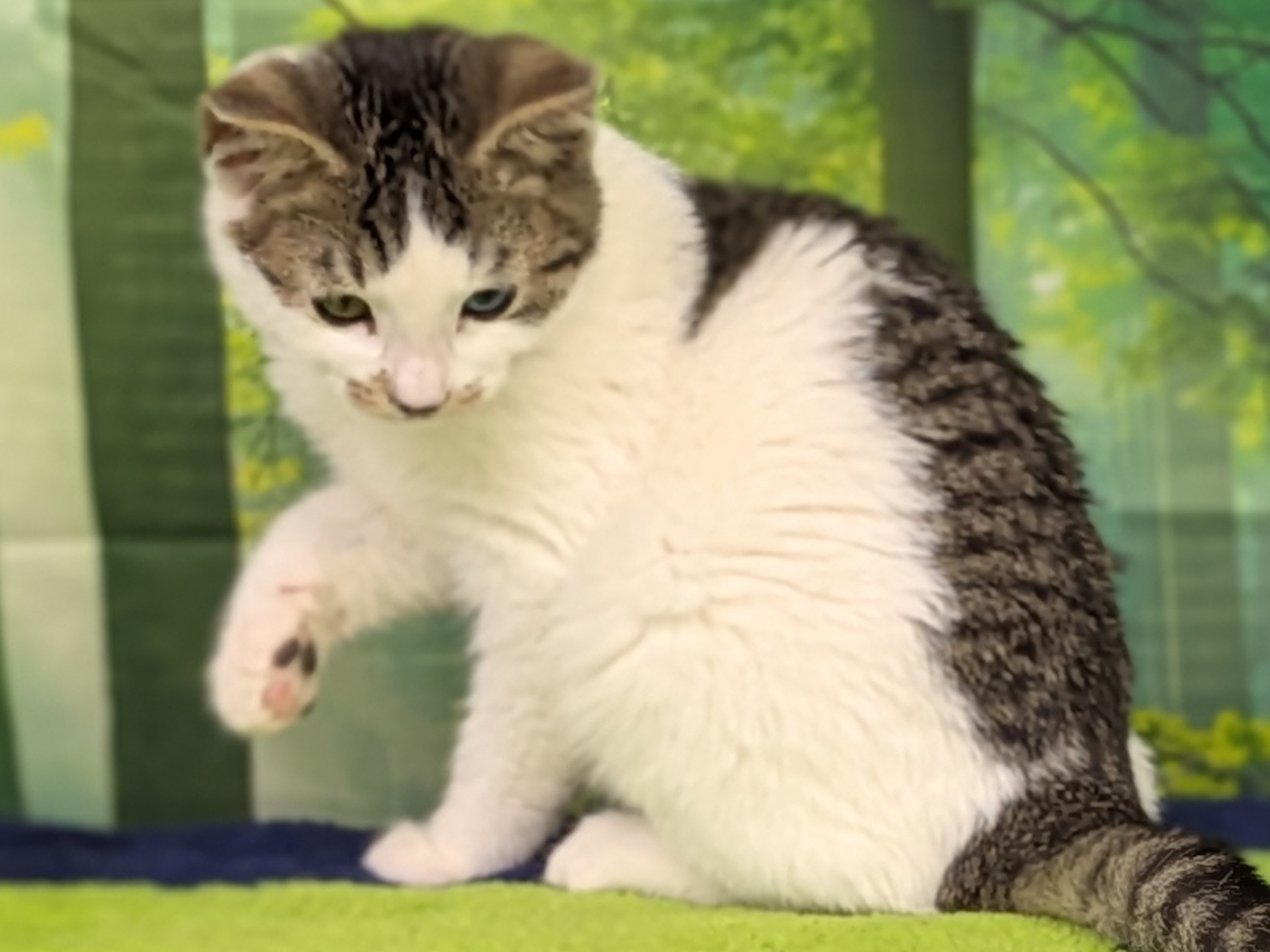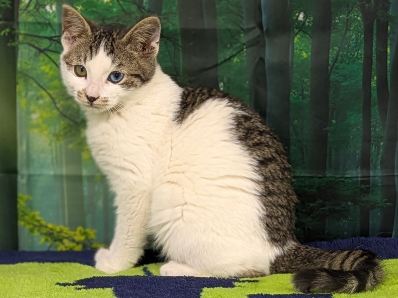 Please do not call the shelter; do the application first. Introducing the Mexican Food litter! These cuties were born about 8/20/25, and came to Forget Me Not as part of a trap-neuter-return operation on a feral colony. These five were just too friendly for colony life, so they get the opportunity to become beloved family members! This group includes: FAJITA - female brown tabby with white, playful and outgoing CHIMICHANGA - male grey tabby, playful and outgoing CARNE - male white with tabby patches, one blue eye, one green eye, fostering with Margarita for socialization - currently shy with strangers, no video yet MARGARITA - female white with light grey tabby patches, fostering with Carne for socialization - currently shy with strangers, no video yet PICO - male brown tabby with white, slightly shy with strangers Video Coming Soon We'd love to see all kittens go to homes that have another young, playful kitten, or to send 2 of them out as a pair (which gives you a great pair discount rate), but we do not require pair adoptions. If you prefer to adopt just one, and you don't have a similarly aged kitten at home already, please read our information on Single Kitten Syndrome. Then, when you apply for a single kitten, please let us know in the "Comments" field how you plan to deal with the "kitten crazies." All pets arrive spayed/neutered, dewormed, microchipped and vaccinated. Adoption fee for Carne is a suggested minimum of $75 (more gratefully accepted). All pets are placed with a 30-day money-back trial period, to give pet and family enough time to discover any unknown allergies or other conflicts. Can't come to Republic? Don't let that stop you! We have monthly transports to the Seattle area, delivering adopted pets to their new owners. If you can add a little to your donation to help us cover our volunteer driver's expenses, that would be great!