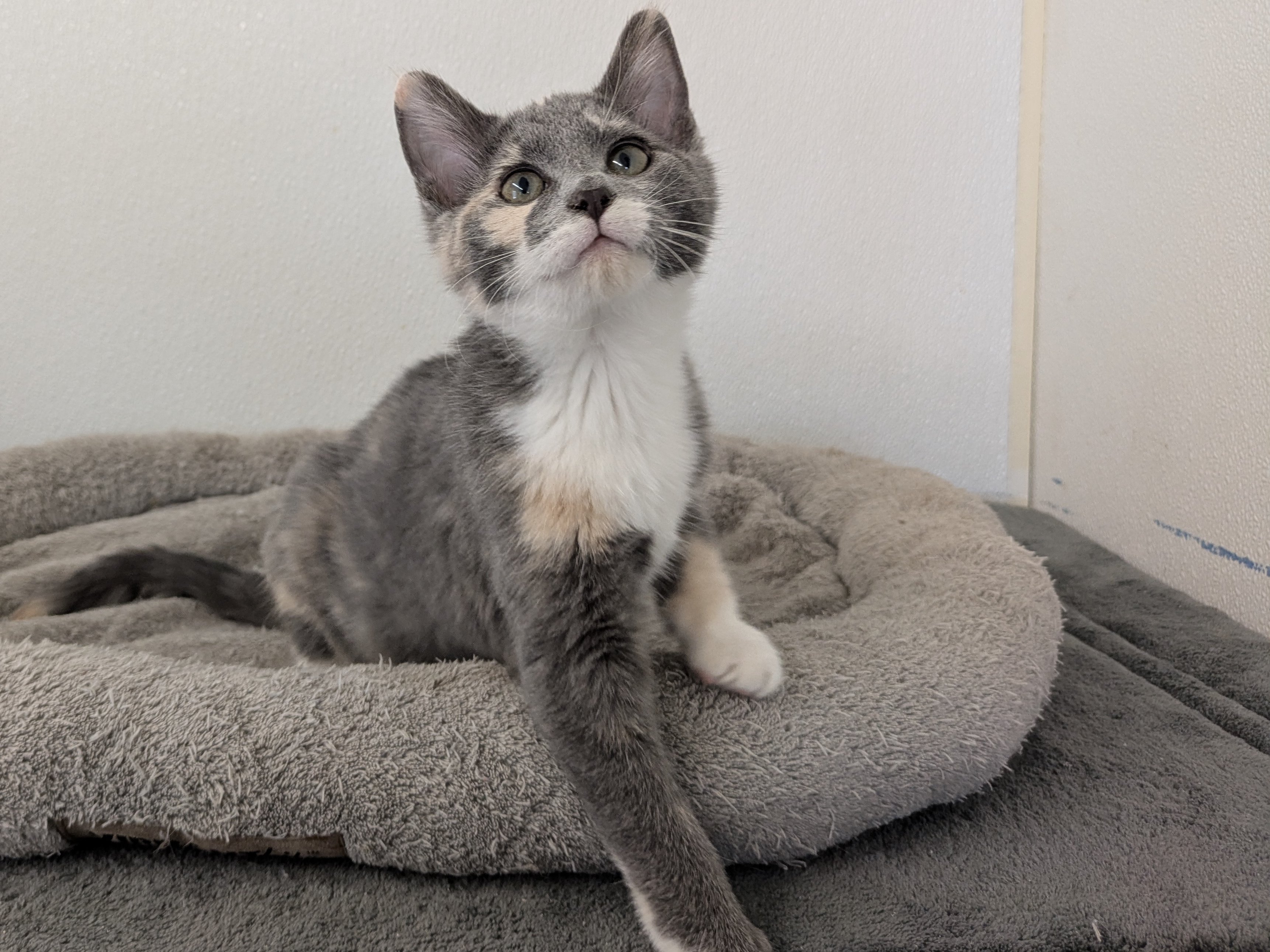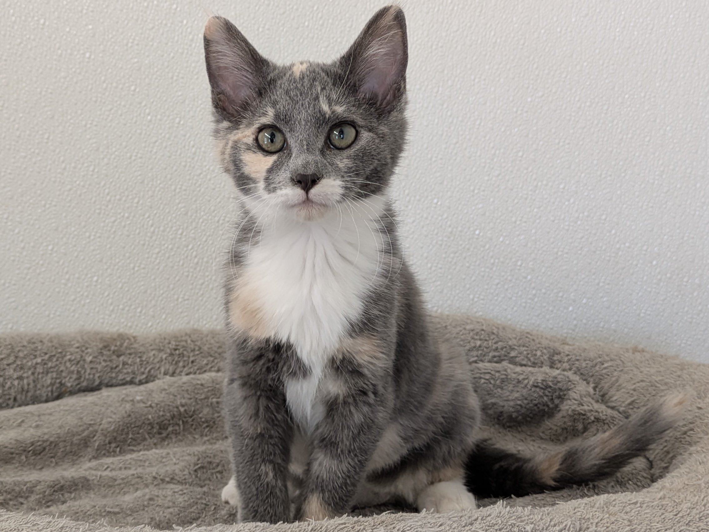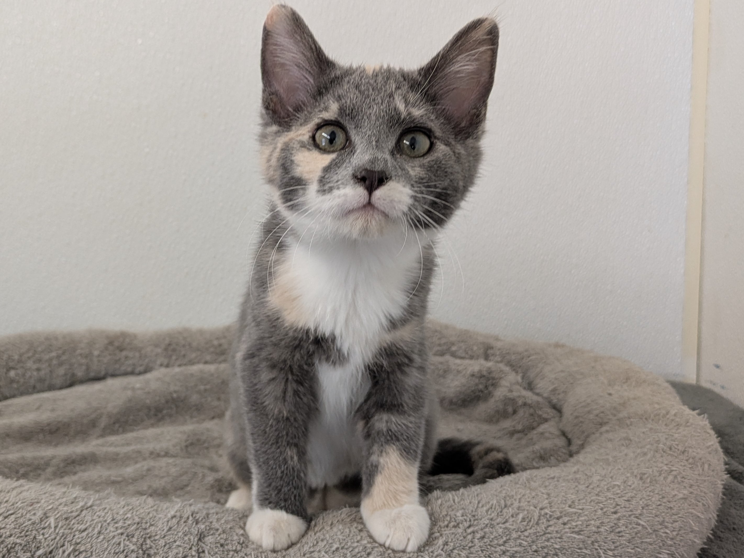 Please do not call the shelter; do the application first. This summer, Forget Me Not took on a major Trap-Neuter-Return (TNR) project involving nearly 100 cats and kittens. Thankfully, many of the youngest kittens were friendly and full of potential — perfect candidates for our Happy Homes Adoption Program! These little ones are now safe, thriving, and ready to start their new lives in loving forever homes. Because so many similarly aged kittens came in over just a few days of trapping, it’s hard to tell exactly who came from which litter. So, we’ve grouped them by approximate age instead — all the kittens with the "SEE" designation can be mixed and matched for adoption. They’re all sweet, playful, and well-socialized, and they’d love to go home with a buddy (or two!). The first group of “SEE” kittens are estimated to have been born between June 12 and June 18, and they're now ready to meet their forever families. If you're looking for one or a pair of adorable, affectionate kittens to brighten your home, check out our “SEE” crew — your new best friends might be waiting for you! Baby Ruth is a short haired dilute tortoiseshell with white girl, a little cautious with strangers. We'd love to see all kittens go to homes that have another young, playful kitten, or to send 2 of them out as a pair (which gives you a great pair discount rate), but we do not require pair adoptions. If you prefer to adopt just one, and you don't have a similarly aged kitten at home already, please read our information on Single Kitten Syndrome. Then, when you apply for a single kitten, please let us know in the "Comments" field how you plan to deal with the "kitten crazies." All pets arrive spayed/neutered, dewormed, microchipped and vaccinated. Adoption fee for Baby Ruth is a suggested minimum of $75 (more gratefully accepted). All pets are placed with a 30-day money-back trial period, to give pet and family enough time to discover any unknown allergies or other conflicts. Can't come to Republic? Don't let that stop you! We have monthly transports to the Seattle area, delivering adopted pets to their new owners. If you can add a little to your donation to help us cover our volunteer driver's expenses, that would be great!