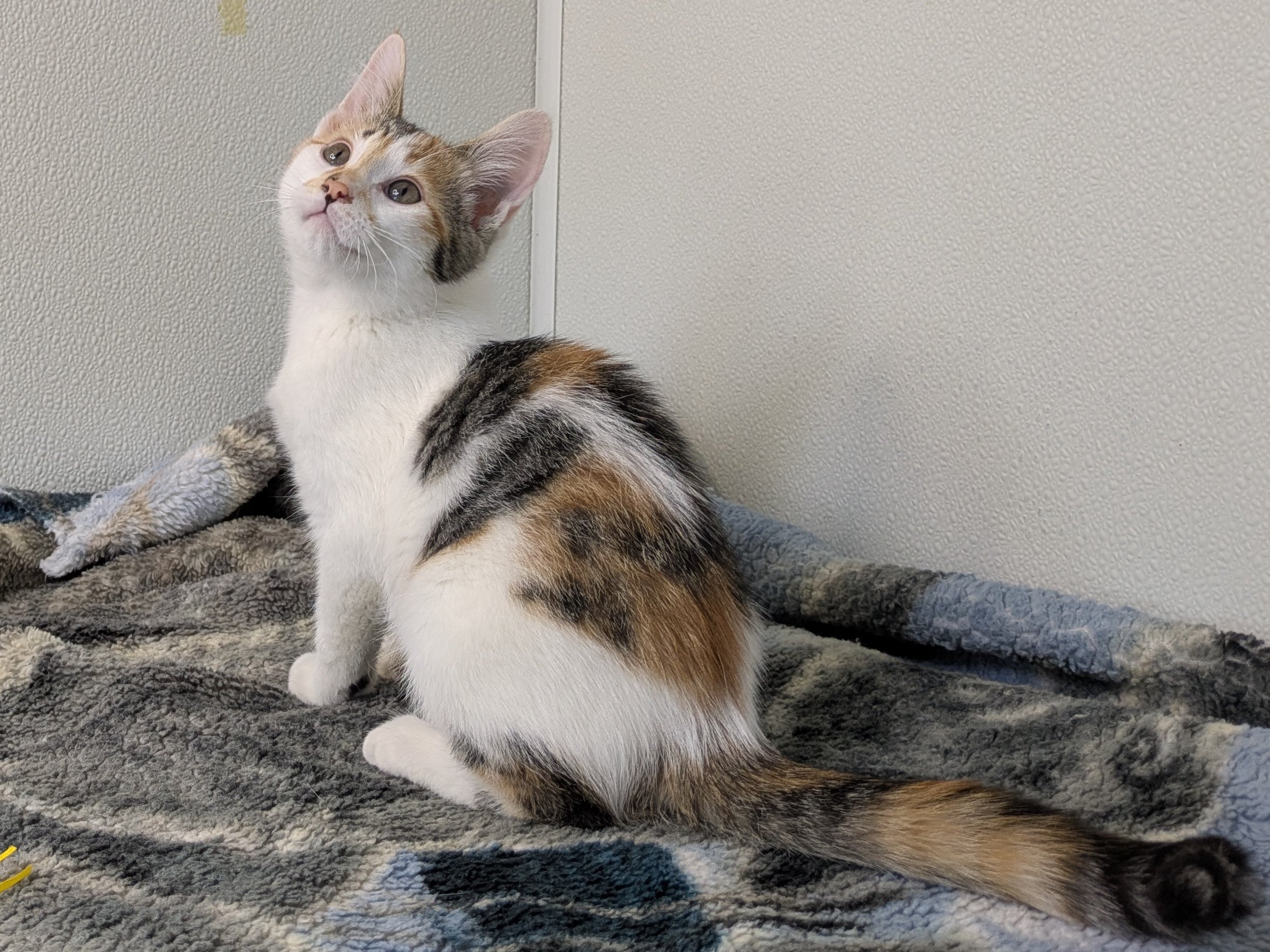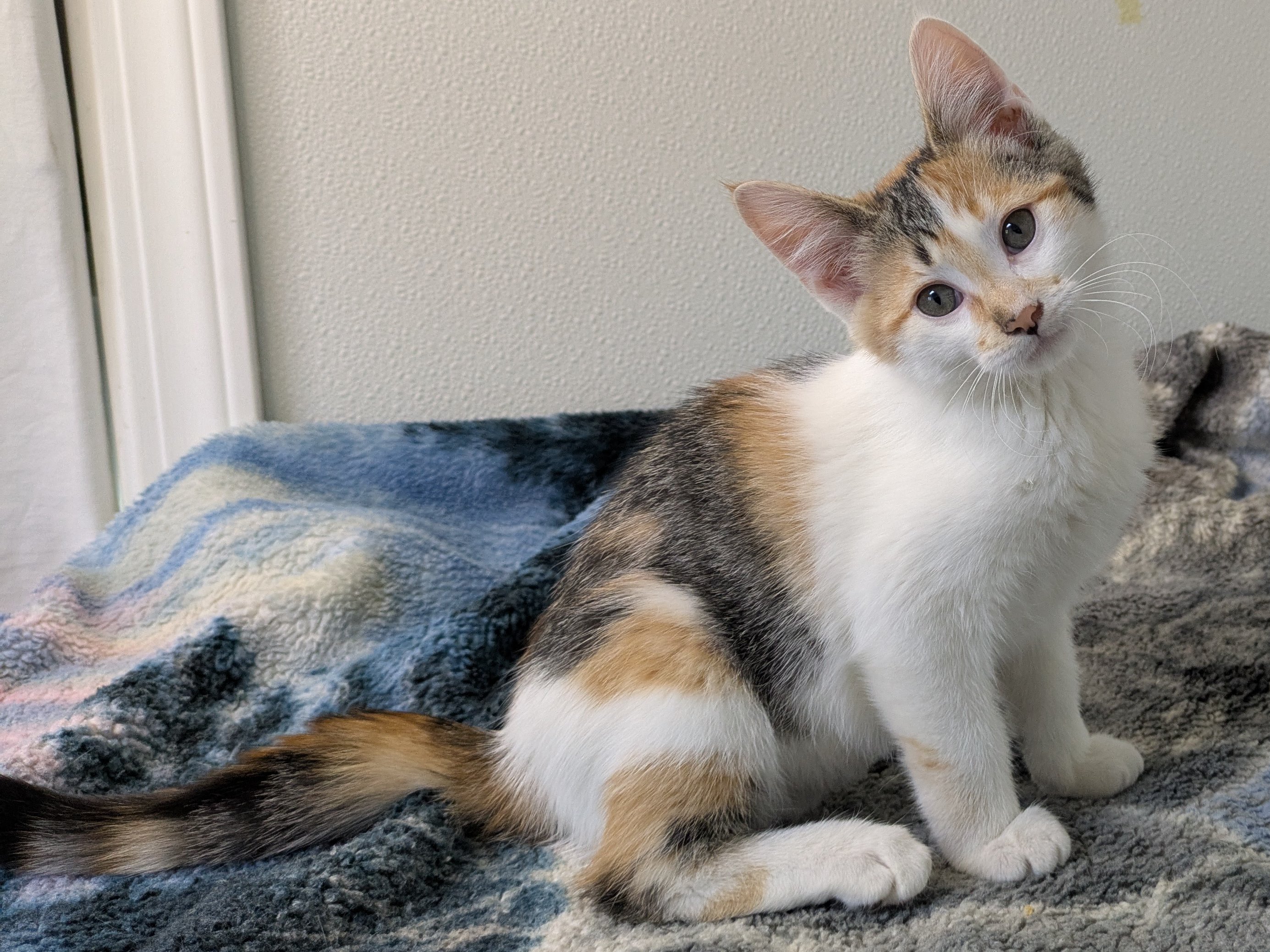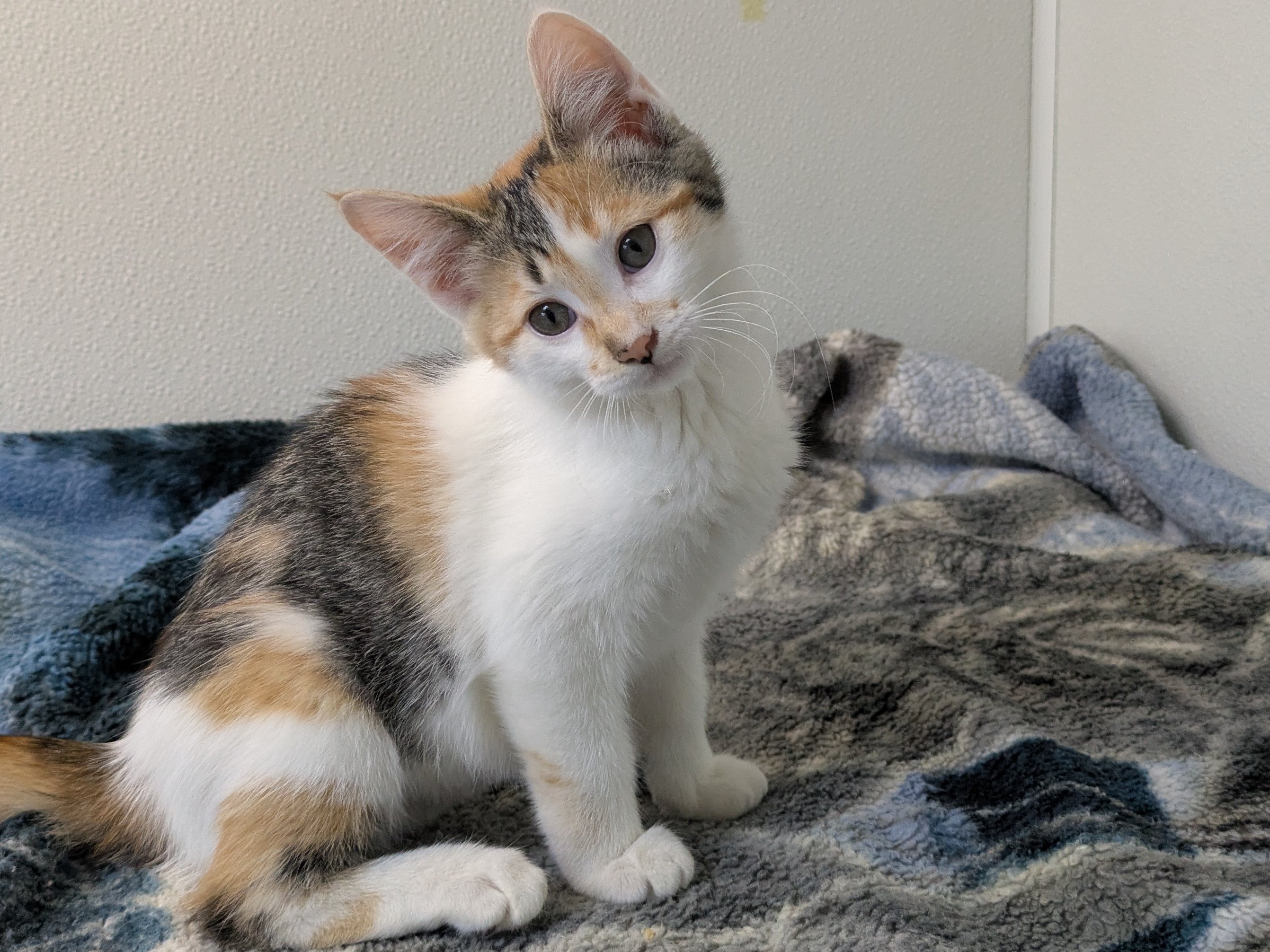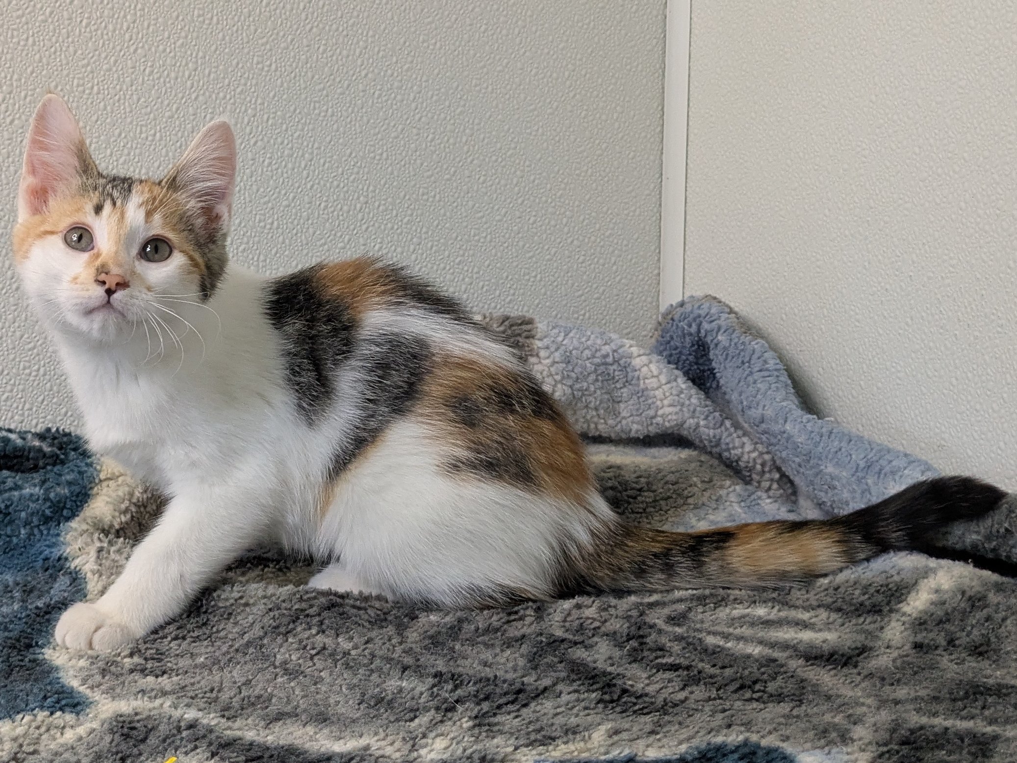 Please do not call the shelter; do the application first. This summer, Forget Me Not took on a major Trap-Neuter-Return (TNR) project involving nearly 100 cats and kittens. Thankfully, many of the youngest kittens were friendly and full of potential — perfect candidates for our Happy Homes Adoption Program! These little ones are now safe, thriving, and ready to start their new lives in loving forever homes. Because so many similarly aged kittens came in over just a few days of trapping, it’s hard to tell exactly who came from which litter. So, we’ve grouped them by approximate age instead — all the kittens with the "SEE" designation can be mixed and matched for adoption. They’re all sweet, playful, and well-socialized, and they’d love to go home with a buddy (or two!). This group of “SEE” kittens are estimated to have been born between July 1 and July 5, and they're now ready to meet their forever families. If you're looking for one or a pair of adorable, affectionate kittens to brighten your home, check out our “SEE” crew — your new best friends might be waiting for you! Godiva is a short hair female tabico (tabby-calico) with white. Video Coming Soon We'd love to see all kittens go to homes that have another young, playful kitten, or to send 2 of them out as a pair (which gives you a great pair discount rate), but we do not require pair adoptions. If you prefer to adopt just one, and you don't have a similarly aged kitten at home already, please read our information on Single Kitten Syndrome. Then, when you apply for a single kitten, please let us know in the "Comments" field how you plan to deal with the "kitten crazies." All pets arrive spayed/neutered, dewormed, microchipped and vaccinated. Adoption fee for Godiva is a suggested minimum of $75 (more gratefully accepted). All pets are placed with a 30-day money-back trial period, to give pet and family enough time to discover any unknown allergies or other conflicts. Can't come to Republic? Don't let that stop you! We have monthly transports to the Seattle area, delivering adopted pets to their new owners. If you can add a little to your donation to help us cover our volunteer driver's expenses, that would be great!