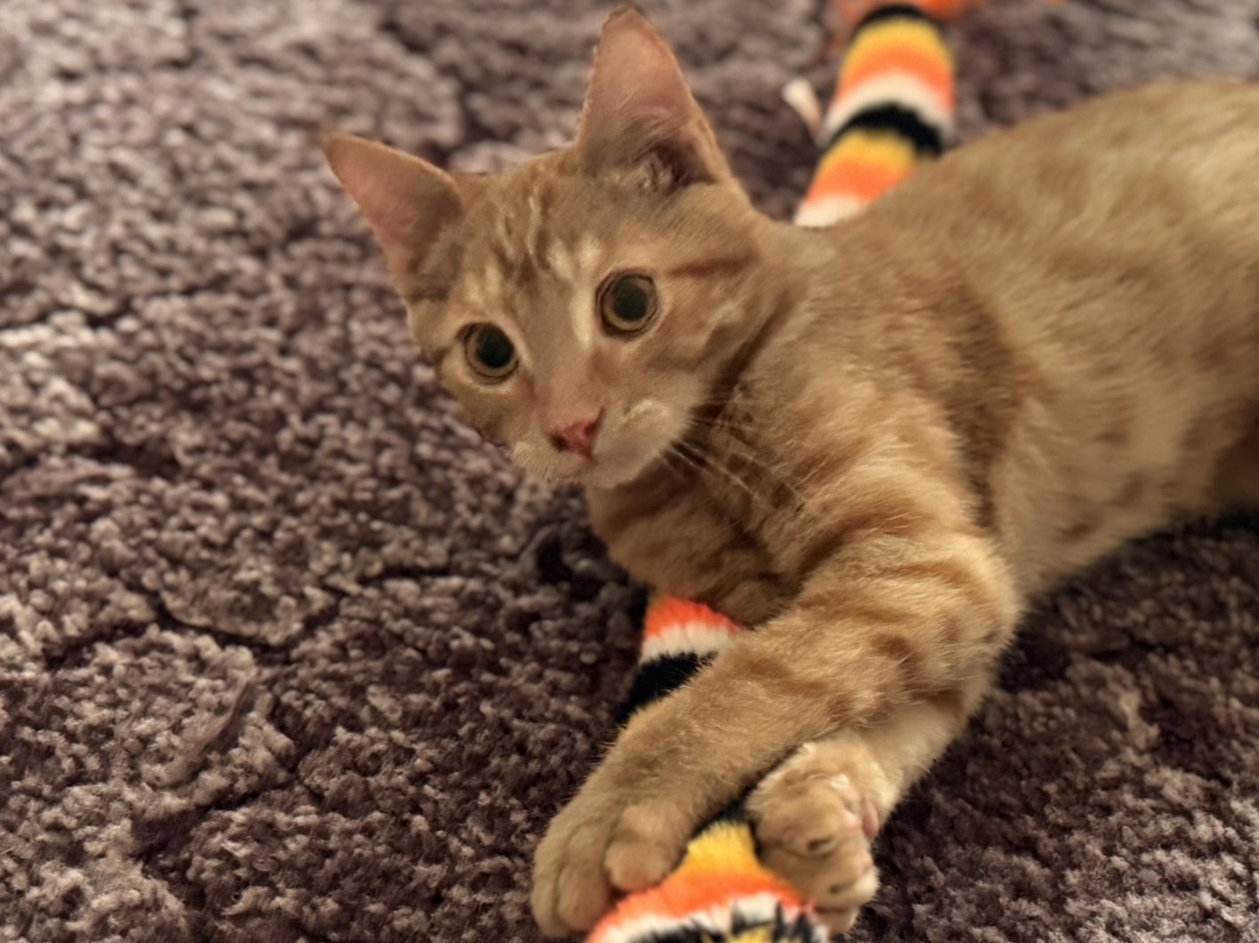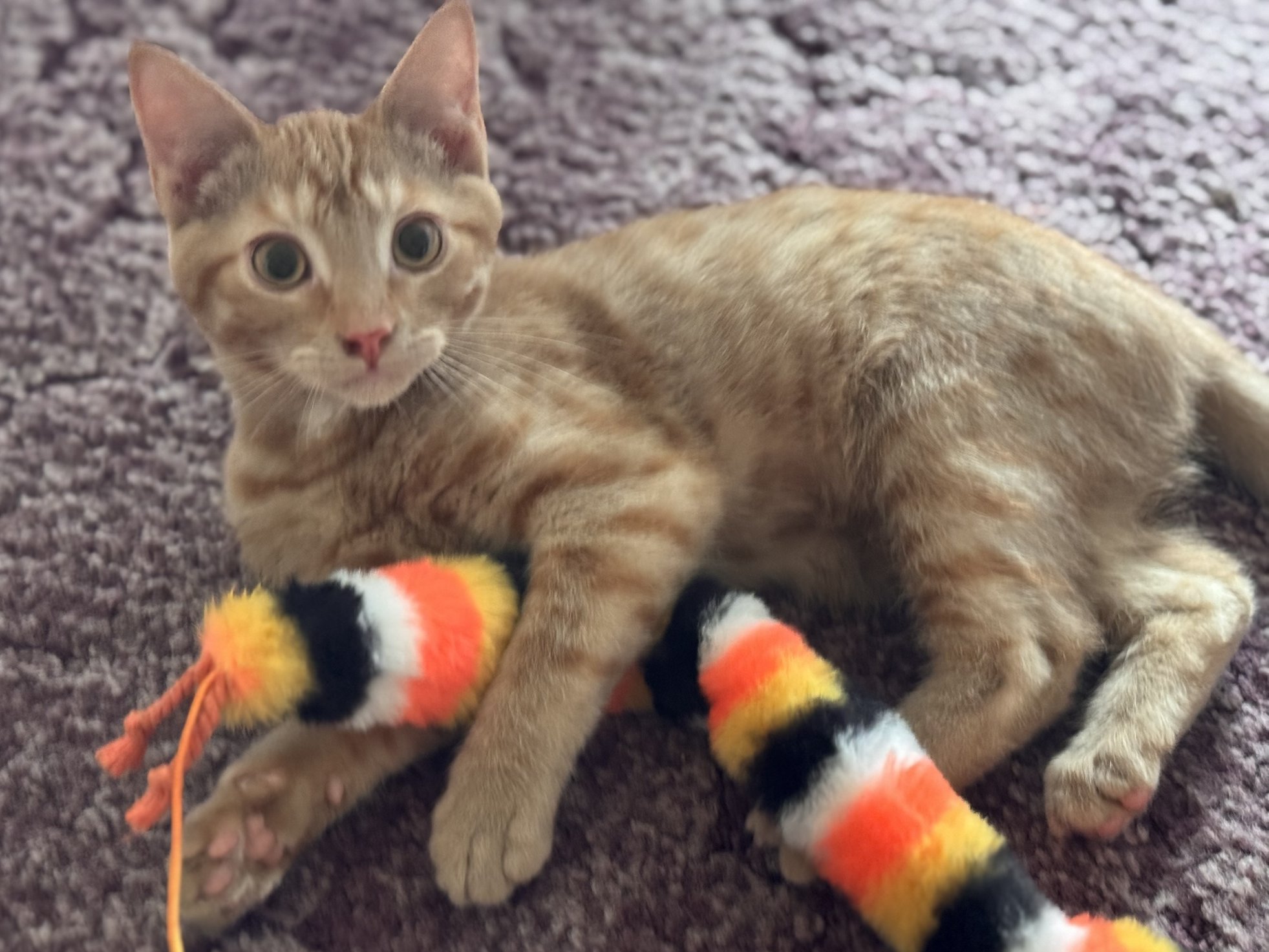 Please do not call the shelter; do the application first. Introducing the Cheese Litter of kittens! This group, with an estimated birth date of 5/30/25, came to us as part of a feral colony on which we did Trap-Neuter-Return. We have all of them in foster homes to help them continue their socialization; as they become ready for adoption, we are moving them from Coming Soon to Available! The group includes: CHEDDAR - male orange tabby - one of the most outgoing, ready for a new home! MOZZARELLA - female buff tabby - ALREADY ADOPTED AND THRIVING FETA - female buff tabby - ADOPTION PENDING BRIE - female orange tabby - still a bit shy but making good progress COLBY - male buff tabby - still shy, working on it CAMEMBERT - female orange tabby - making great strides, could go now to a patient home, will be the next one moved to Available for sure. This is Cheddar's listing, with a video and photos sent directly from his foster mom. While he still would likely prefer to avoid toddler birthday parties and keggers, he is definitely ready for a calm and loving family to call his own. Great with other cats, of course! We'd love to see all kittens go to homes that have another young, playful kitten, or to send 2 of them out as a pair (which gives you a great pair discount rate), but we do not require pair adoptions. If you prefer to adopt just one, and you don't have a similarly aged kitten at home already, please read our information on Single Kitten Syndrome. Then, when you apply for a single kitten, please let us know in the "Comments" field how you plan to deal with the "kitten crazies." All pets arrive spayed/neutered, dewormed, microchipped and vaccinated. Adoption fee for Cheddar is a suggested minimum of $75 (more gratefully accepted). All pets are placed with a 30-day money-back trial period, to give pet and family enough time to discover any unknown allergies or other conflicts. Can't come to Republic? Don't let that stop you! We have monthly transports to the Seattle area, delivering adopted pets to their new owners. If you can add a little to your donation to help us cover our volunteer driver's expenses, that would be great!