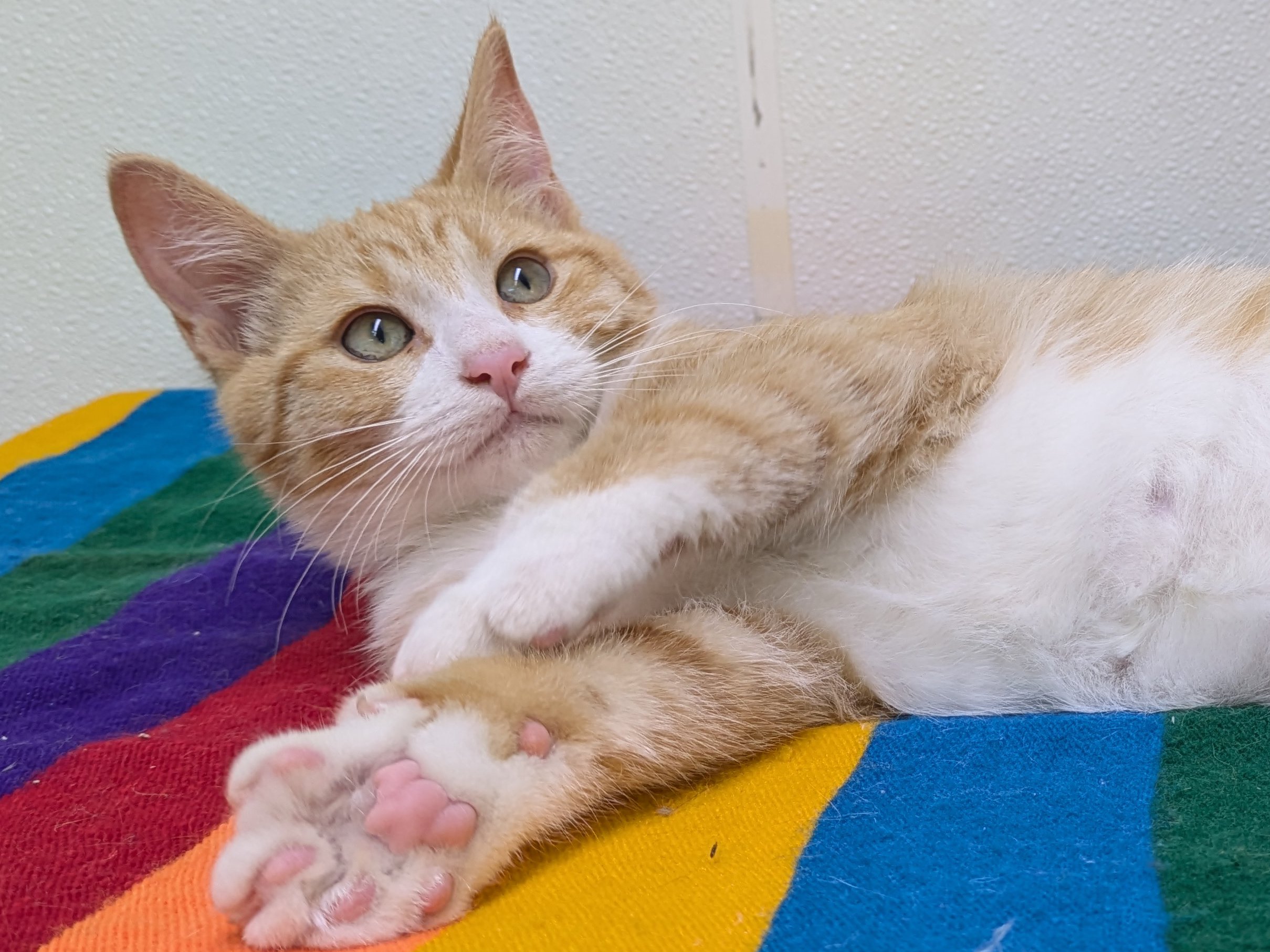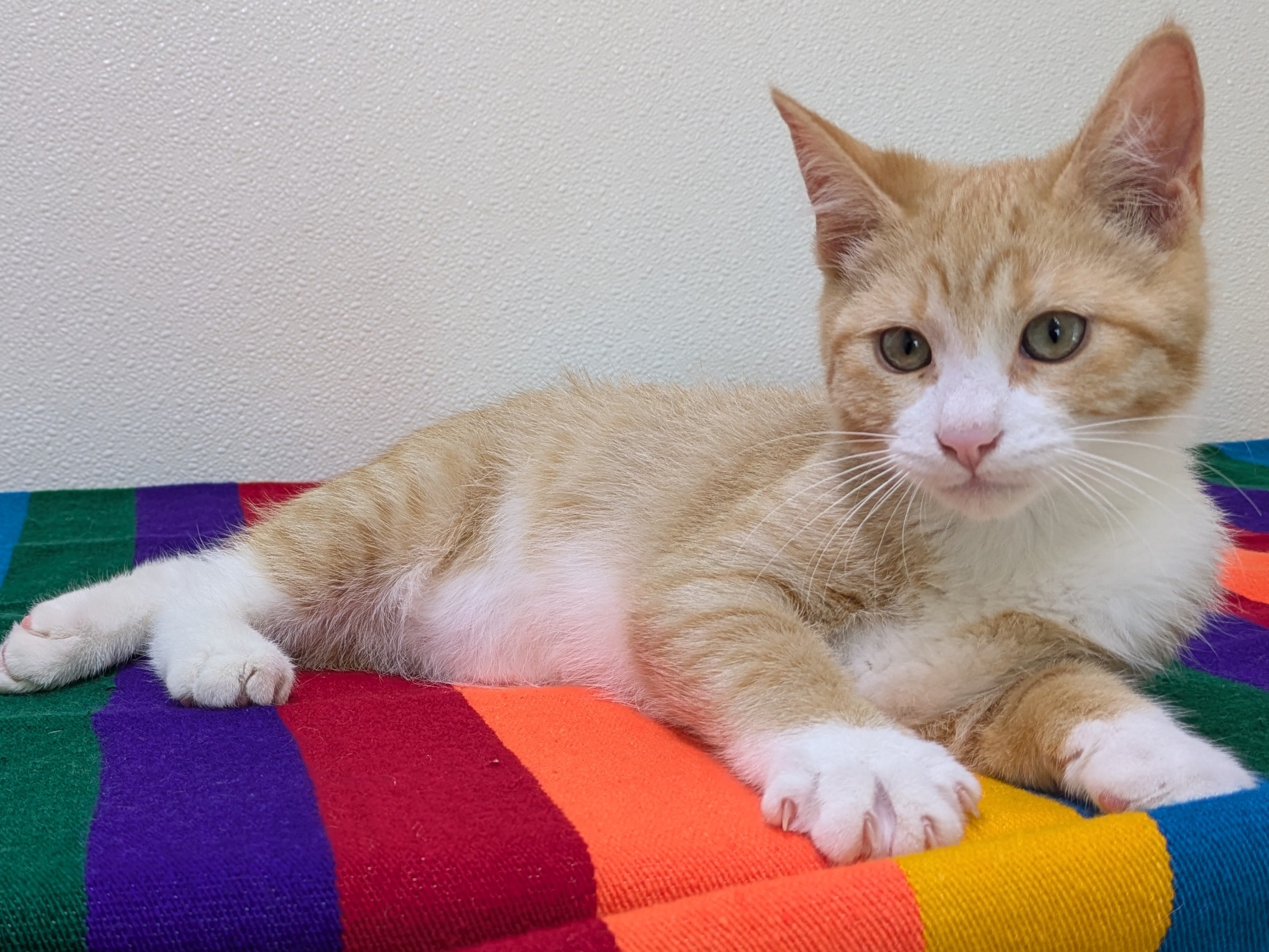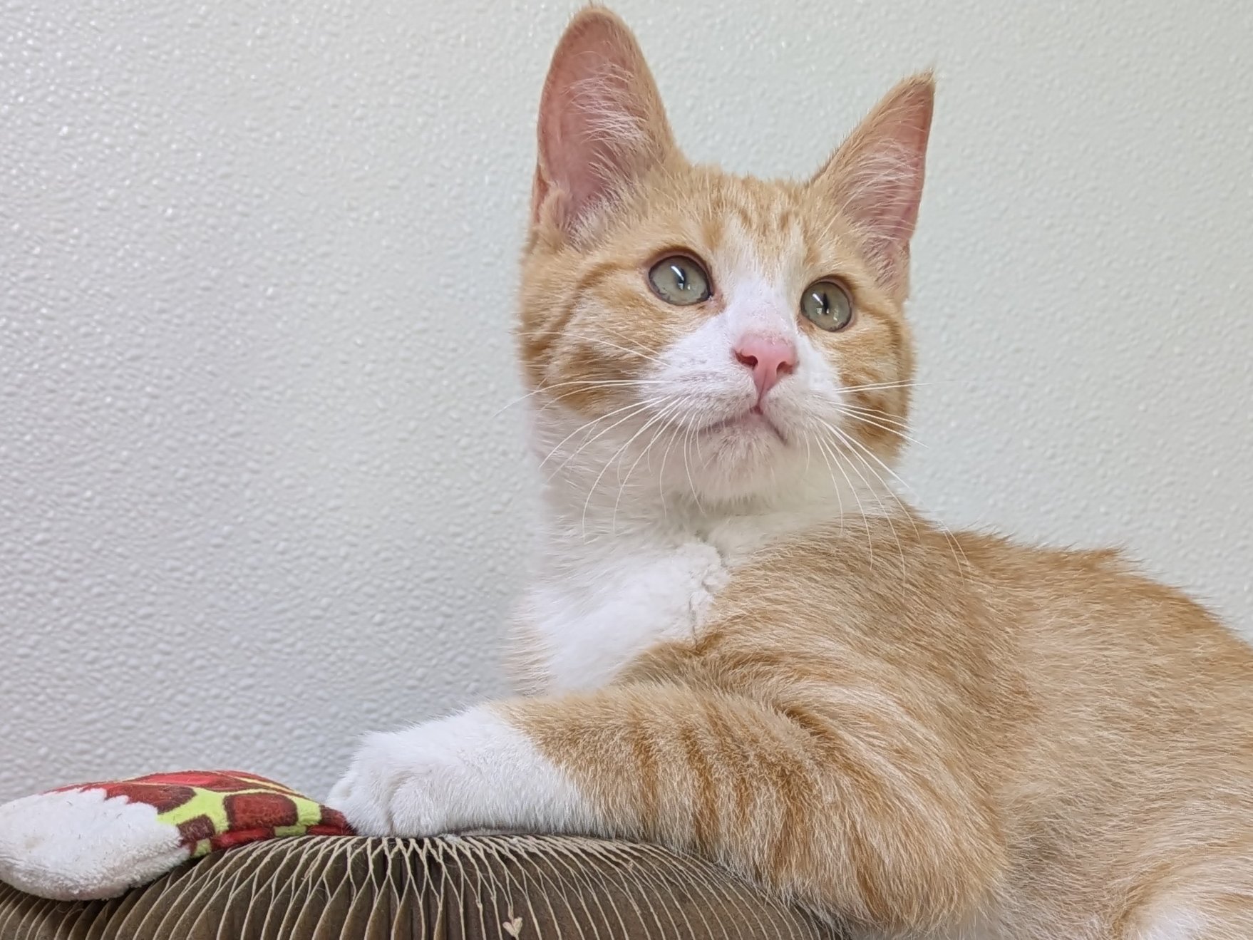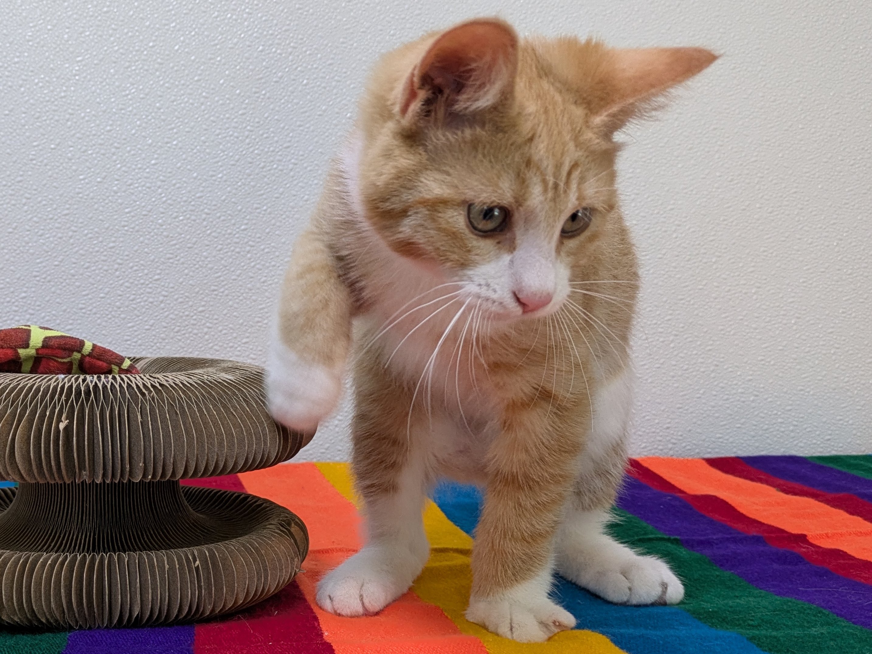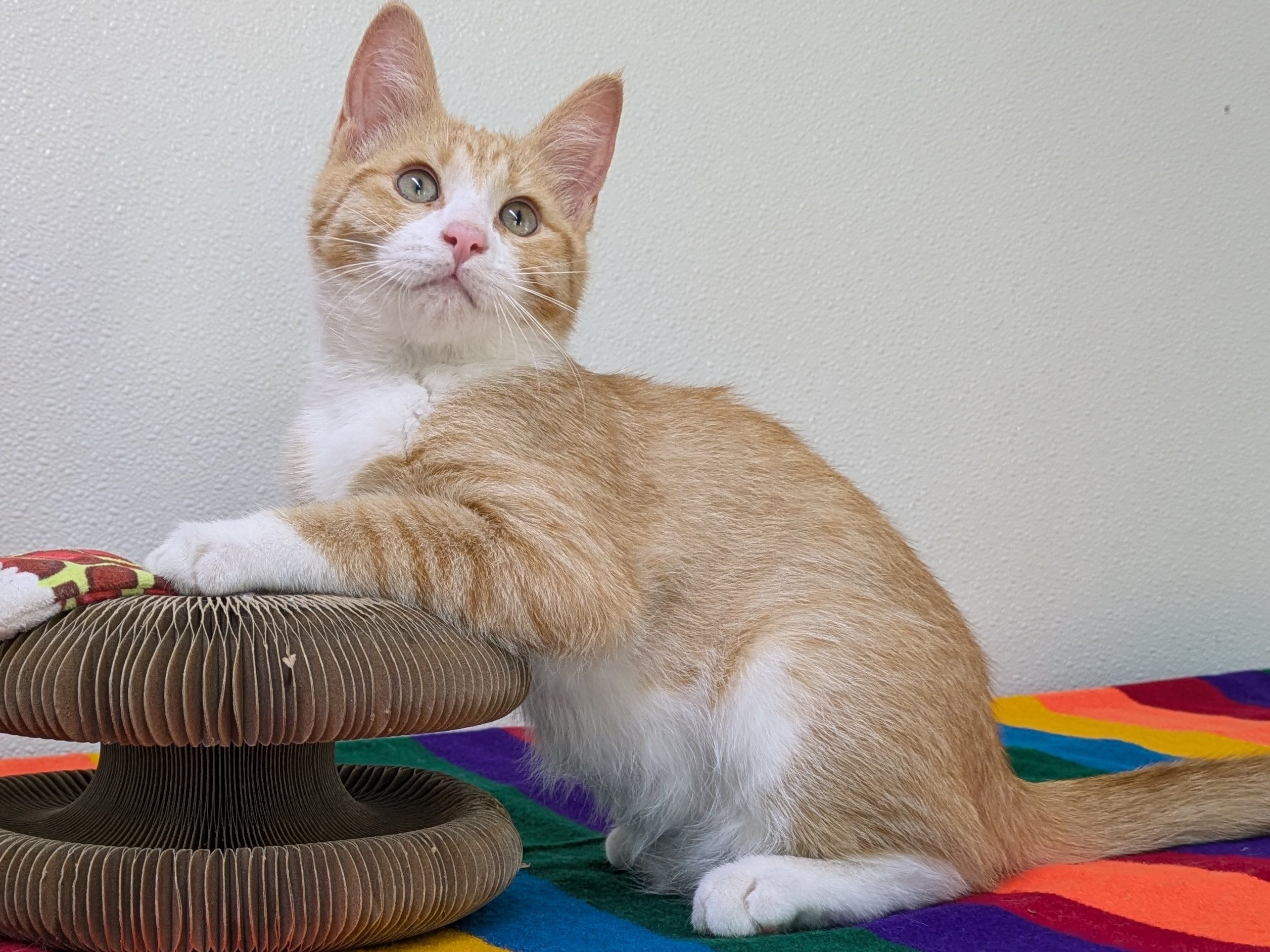 Please do not call the shelter; do the application first. We have three wonderful boys left in our Orange Litter, born 6/3/25: BUTTERSCOTCH - male buff tabby MAPLE - male buff tabby with white CARROT - male orange tabby with white This group is very playful and fun, and should fit in well with pretty much any type of family. Maple is a little bit more reserved than the others, and would prefer a calmer household with no toddler birthday parties. For the others... whatever chaos you may invite, they say "bring. it. on." We'd love to see all kittens go to homes that have another young, playful kitten, or to send 2 of them out as a pair (which gives you a great pair discount rate), but we do not require pair adoptions. If you prefer to adopt just one, and you don't have a similarly aged kitten at home already, please read our information on Single Kitten Syndrome. Then, when you apply for a single kitten, please let us know in the "Comments" field how you plan to deal with the "kitten crazies." All pets arrive spayed/neutered, dewormed, microchipped and vaccinated. Adoption fee for Carrot is a suggested minimum of $75 (more gratefully accepted). All pets are placed with a 30-day money-back trial period, to give pet and family enough time to discover any unknown allergies or other conflicts. Can't come to Republic? Don't let that stop you! We have monthly transports to the Seattle area, delivering adopted pets to their new owners. If you can add a little to your donation to help us cover our volunteer driver's expenses, that would be great!