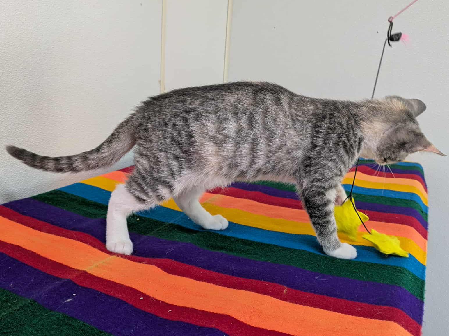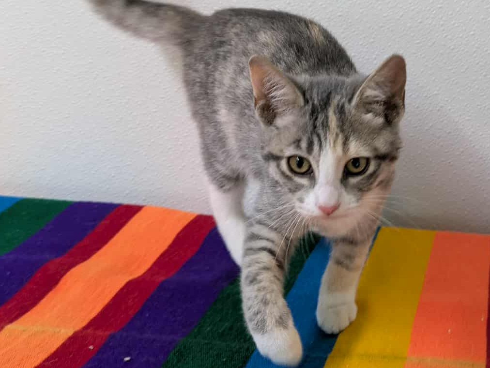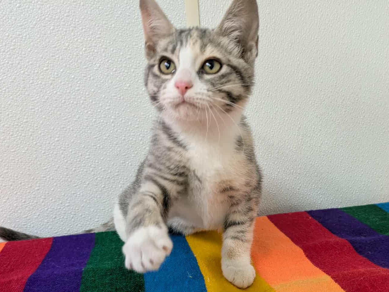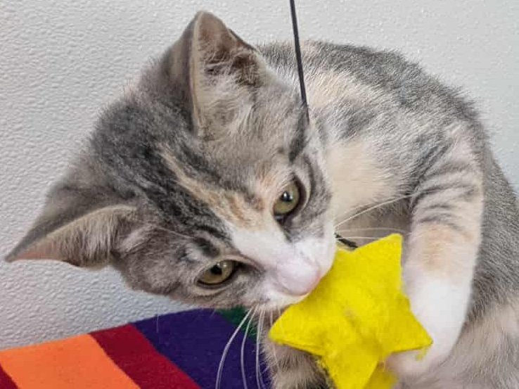 Please do not call the shelter; do the application first. Introducing the Fly Litter! These adorable sisters, born 6/4/25 at the shelter, have spent their whole lives inside, and have been well socialized by our staff and volunteers. They should have no problem adapting to homes with children, dogs, and other cats, and should remain indoor-only kitties. This pair includes: DRAGONFLY: shorthaired torbie/white, fully white nose, left front leg has orange and white FIREFLY: shorthaired torbie/white, some orange on nose, left front leg mostly grey with white toes They share their space with the Smalls from the Sandlot Litter, and Butterscotch, Maple, and Carrot from the Orange Litter, in case you want to mix-and-match to make your purrrfect pair! We'd love to see all kittens go to homes that have another young, playful kitten, or to send 2 of them out as a pair (which gives you a great pair discount rate), but we do not require pair adoptions. If you prefer to adopt just one, and you don't have a similarly aged kitten at home already, please read our information on Single Kitten Syndrome. Then, when you apply for a single kitten, please let us know in the "Comments" field how you plan to deal with the "kitten crazies." All pets arrive spayed/neutered, dewormed, microchipped and vaccinated. Adoption fee for Dragonfly is a suggested minimum of $75 (more gratefully accepted). All pets are placed with a 30-day money-back trial period, to give pet and family enough time to discover any unknown allergies or other conflicts. Can't come to Republic? Don't let that stop you! We have monthly transports to the Seattle area, delivering adopted pets to their new owners. If you can add a little to your donation to help us cover our volunteer driver's expenses, that would be great!