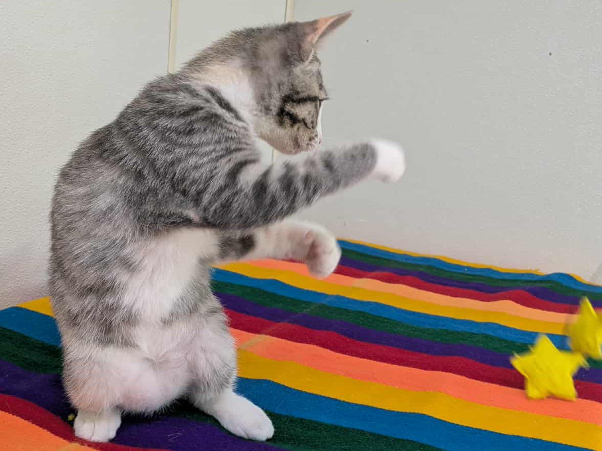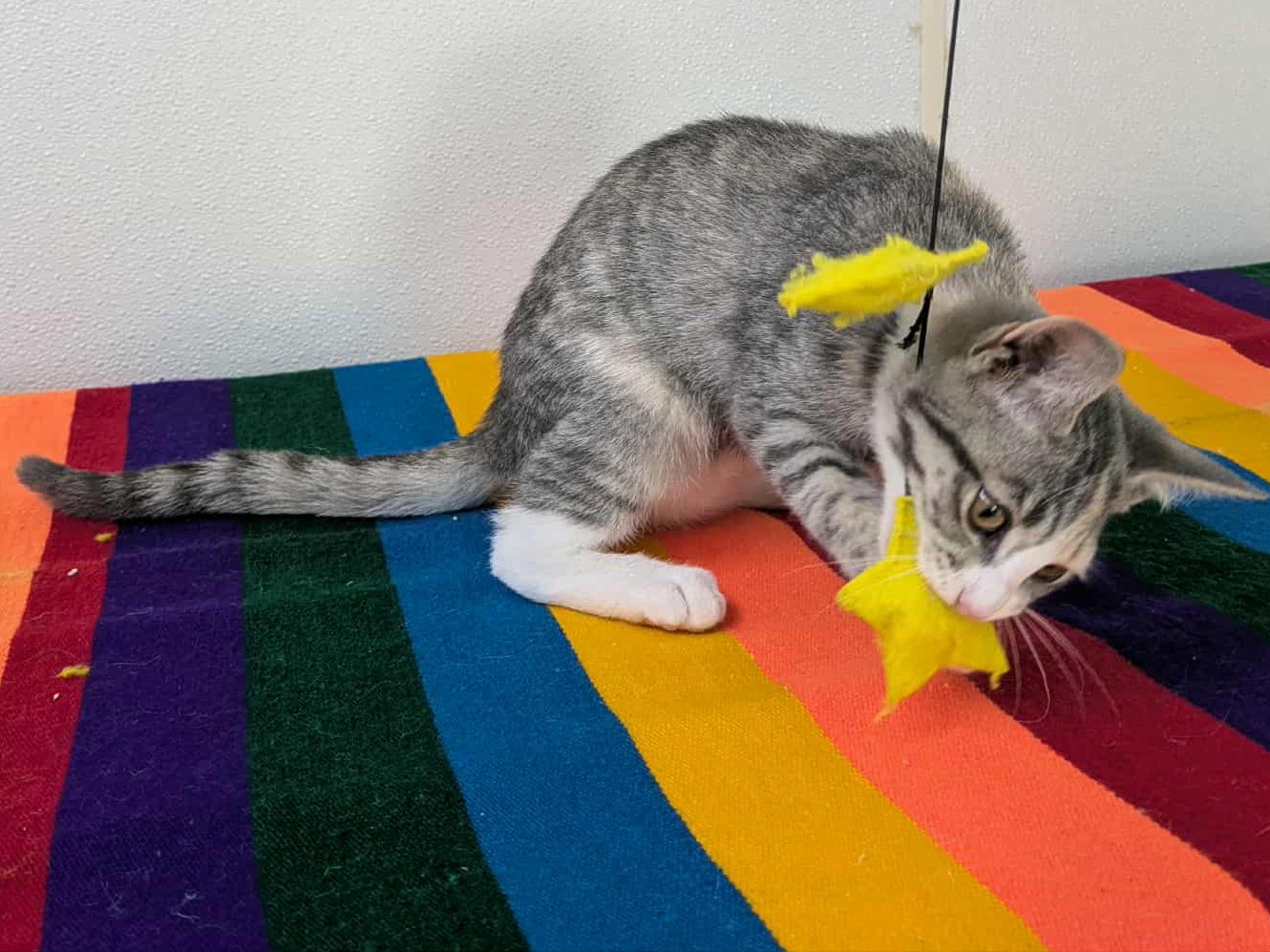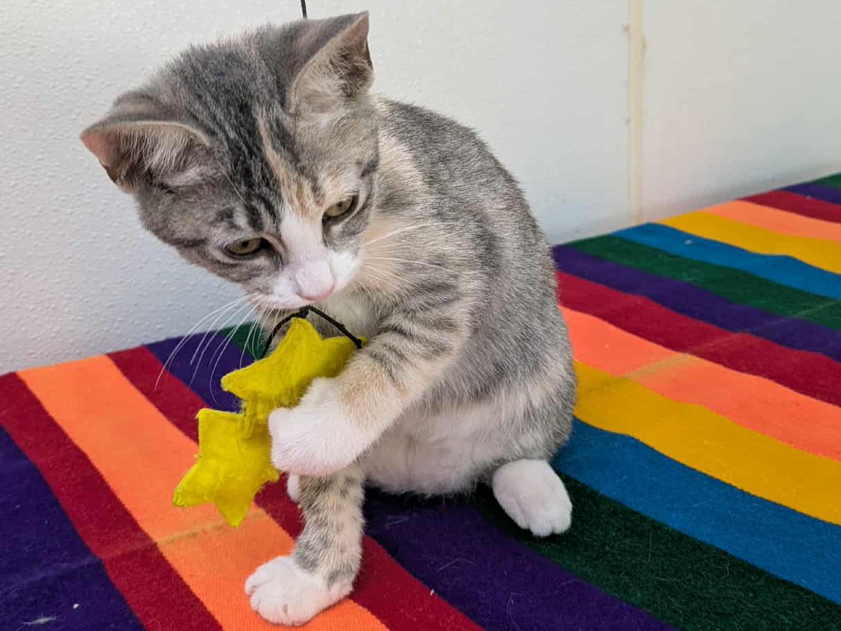 Please do not call the shelter; do the application first. Introducing the Fly Litter! These adorable sisters, born 6/4/25 at the shelter, have spent their whole lives inside, and have been well socialized by our staff and volunteers. They should have no problem adapting to homes with children, dogs, and other cats, and should remain indoor-only kitties. This pair includes: DRAGONFLY: shorthaired torbie/white, fully white nose, left front leg has orange and white FIREFLY: shorthaired torbie/white, some orange on nose, left front leg mostly grey with white toes They share their space with the Smalls from the Sandlot Litter, and Butterscotch, Maple, and Carrot from the Orange Litter, in case you want to mix-and-match to make your purrrfect pair! We'd love to see all kittens go to homes that have another young, playful kitten, or to send 2 of them out as a pair (which gives you a great pair discount rate), but we do not require pair adoptions. If you prefer to adopt just one, and you don't have a similarly aged kitten at home already, please read our information on Single Kitten Syndrome. Then, when you apply for a single kitten, please let us know in the "Comments" field how you plan to deal with the "kitten crazies." All pets arrive spayed/neutered, dewormed, microchipped and vaccinated. Adoption fee for Dragonfly is a suggested minimum of $75 (more gratefully accepted). All pets are placed with a 30-day money-back trial period, to give pet and family enough time to discover any unknown allergies or other conflicts. Can't come to Republic? Don't let that stop you! We have monthly transports to the Seattle area, delivering adopted pets to their new owners. If you can add a little to your donation to help us cover our volunteer driver's expenses, that would be great!