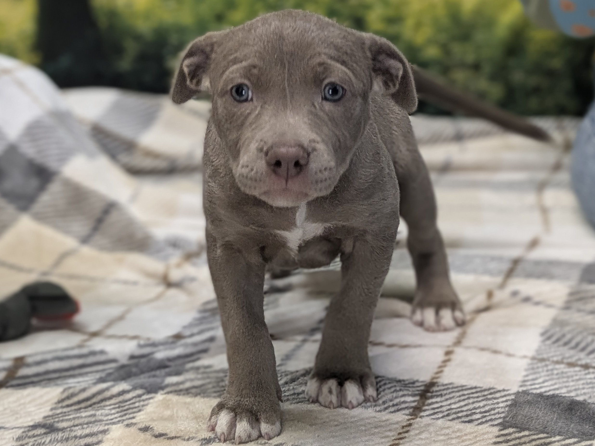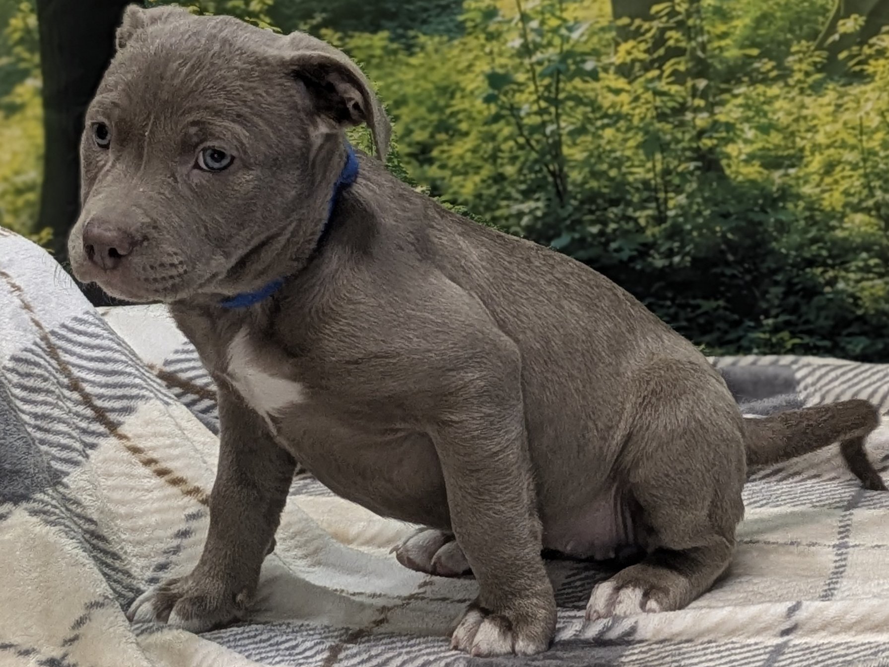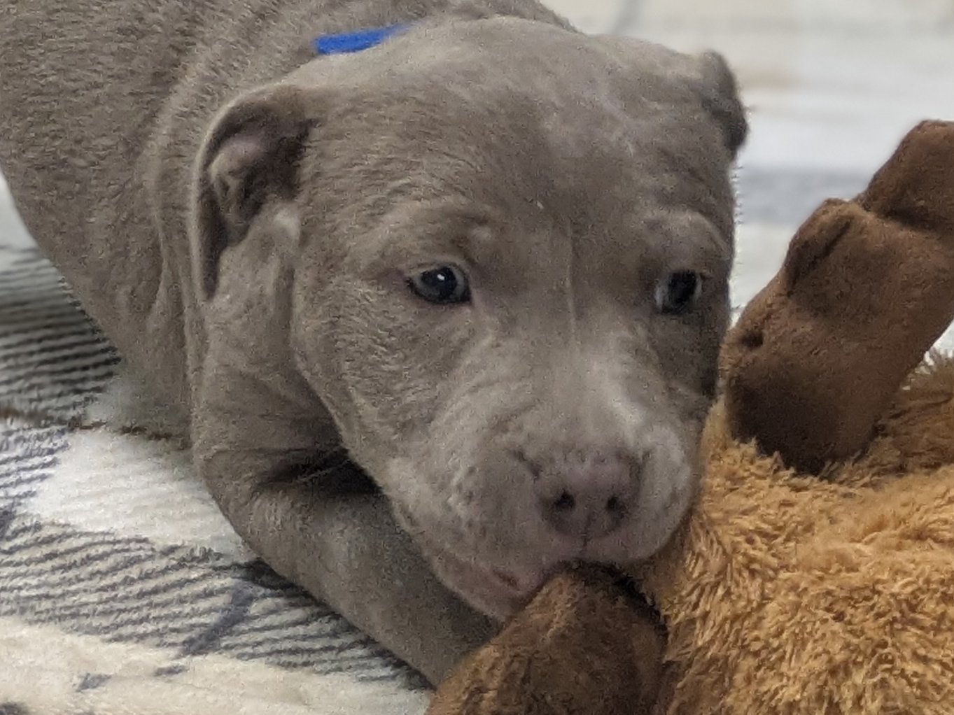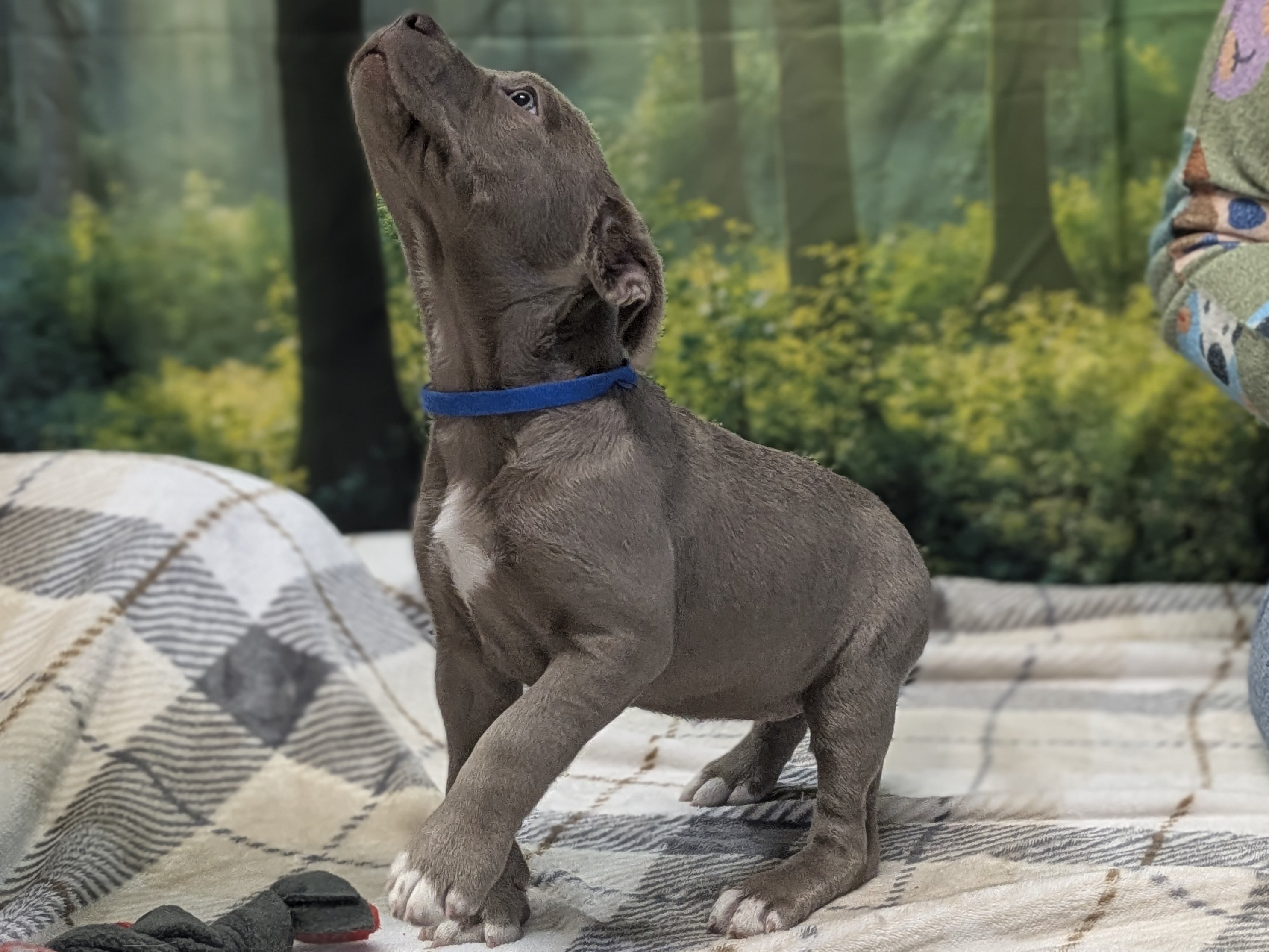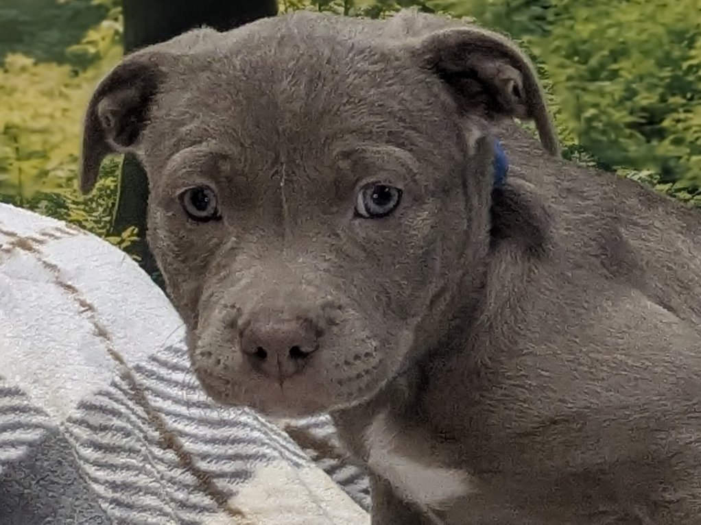 Please do not call the shelter; do the application first. When applying for one of the pups, please let us know your top 3-6 choices in order of preference, so we can match you to the pup closest to the top of your list. Introducing the Italian Renaissance litter! These adorable pups came in as a Stop the Cycle litter, and have been at the shelter since they were just 2 weeks old; they and their mom came in for care and socializing until the pups were weaned, now mom is spayed and back home (dad is scheduled for neuter, too, under our Stop the Cycle program). Photos of mom (black & white) and dad (brown) are at the end of the listing. Their owner says dad has some Weimaraner in the mix, but it doesn't show in appearance; these little meatballs all look like adorable pitties. One of the best parts about adopting a pup who has been at the shelter most of their lives: you know their ENTIRE HISTORY. You know they had all their age appropriate vaccines at the right times. You know they have been monitored to make sure all were eating and growing appropriately. You know they have met all sorts of different humans during their time at the shelter, and have been handled and loved since arrival. Yay! These pups are social and playful, and will make excellent family pets! We'd guess adult weights between 45 - 60 pounds, but as always with unknown mixed breeds, your puppy may vary! The litter includes (with their weight as of 4/9/26 - 7 weeks old): CATERINA female, grey & white 9.77# LUCREZIA female, white & black 8.92# COSIMO male, dark grey & white 10.67# MADDALENA female, brown & white 9.82# OLIMPIA female, dark grey & white 8.32# FRANCESCA female, black & white 9.04# Puppies require a lot of human interaction, and all puppies will benefit from obedience training and full immersion in their human household. These pups' ideal homes will have someone who can exercise them with a couple of energetic walks each day, plus commitment to training them how to be the best dogs they can be. They hope to have very few hours per day when they will be without the companionship of a human or other pet, and will reward their forever people with boundless love and loyalty! All pets arrive spayed/neutered, dewormed, microchipped and vaccinated. Adoption fee for Caterina is a suggested minimum of $175 (more gratefully accepted). All pets are placed with a 30-day money-back trial period, to give pet and family enough time to discover any unknown allergies or other conflicts. Can't come to Republic? Don't let that stop you! We have monthly transports to the Seattle area, delivering adopted pets to their new owners. If you can add a little to your donation to help us cover our volunteer driver's expenses, that would be great!
