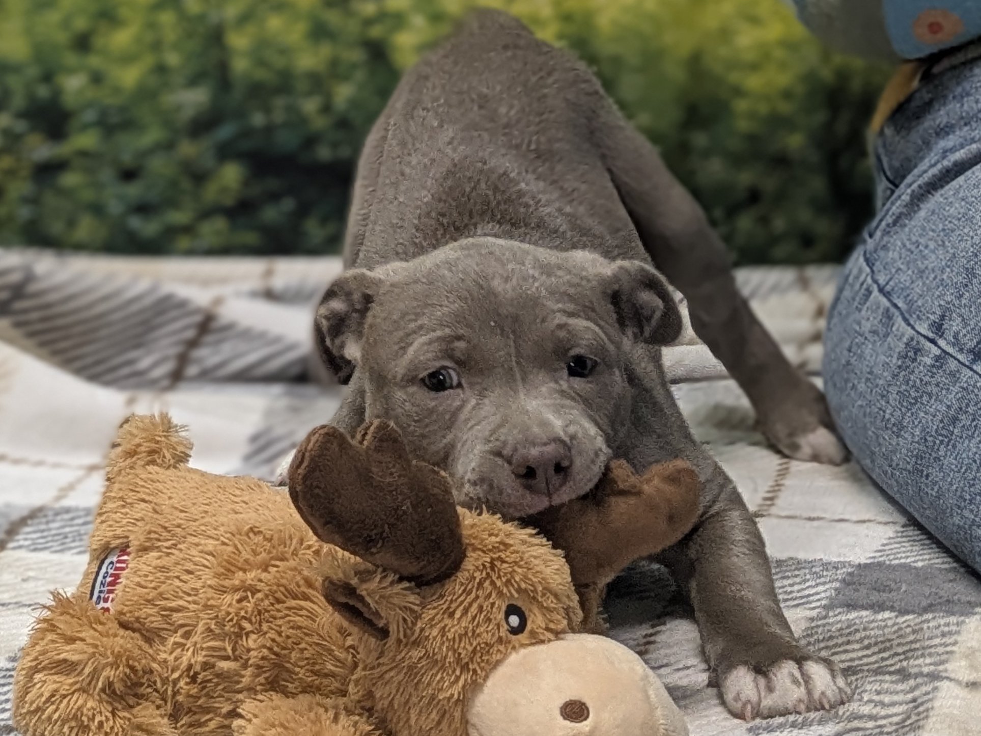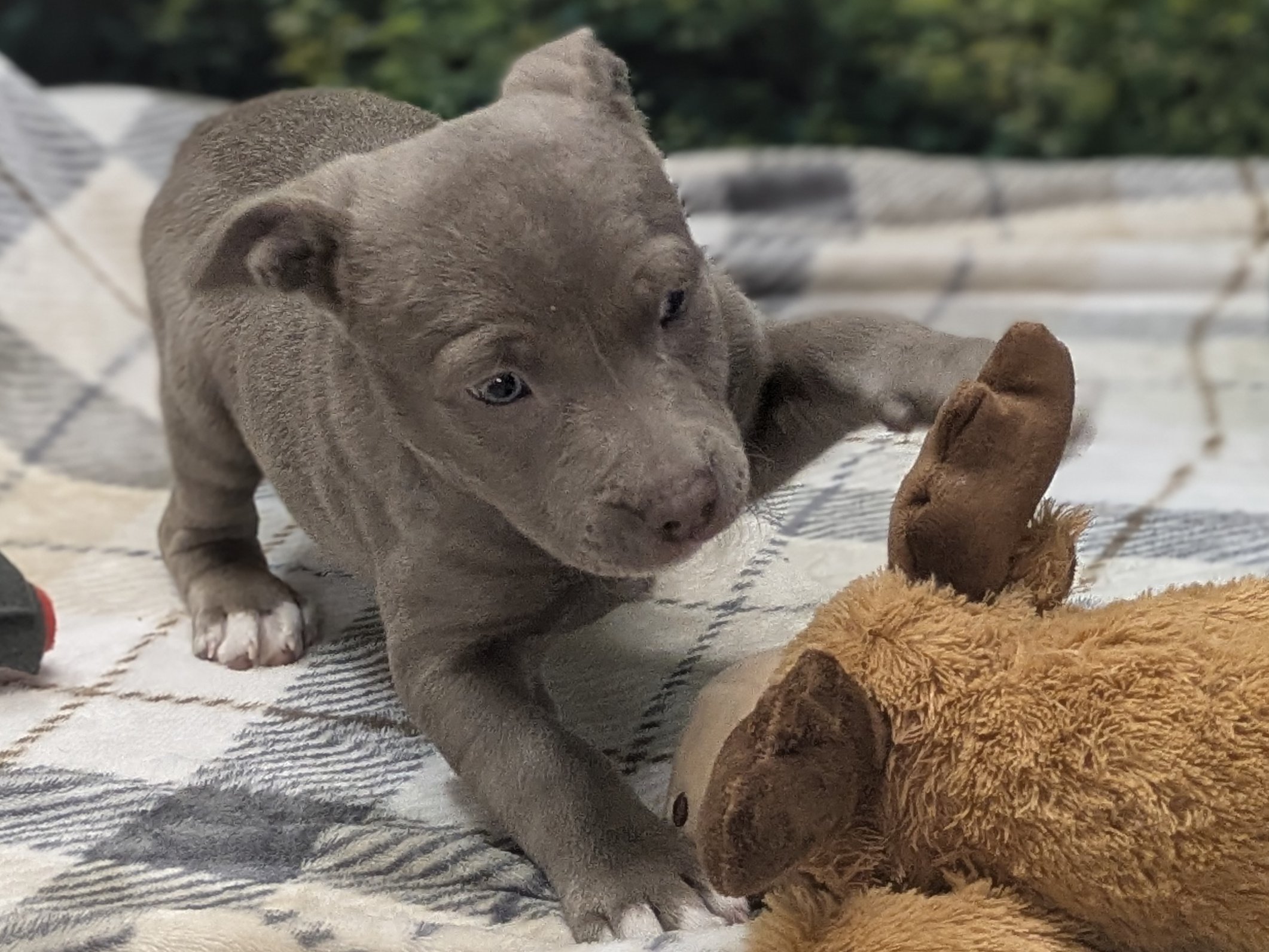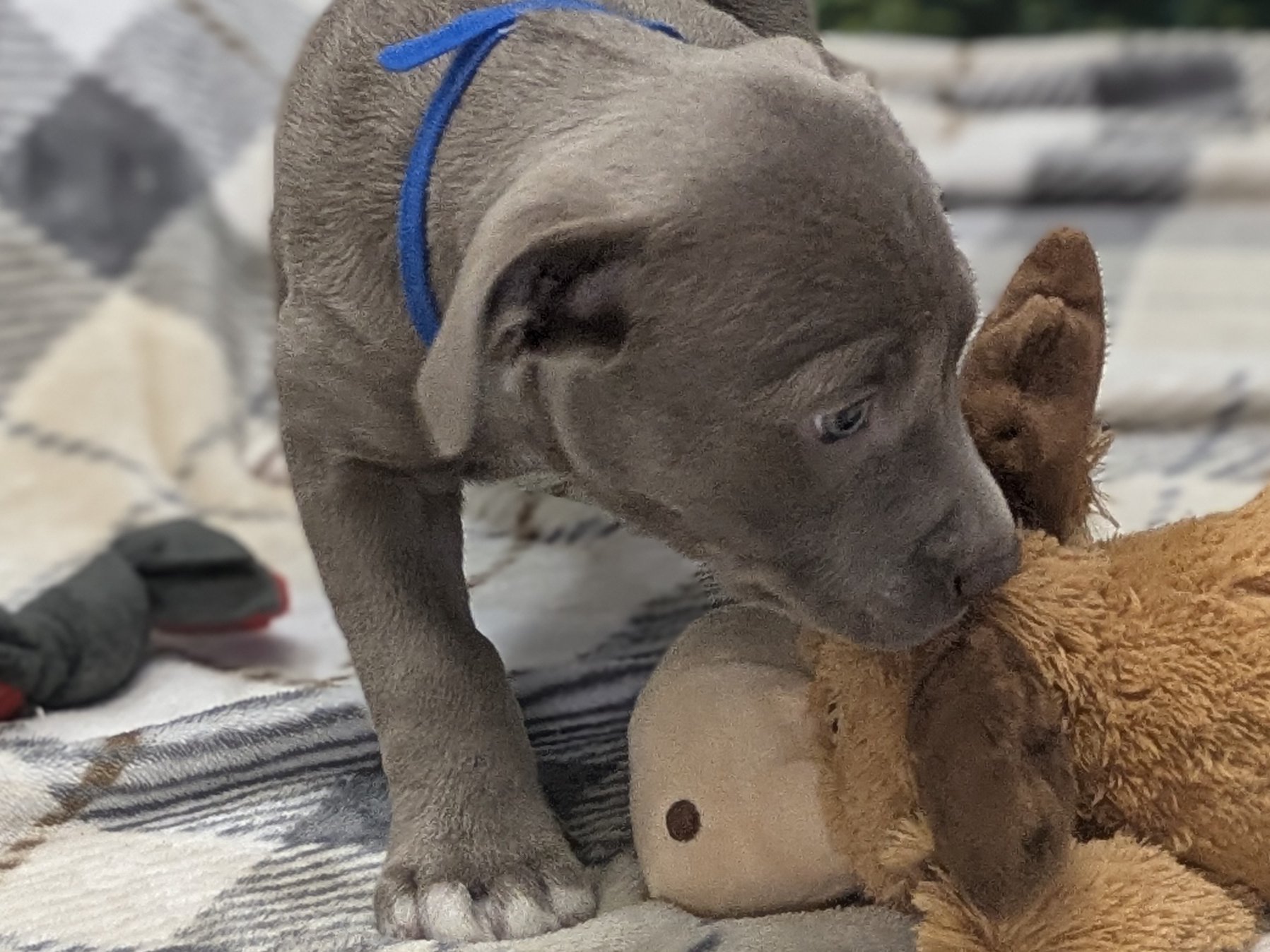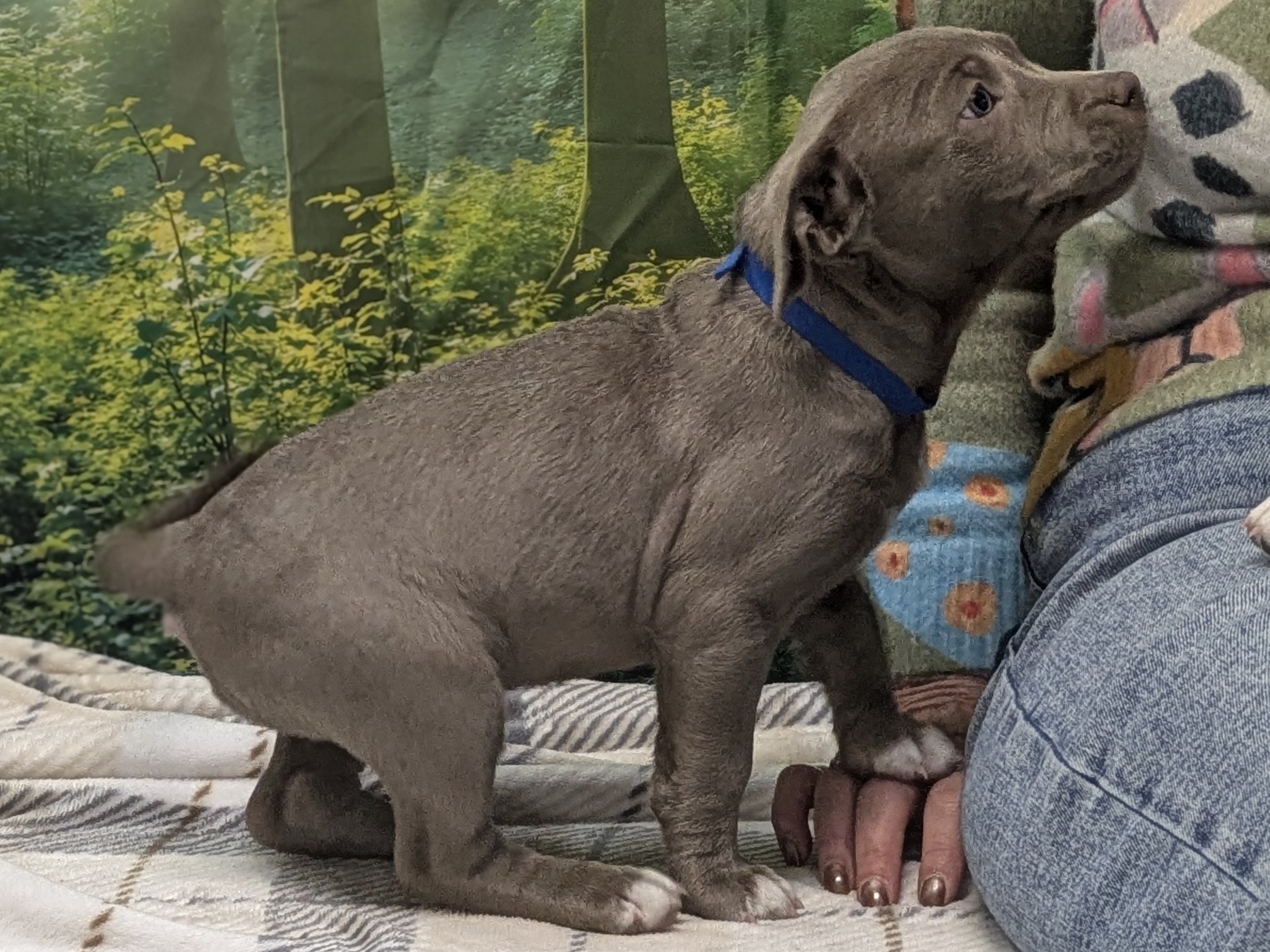 Please do not call the shelter; do the application first. When applying for one of the pups, please let us know your top 3-6 choices in order of preference, so we can match you to the pup closest to the top of your list. Introducing the Italian Renaissance litter! These adorable pups came in as a Stop the Cycle litter, and have been at the shelter since they were just 2 weeks old; they and their mom came in for care and socializing until the pups were weaned, now mom is spayed and back home (dad is scheduled for neuter, too, under our Stop the Cycle program). Photos of mom (black & white) and dad (brown) are at the end of the listing. Their owner says dad has some Weimaraner in the mix, but it doesn't show in appearance; these little meatballs all look like adorable pitties. One of the best parts about adopting a pup who has been at the shelter most of their lives: you know their ENTIRE HISTORY. You know they had all their age appropriate vaccines at the right times. You know they have been monitored to make sure all were eating and growing appropriately. You know they have met all sorts of different humans during their time at the shelter, and have been handled and loved since arrival. Yay! These pups are social and playful, and will make excellent family pets! We'd guess adult weights between 45 - 60 pounds, but as always with unknown mixed breeds, your puppy may vary! The litter includes (with their weight as of 4/9/26 - 7 weeks old): CATERINA female, grey & white 9.77# LUCREZIA female, white & black 8.92# COSIMO male, dark grey & white 10.67# MADDALENA female, brown & white 9.82# OLIMPIA female, dark grey & white 8.32# FRANCESCA female, black & white 9.04# Puppies require a lot of human interaction, and all puppies will benefit from obedience training and full immersion in their human household. These pups' ideal homes will have someone who can exercise them with a couple of energetic walks each day, plus commitment to training them how to be the best dogs they can be. They hope to have very few hours per day when they will be without the companionship of a human or other pet, and will reward their forever people with boundless love and loyalty! All pets arrive spayed/neutered, dewormed, microchipped and vaccinated. Adoption fee for Caterina is a suggested minimum of $175 (more gratefully accepted). All pets are placed with a 30-day money-back trial period, to give pet and family enough time to discover any unknown allergies or other conflicts. Can't come to Republic? Don't let that stop you! We have monthly transports to the Seattle area, delivering adopted pets to their new owners. If you can add a little to your donation to help us cover our volunteer driver's expenses, that would be great!