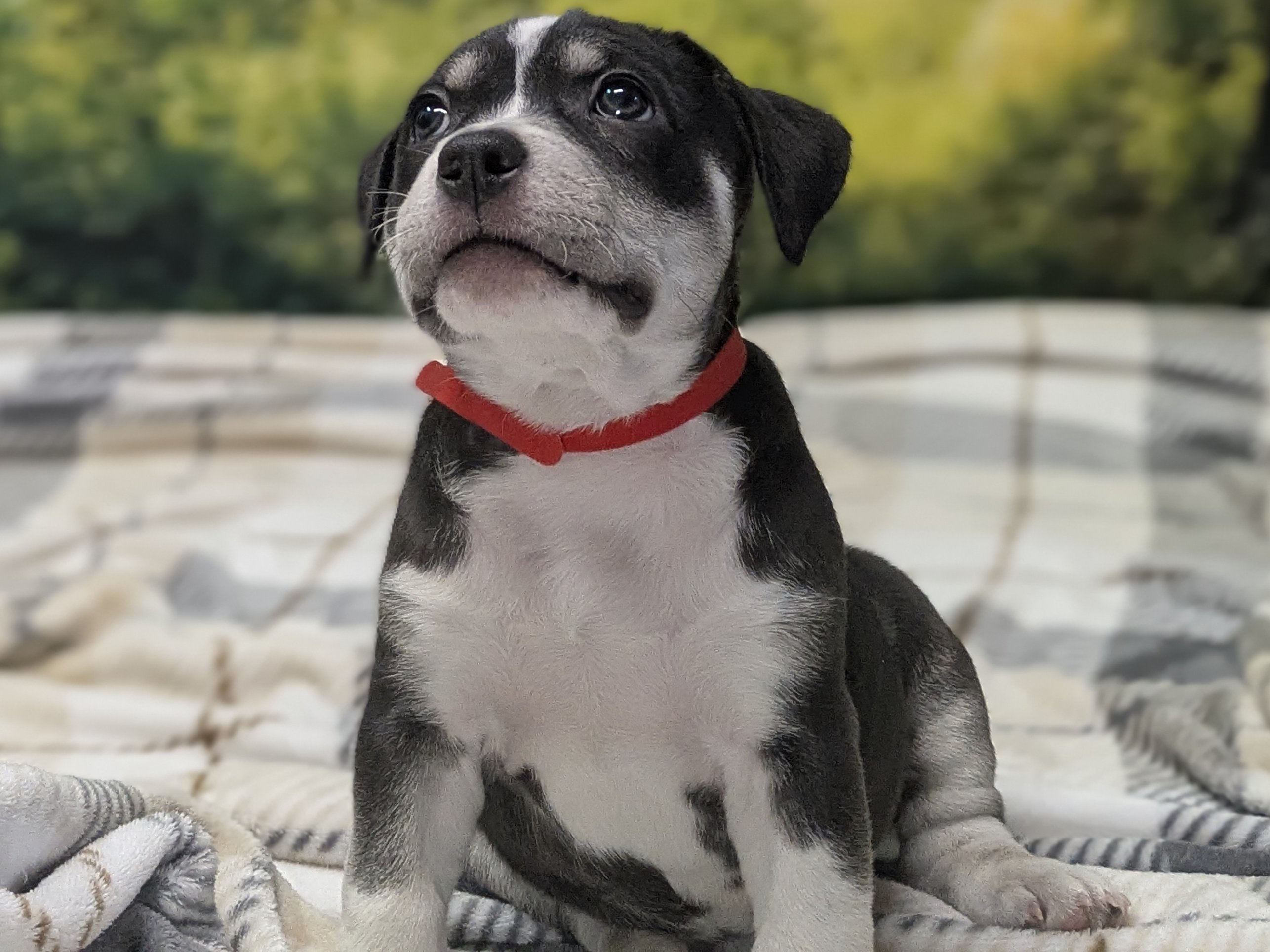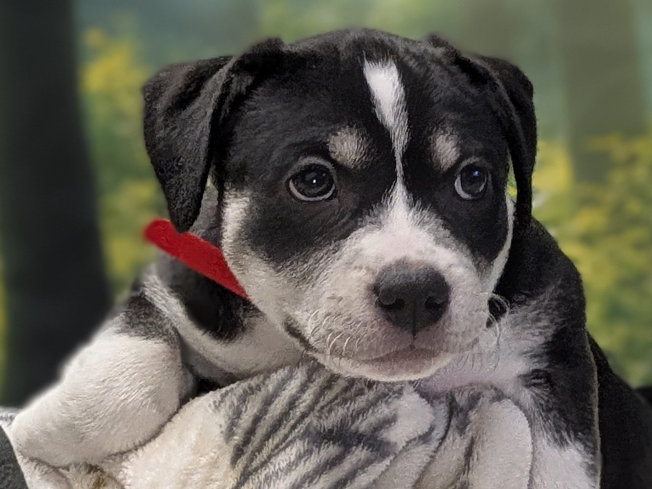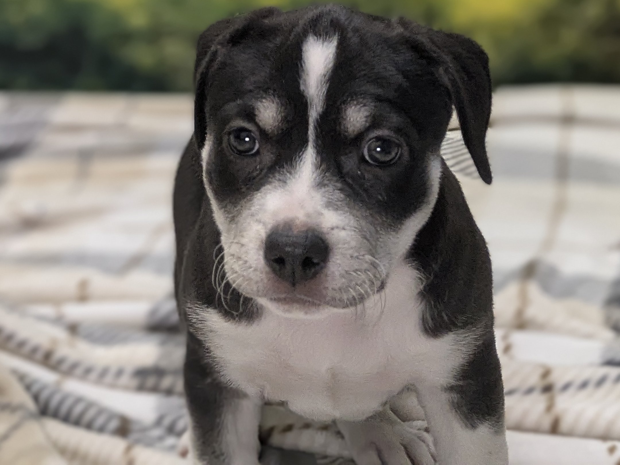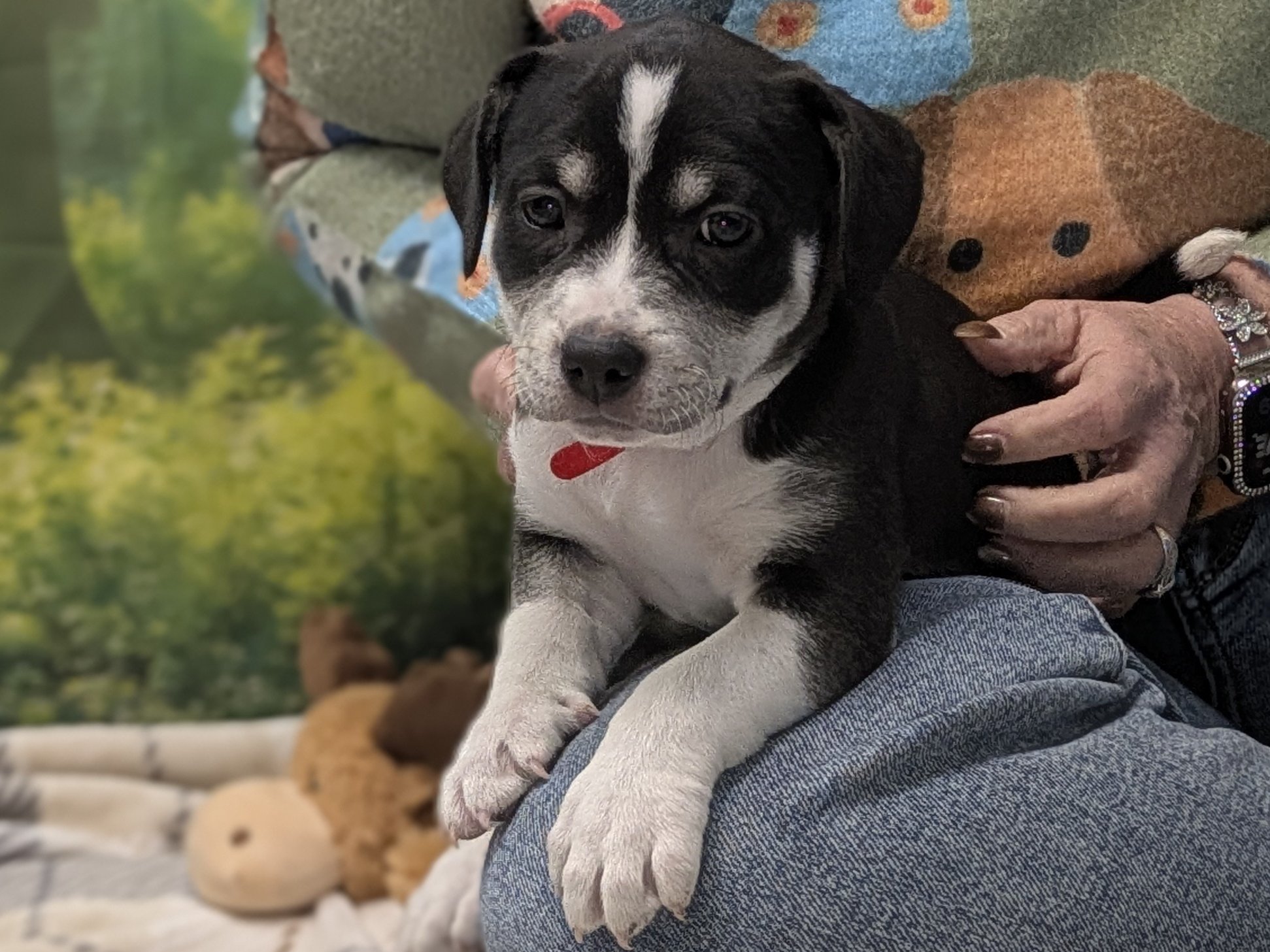 Please do not call the shelter; do the application first. When applying for one of the pups, please let us know your top 3-6 choices in order of preference, so we can match you to the pup closest to the top of your list. Introducing the Italian Renaissance litter! These adorable pups came in as a Stop the Cycle litter, and have been at the shelter since they were just 2 weeks old; they and their mom came in for care and socializing until the pups were weaned, now mom is spayed and back home (dad is scheduled for neuter, too, under our Stop the Cycle program). Photos of mom (black & white) and dad (brown) are at the end of the listing. Their owner says dad has some Weimaraner in the mix, but it doesn't show in appearance; these little meatballs all look like adorable pitties. One of the best parts about adopting a pup who has been at the shelter most of their lives: you know their ENTIRE HISTORY. You know they had all their age appropriate vaccines at the right times. You know they have been monitored to make sure all were eating and growing appropriately. You know they have met all sorts of different humans during their time at the shelter, and have been handled and loved since arrival. Yay! These pups are social and playful, and will make excellent family pets! We'd guess adult weights between 45 - 60 pounds, but as always with unknown mixed breeds, your puppy may vary! The litter includes (with their weight as of 4/9/26 - 7 weeks old): CATERINA female, grey & white 9.77# LUCREZIA female, white & black 8.92# COSIMO male, dark grey & white 10.67# MADDALENA female, brown & white 9.82# OLIMPIA female, dark grey & white 8.32# FRANCESCA female, black & white 9.04# Puppies require a lot of human interaction, and all puppies will benefit from obedience training and full immersion in their human household. These pups' ideal homes will have someone who can exercise them with a couple of energetic walks each day, plus commitment to training them how to be the best dogs they can be. They hope to have very few hours per day when they will be without the companionship of a human or other pet, and will reward their forever people with boundless love and loyalty! All pets arrive spayed/neutered, dewormed, microchipped and vaccinated. Adoption fee for Francesca is a suggested minimum of $175 (more gratefully accepted). All pets are placed with a 30-day money-back trial period, to give pet and family enough time to discover any unknown allergies or other conflicts. Can't come to Republic? Don't let that stop you! We have monthly transports to the Seattle area, delivering adopted pets to their new owners. If you can add a little to your donation to help us cover our volunteer driver's expenses, that would be great!