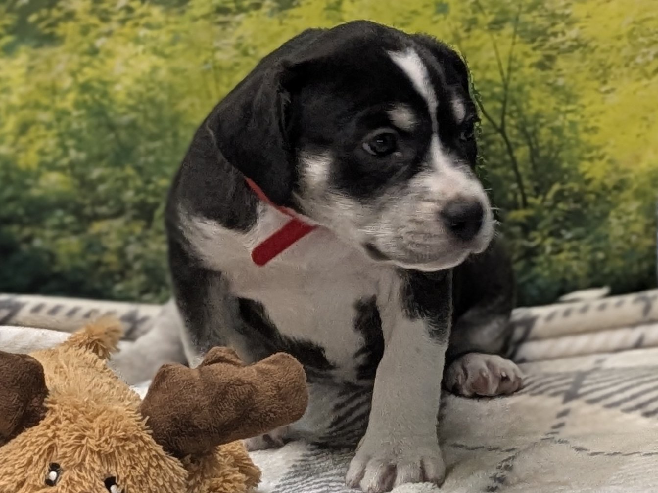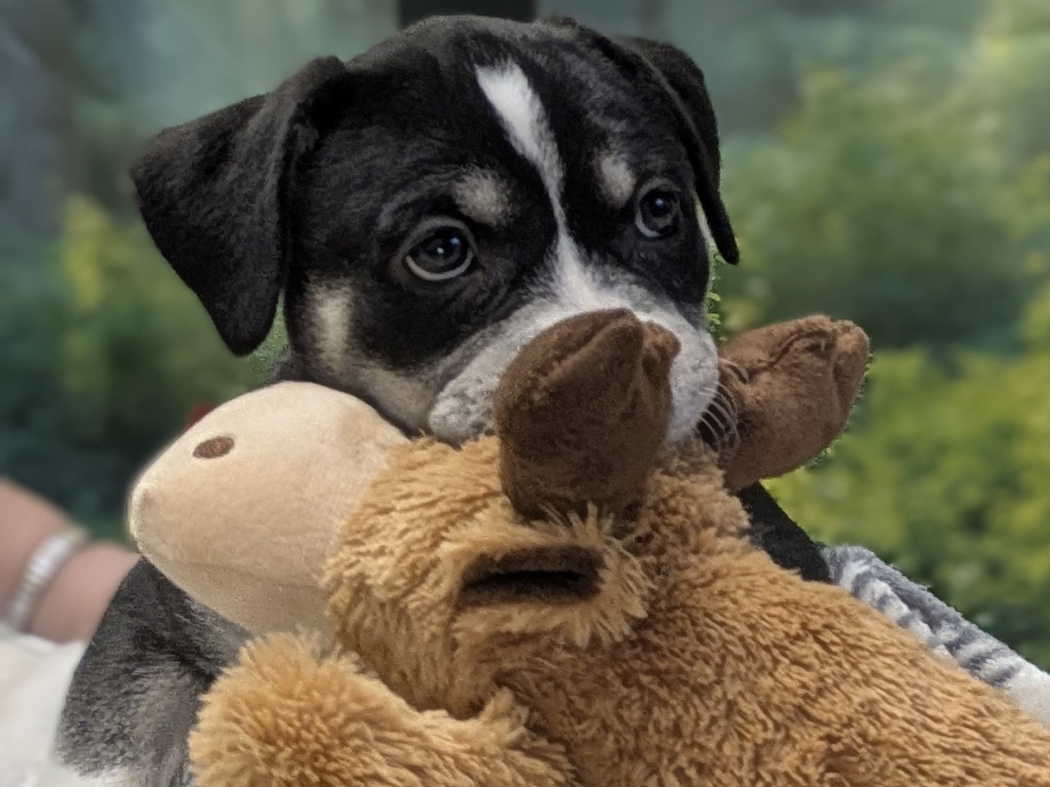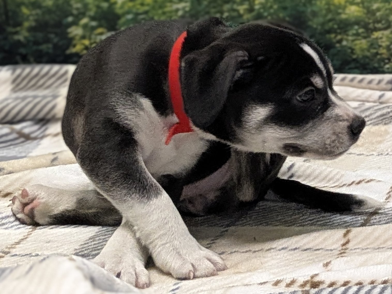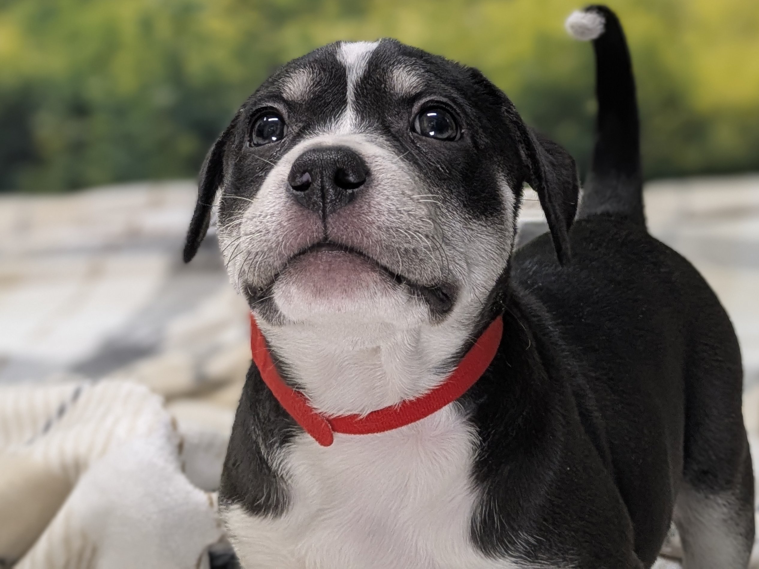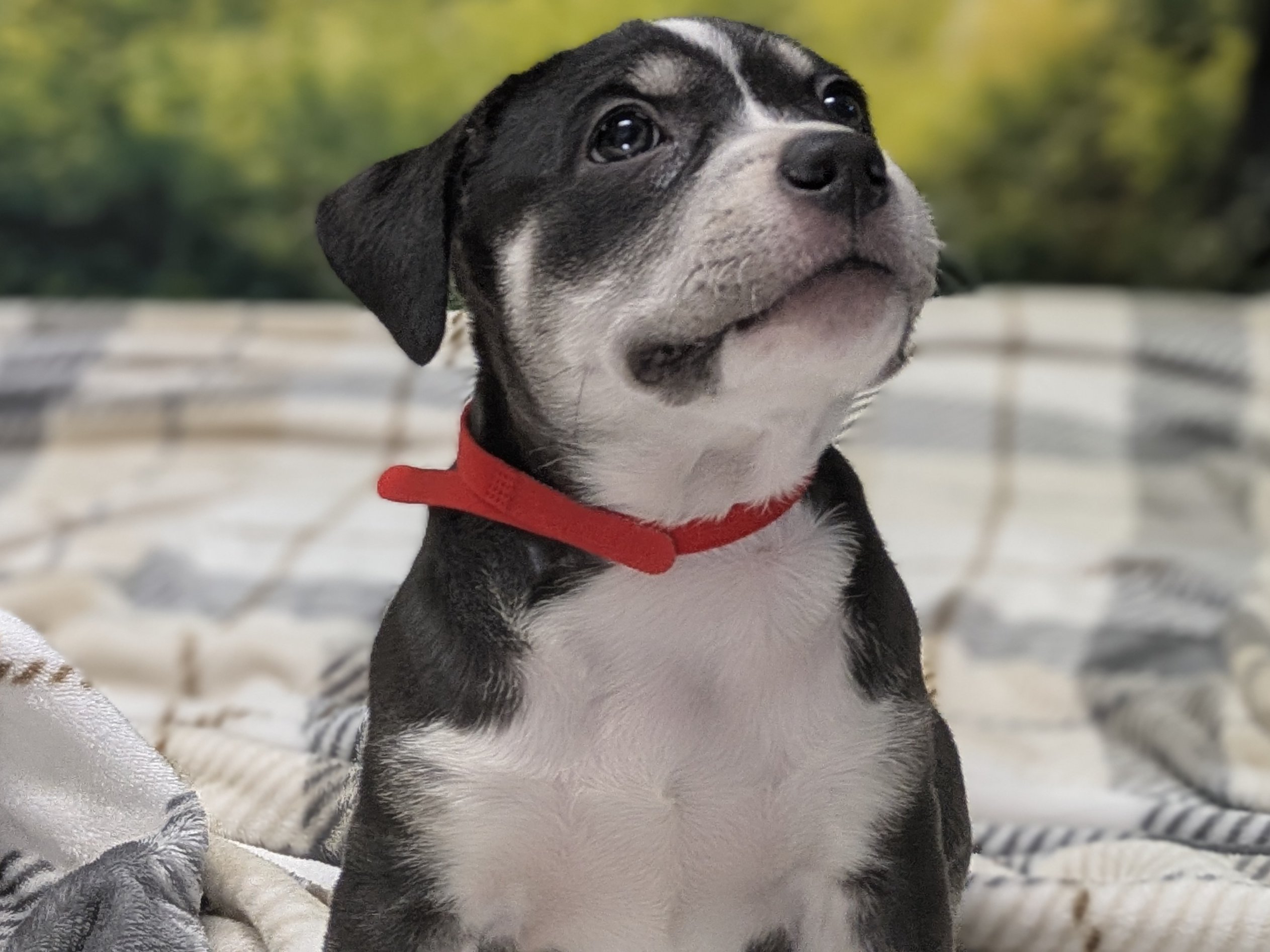 Please do not call the shelter; do the application first. When applying for one of the pups, please let us know your top 3-6 choices in order of preference, so we can match you to the pup closest to the top of your list. Introducing the Italian Renaissance litter! These adorable pups came in as a Stop the Cycle litter, and have been at the shelter since they were just 2 weeks old; they and their mom came in for care and socializing until the pups were weaned, now mom is spayed and back home (dad is scheduled for neuter, too, under our Stop the Cycle program). Photos of mom (black & white) and dad (brown) are at the end of the listing. Their owner says dad has some Weimaraner in the mix, but it doesn't show in appearance; these little meatballs all look like adorable pitties. One of the best parts about adopting a pup who has been at the shelter most of their lives: you know their ENTIRE HISTORY. You know they had all their age appropriate vaccines at the right times. You know they have been monitored to make sure all were eating and growing appropriately. You know they have met all sorts of different humans during their time at the shelter, and have been handled and loved since arrival. Yay! These pups are social and playful, and will make excellent family pets! We'd guess adult weights between 45 - 60 pounds, but as always with unknown mixed breeds, your puppy may vary! The litter includes (with their weight as of 4/9/26 - 7 weeks old): CATERINA female, grey & white 9.77# LUCREZIA female, white & black 8.92# COSIMO male, dark grey & white 10.67# MADDALENA female, brown & white 9.82# OLIMPIA female, dark grey & white 8.32# FRANCESCA female, black & white 9.04# Puppies require a lot of human interaction, and all puppies will benefit from obedience training and full immersion in their human household. These pups' ideal homes will have someone who can exercise them with a couple of energetic walks each day, plus commitment to training them how to be the best dogs they can be. They hope to have very few hours per day when they will be without the companionship of a human or other pet, and will reward their forever people with boundless love and loyalty! All pets arrive spayed/neutered, dewormed, microchipped and vaccinated. Adoption fee for Francesca is a suggested minimum of $175 (more gratefully accepted). All pets are placed with a 30-day money-back trial period, to give pet and family enough time to discover any unknown allergies or other conflicts. Can't come to Republic? Don't let that stop you! We have monthly transports to the Seattle area, delivering adopted pets to their new owners. If you can add a little to your donation to help us cover our volunteer driver's expenses, that would be great!